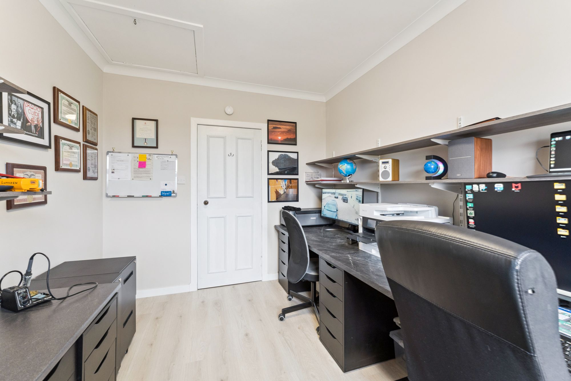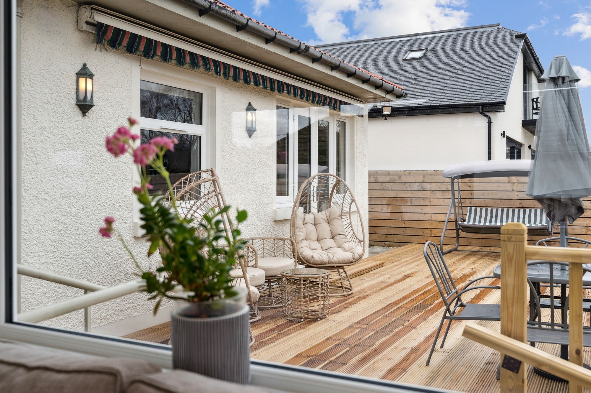The rear deck is complemented by an electric awning, creating a sheltered outdoor seating area ideal for year-round enjoyment. In addition, four cleverly installed external power sockets have been positioned around the garden, making it effortless to enjoy outdoor lighting, heating, cooking or entertainment systems. The garden perimeter is bounded by walling and new timber fencing, affording an excellent balance of privacy and enclosure.