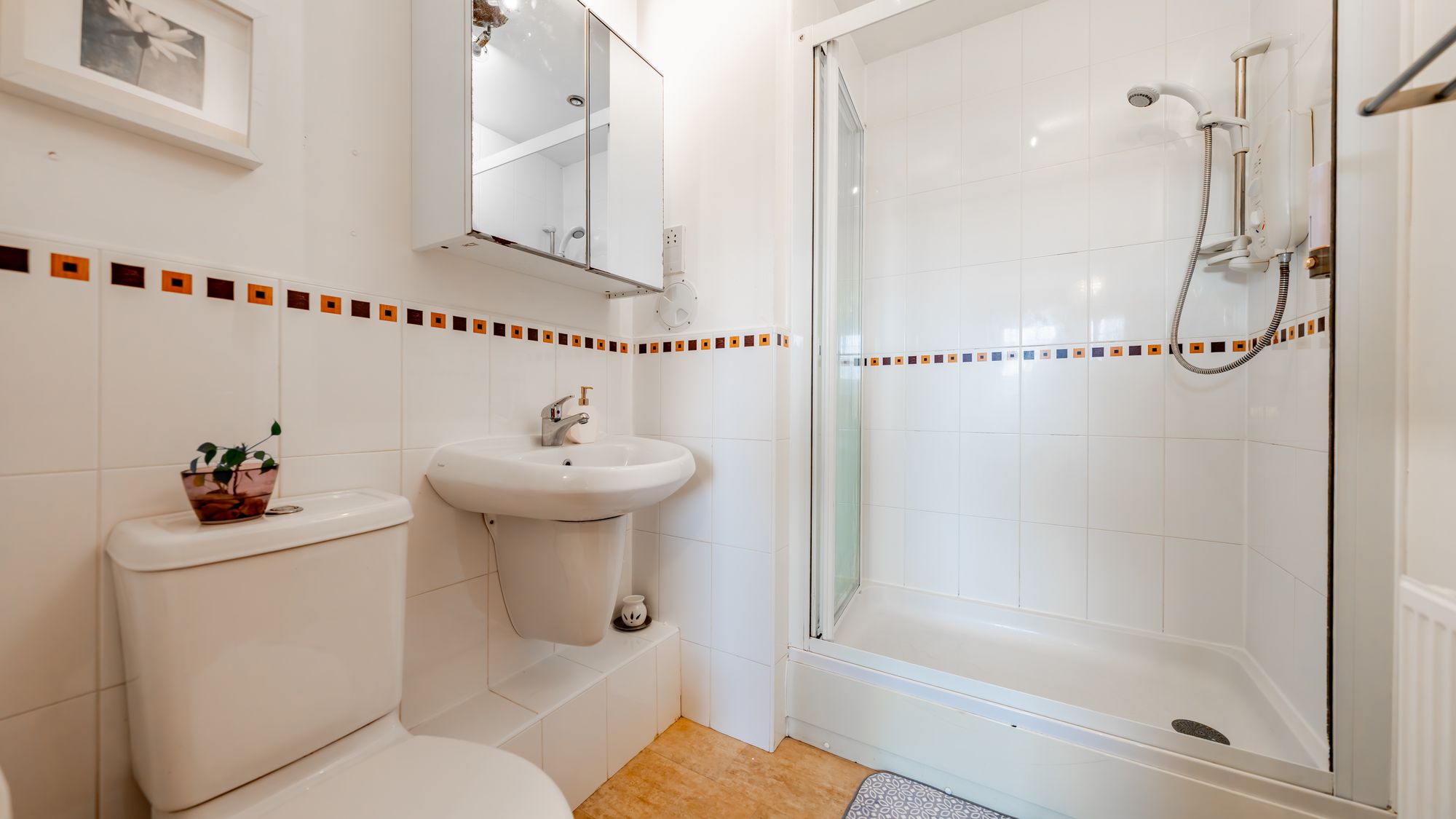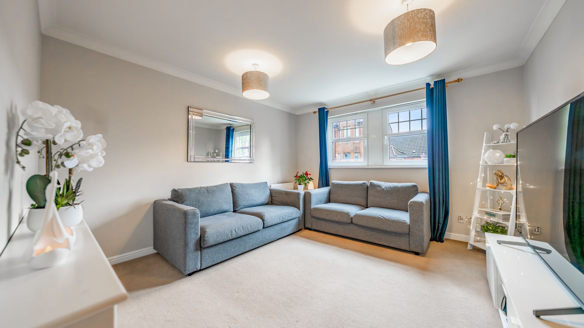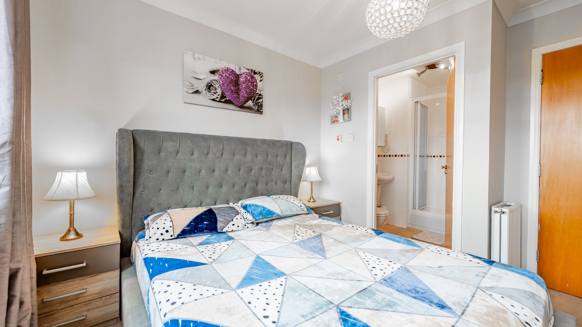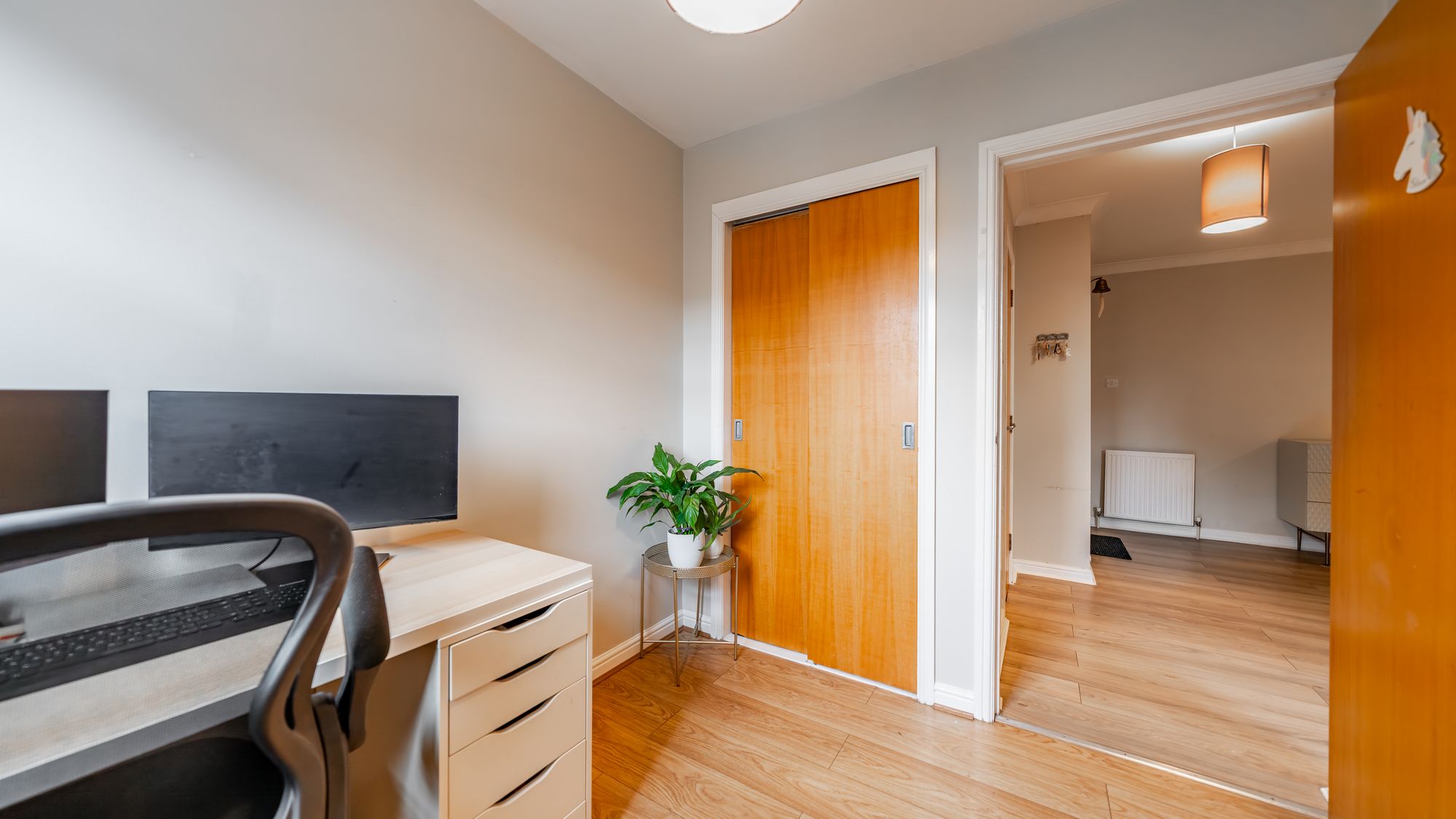 The impressive master bedroom features large built-in sliding wardrobes and a stylish en-suite shower room. A second double bedroom also benefits from fitted wardrobes, while the third bedroom offers integrated storage, making it perfect for use as a bedroom, home office, or nursery. A modern three-piece bathroom suite with shower over bath completes the accommodation.