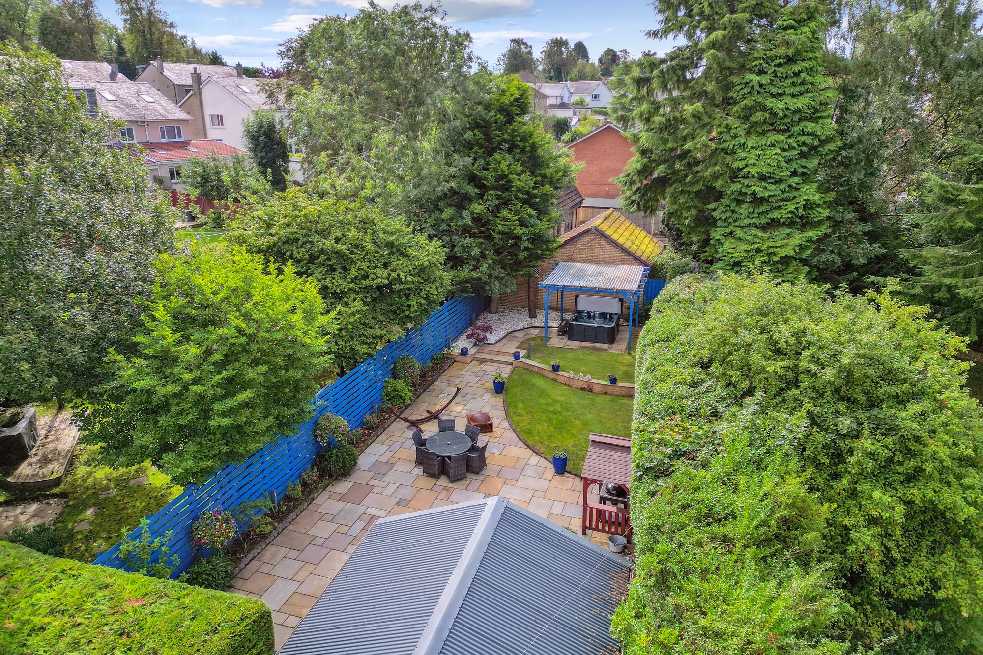 Accompanying the property is an extensive driveway leading to a detached garage. The south-facing rear garden is fully enclosed with a generous patio area, a decking , a central lawn and a covered area at the rear of the garden.