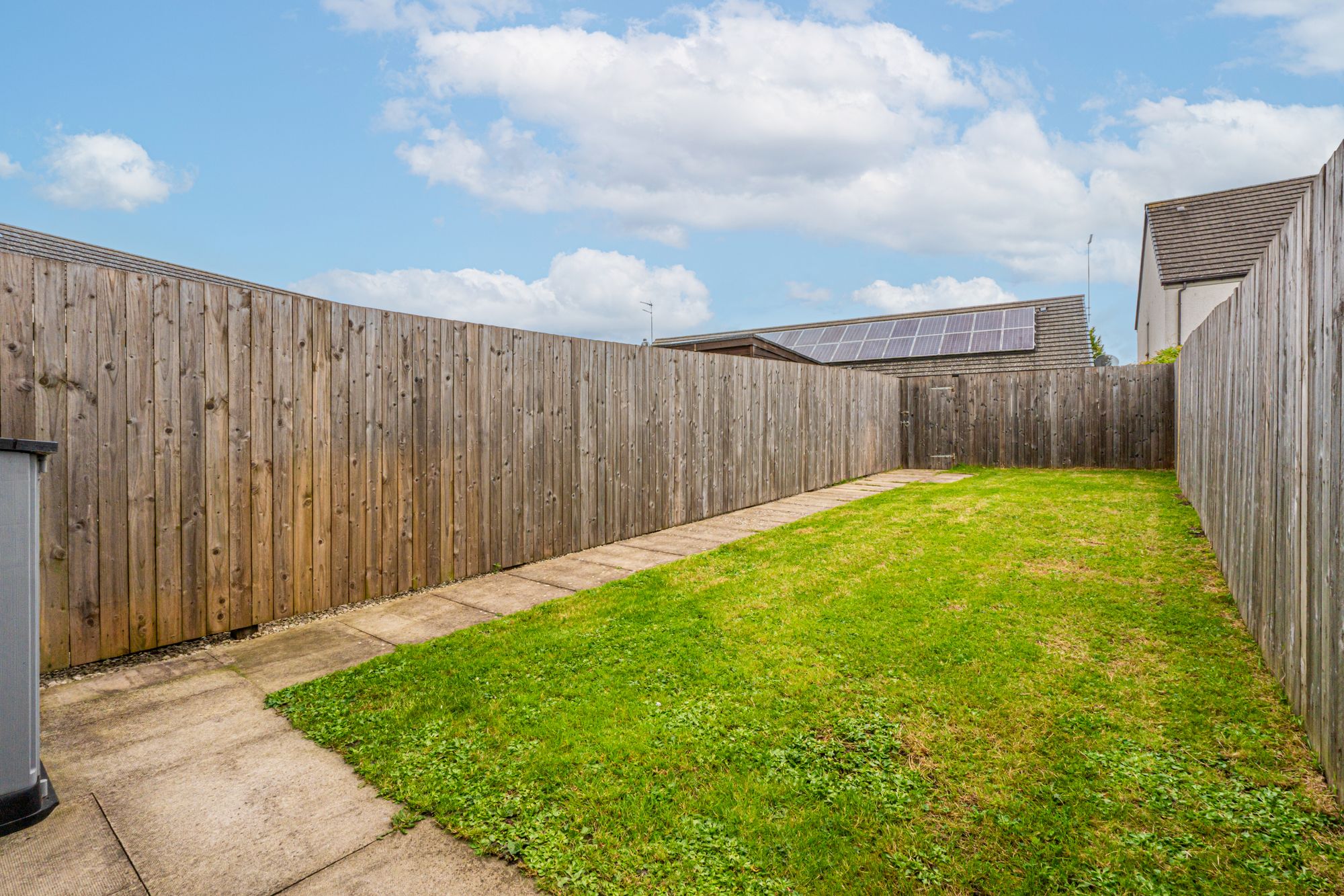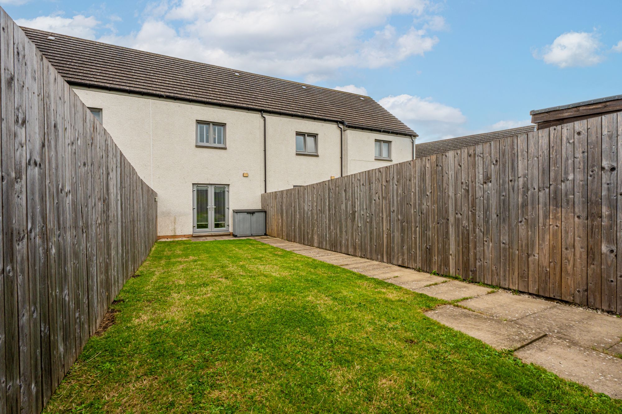 The property enjoys private garden grounds to both the front and rear, including a combination of lawn and paved areas, fully enclosed by timber fencing—ideal for outdoor use and low-maintenance upkeep. Two allocated car parking spaces are located to the front, offering added convenience.