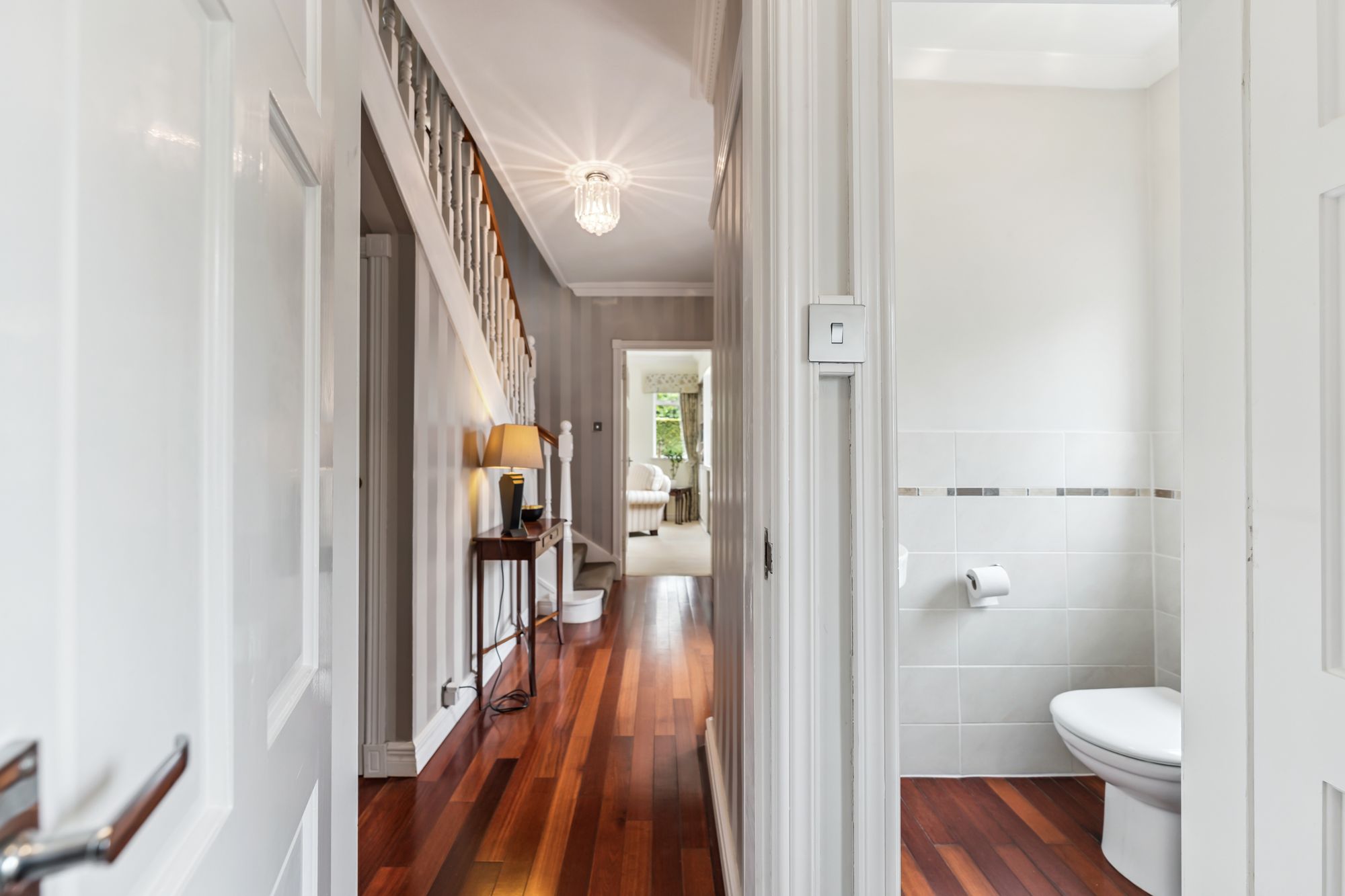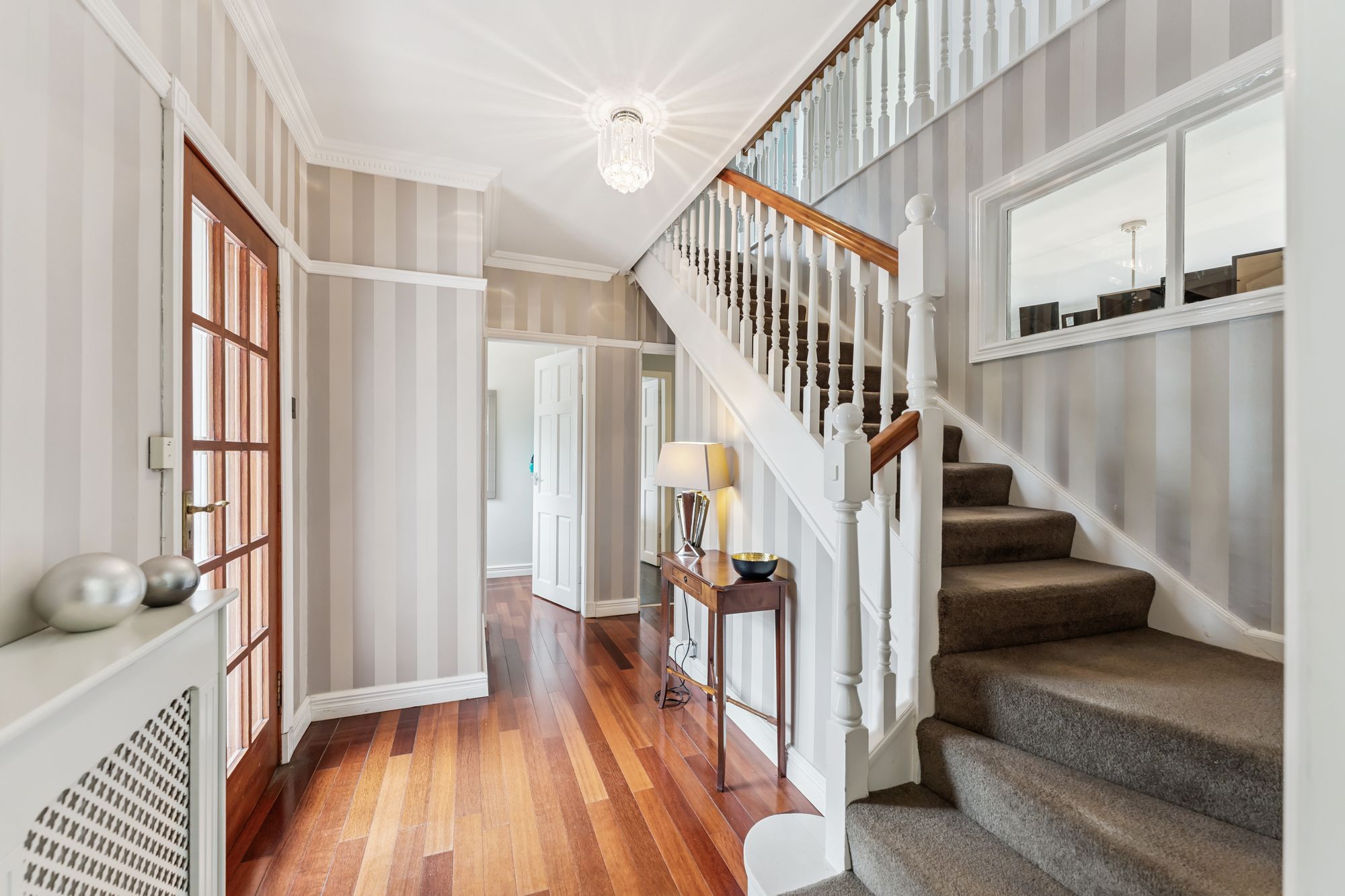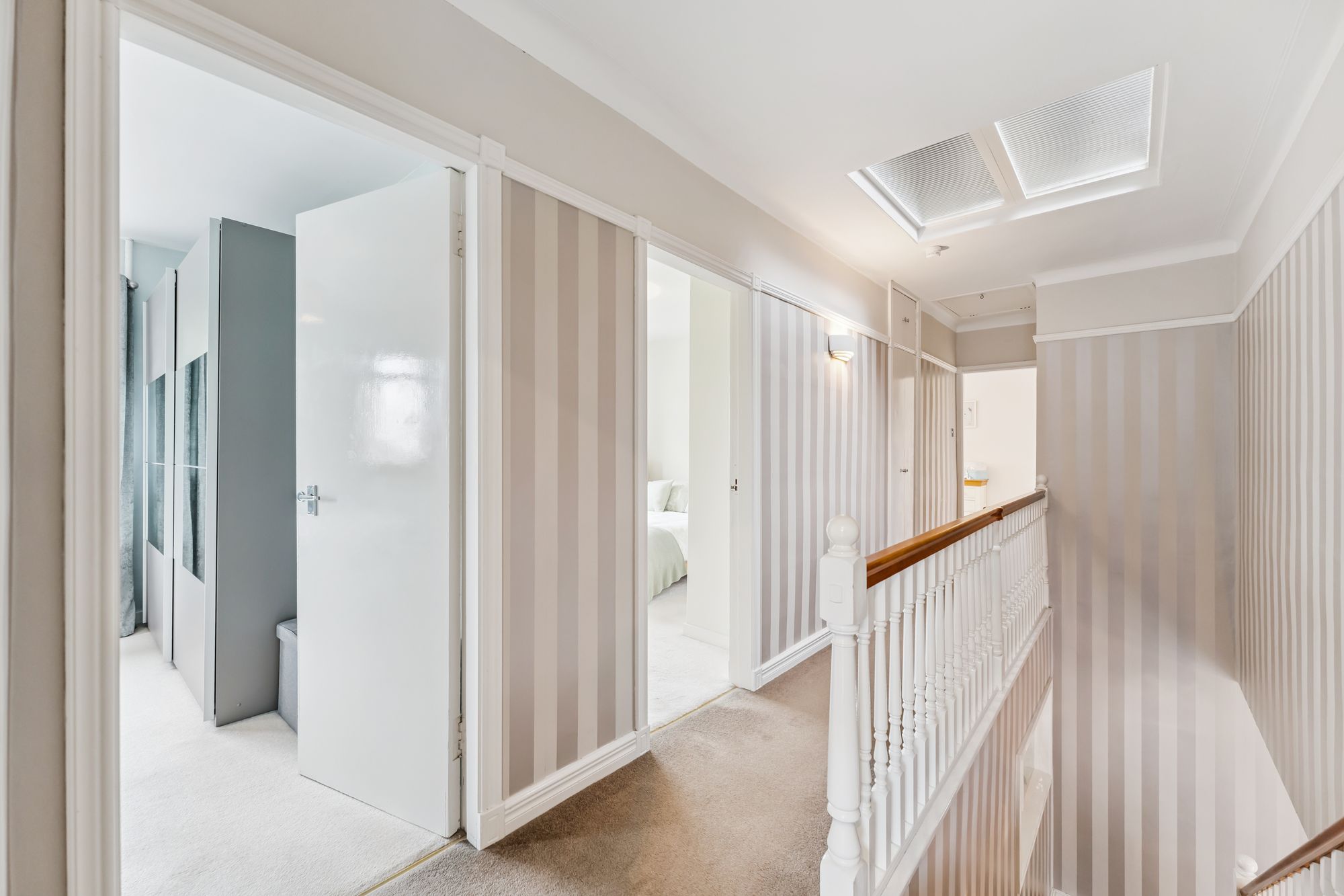 Upstairs, a generous landing leads to four double bedrooms. Bedroom two features an en suite, while the principal bedroom includes a walk-in dressing room that could also serve as a nursery. A well-appointed family bathroom completes the upper level.