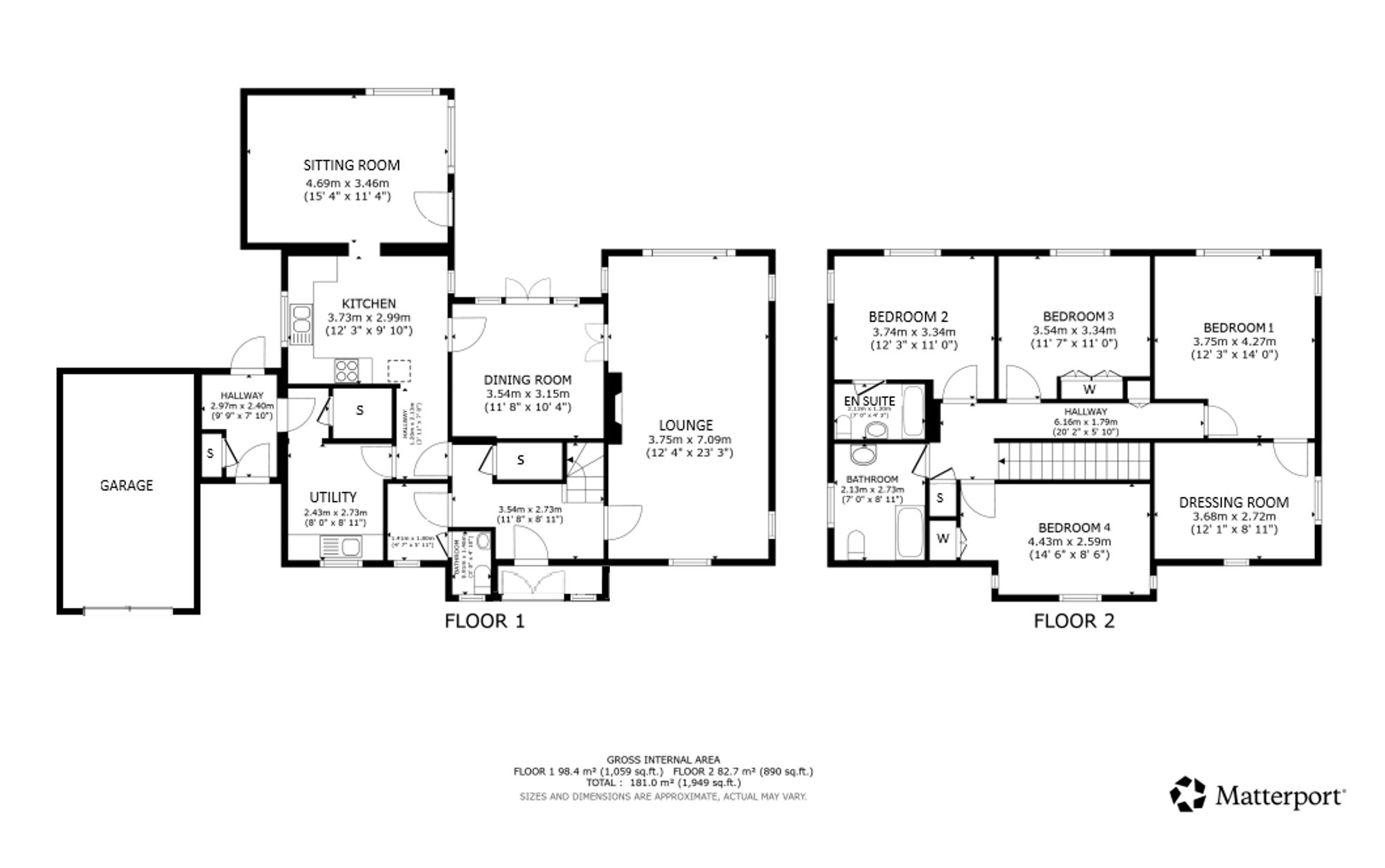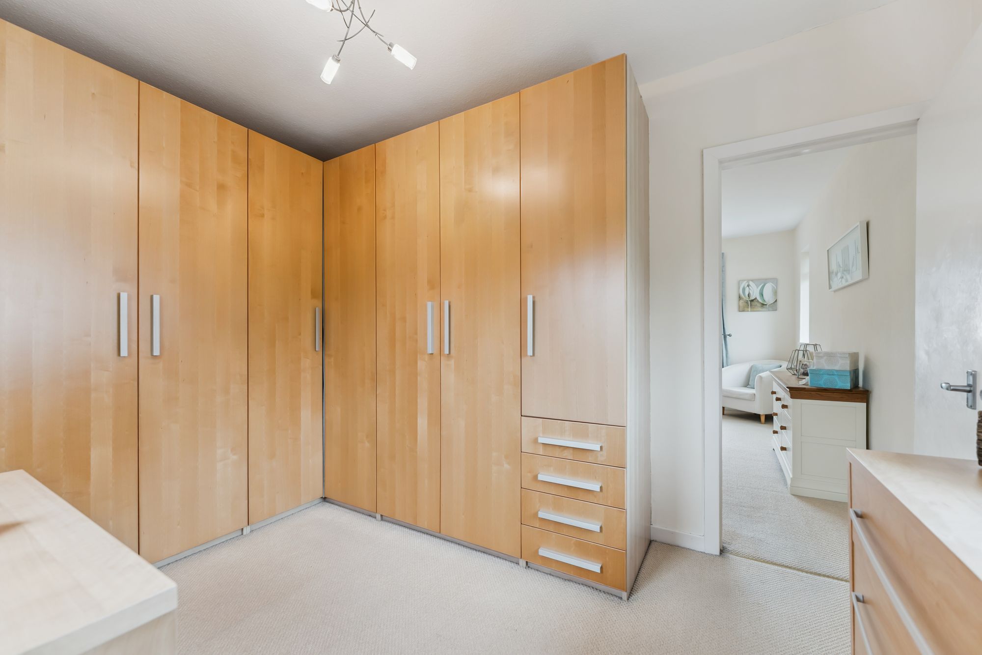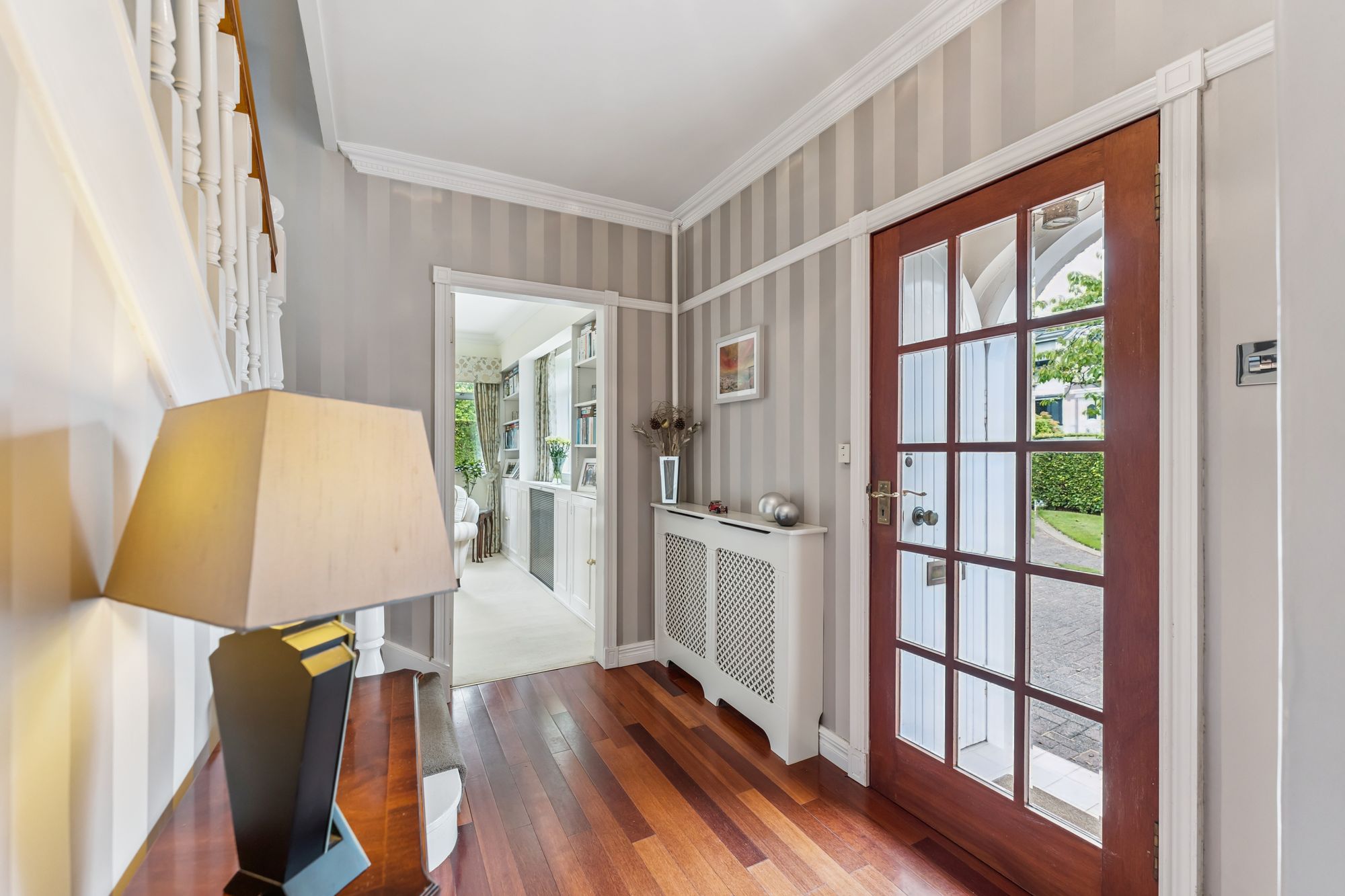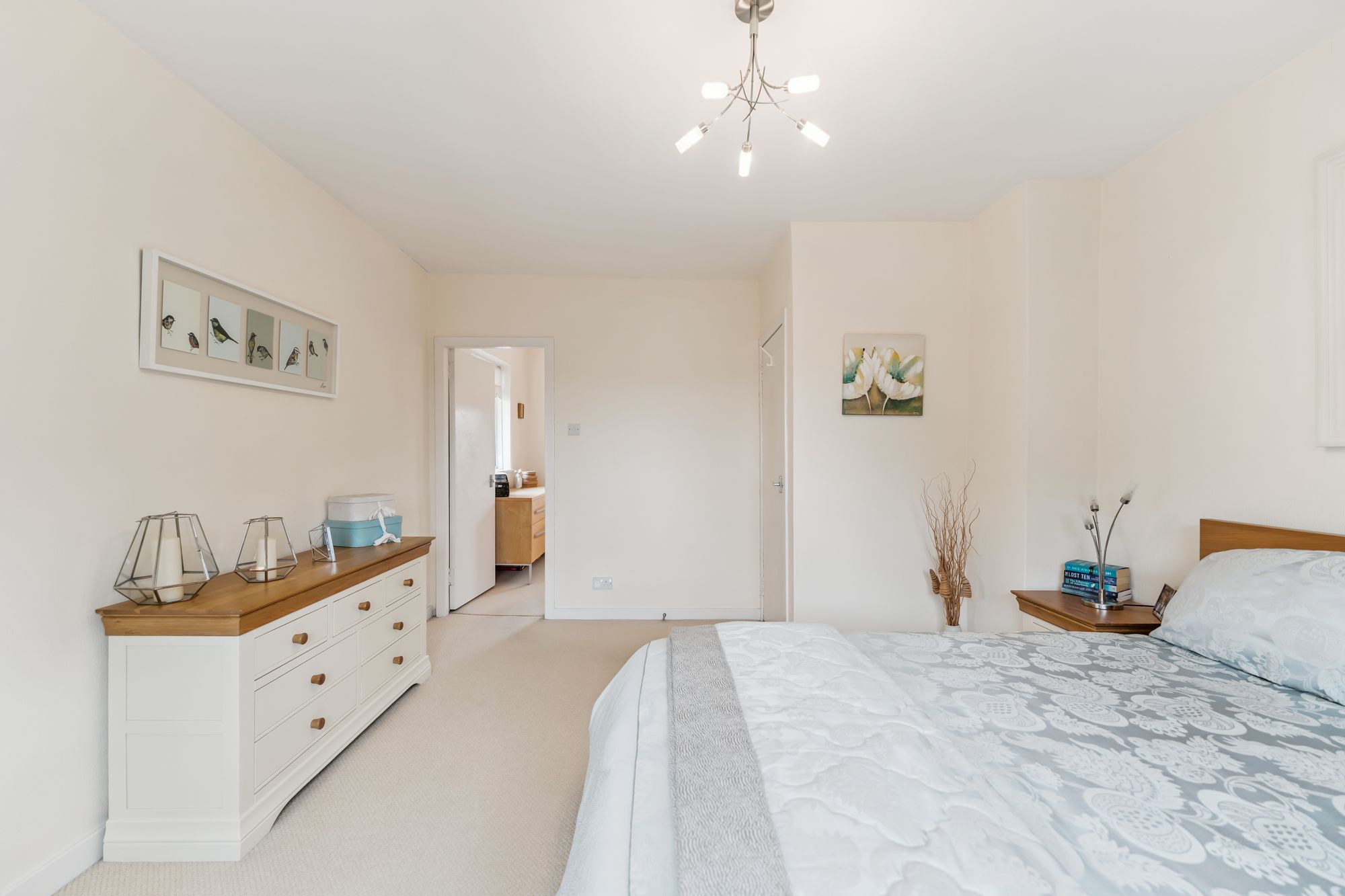 Upstairs, a generous landing leads to four double bedrooms. Bedroom two features an en suite, while the principal bedroom includes a walk-in dressing room that could also serve as a nursery. A well-appointed family bathroom completes the upper level.
