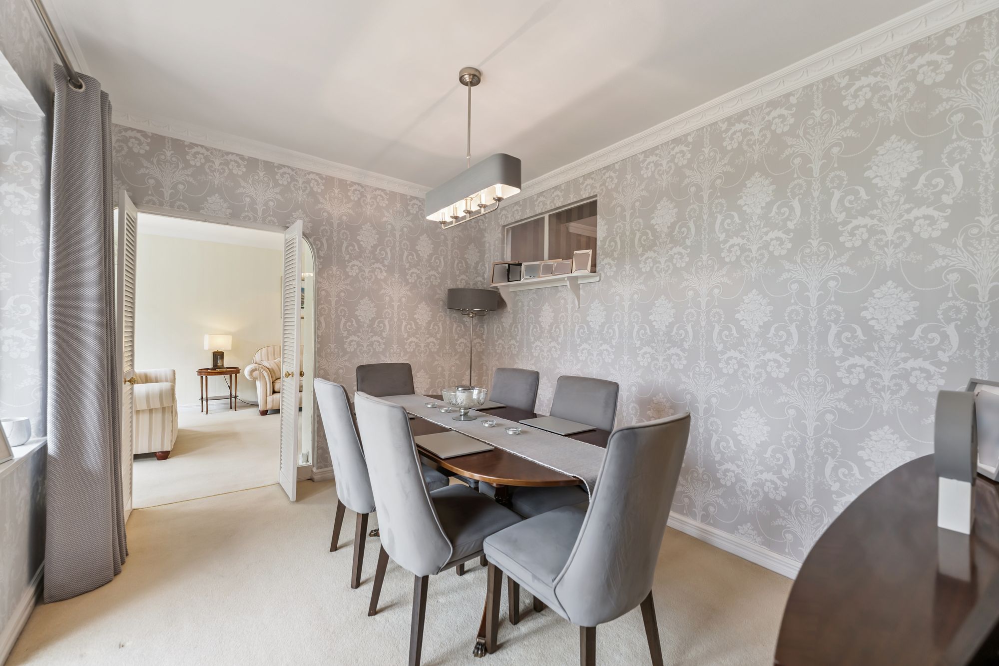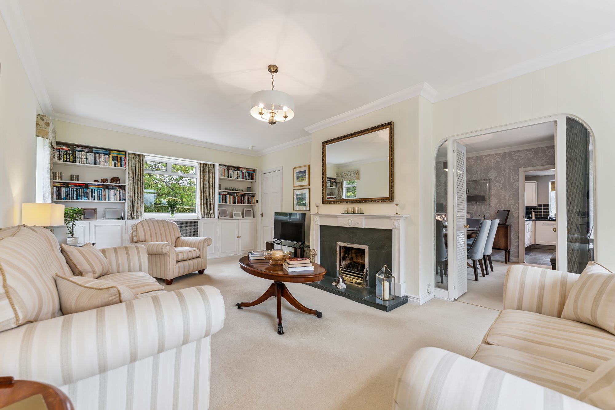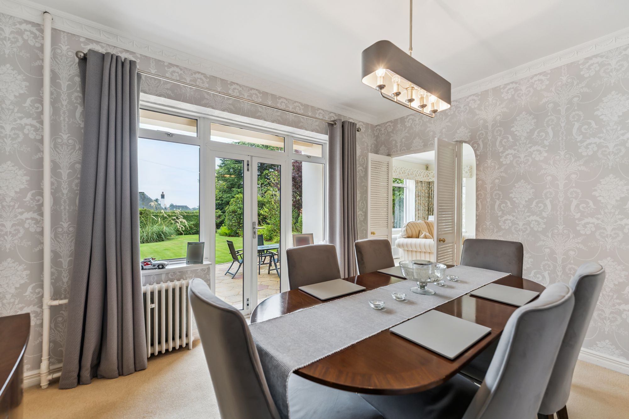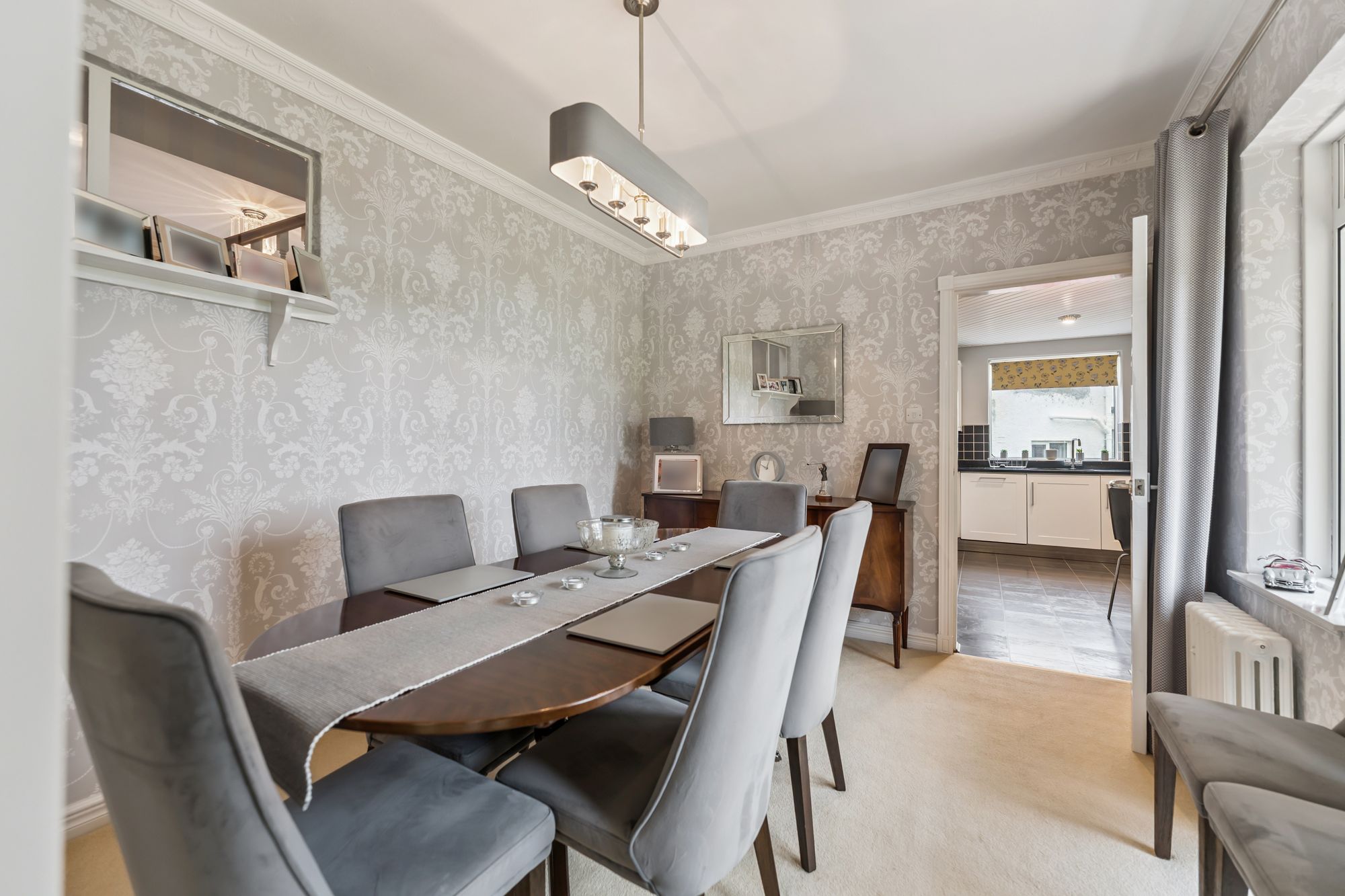 The interior offers bright, spacious and highly versatile accommodation across eight principal rooms. A warm and inviting reception hallway with under-stair storage, cloakroom and WC leads to a large formal lounge, where a picture window frames views of the garden and two additional windows bathe the space in natural light. A gas fire with elegant surround creates a cosy focal point for winter evenings. The lounge flows seamlessly into the dining room, which can be opened up for larger gatherings and features double doors onto the garden. From the lounge, a modern fitted breakfasting kitchen is equipped with an extensive range of wall and floor-mounted units and quality integrated appliances. The kitchen connects to a utility room with storage and boiler cupboard, which in turn provides access to an external hallway leading to the garden and the adjoining garage. A further sitting room, also reached from the kitchen, offers direct access to the garden, adding to the home’s flexibility.