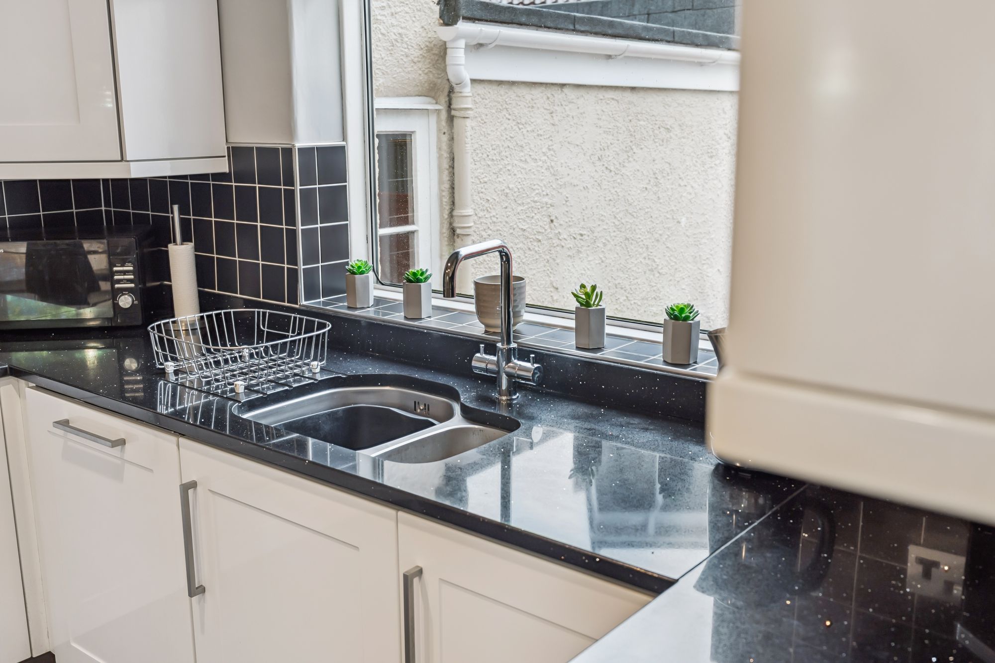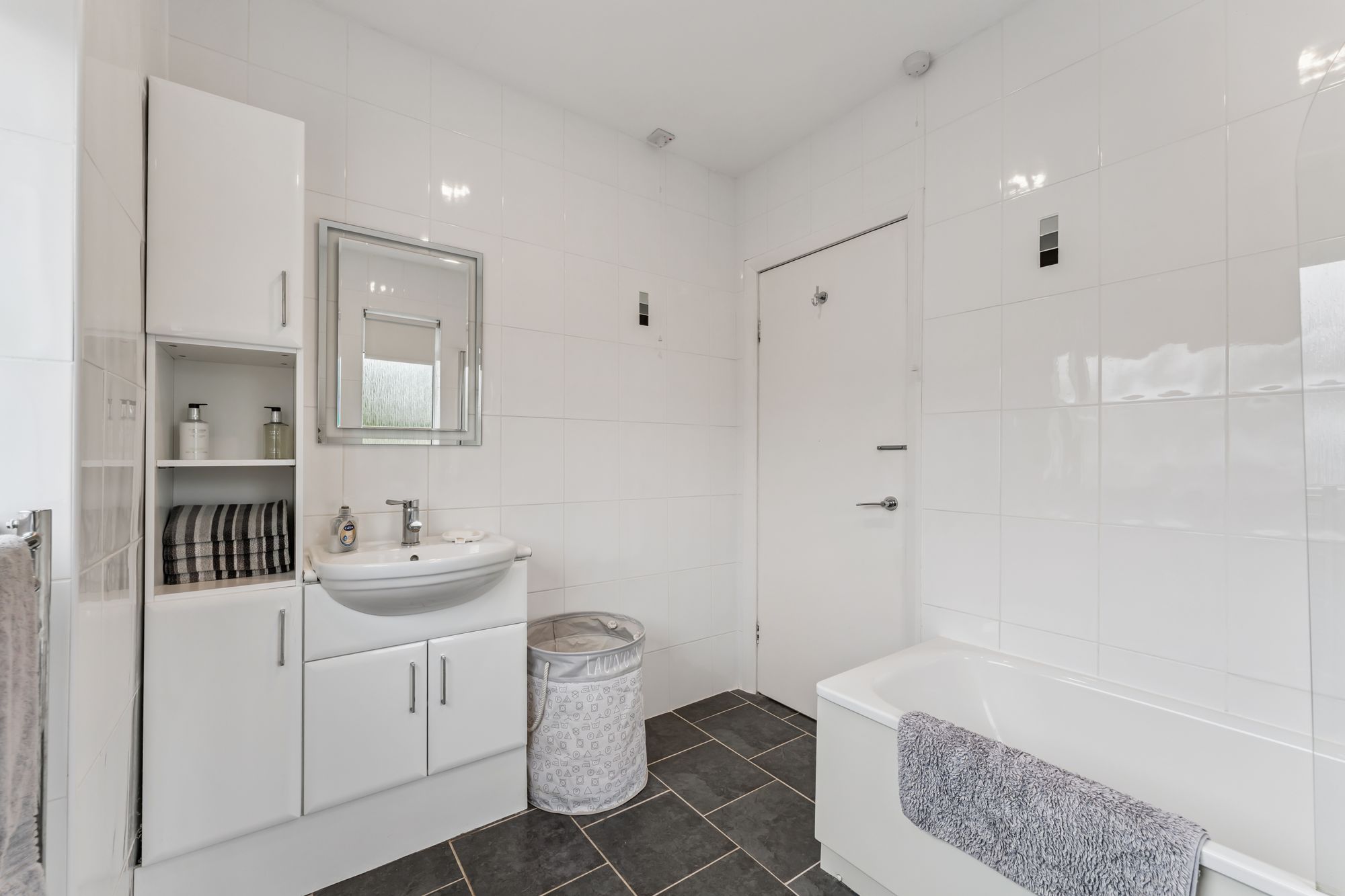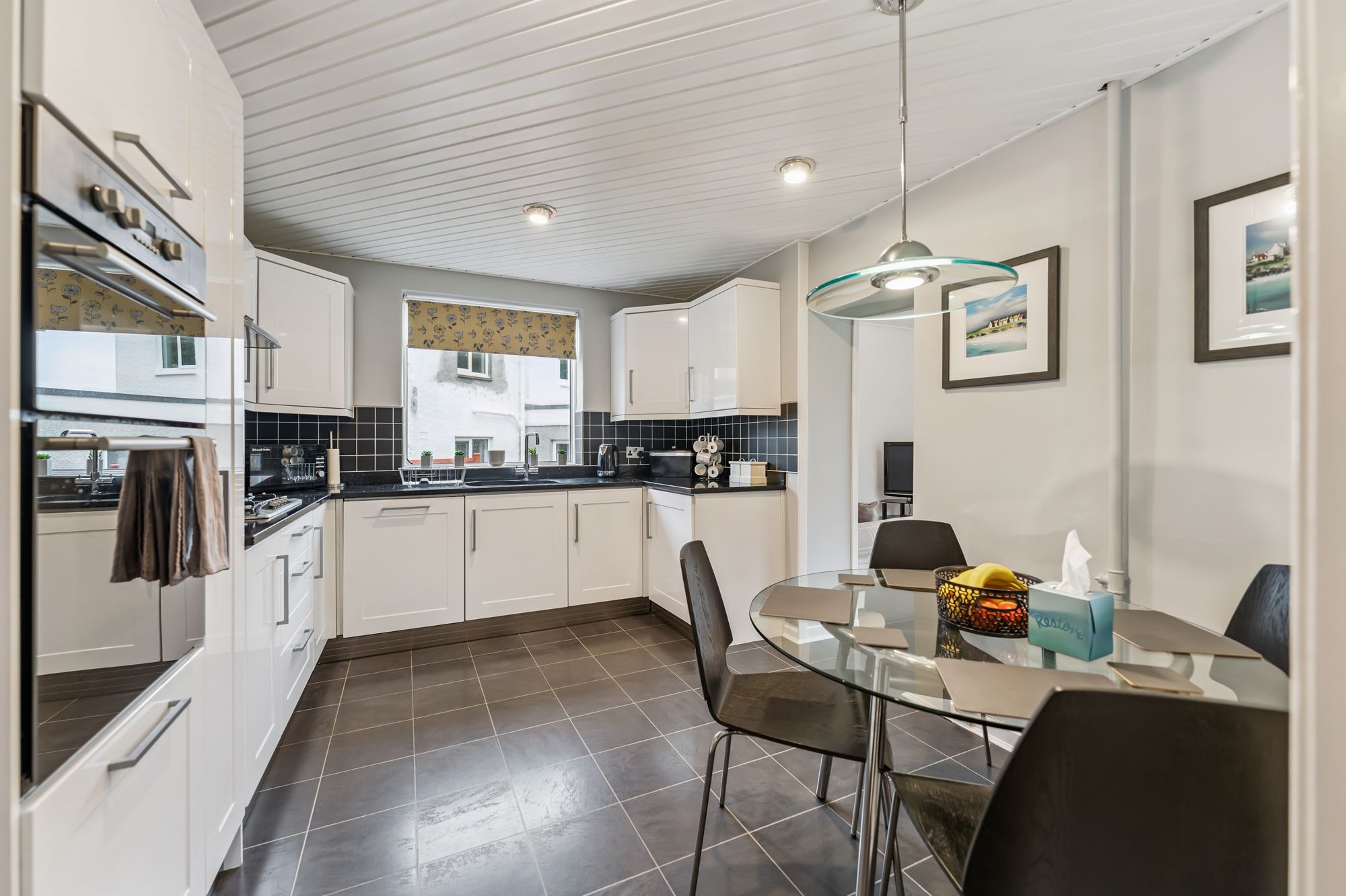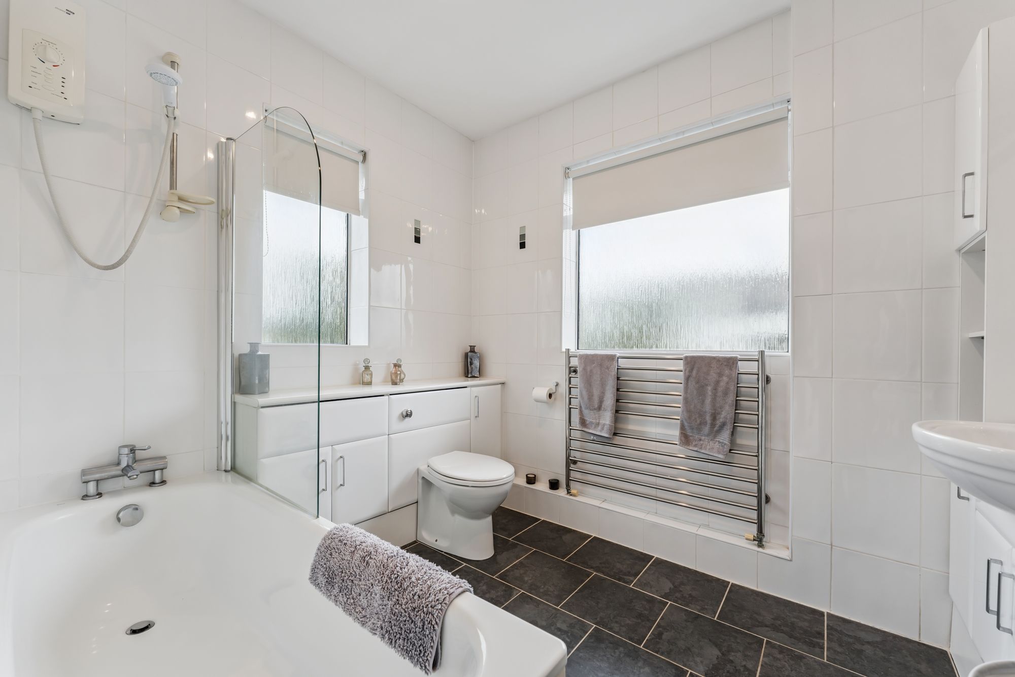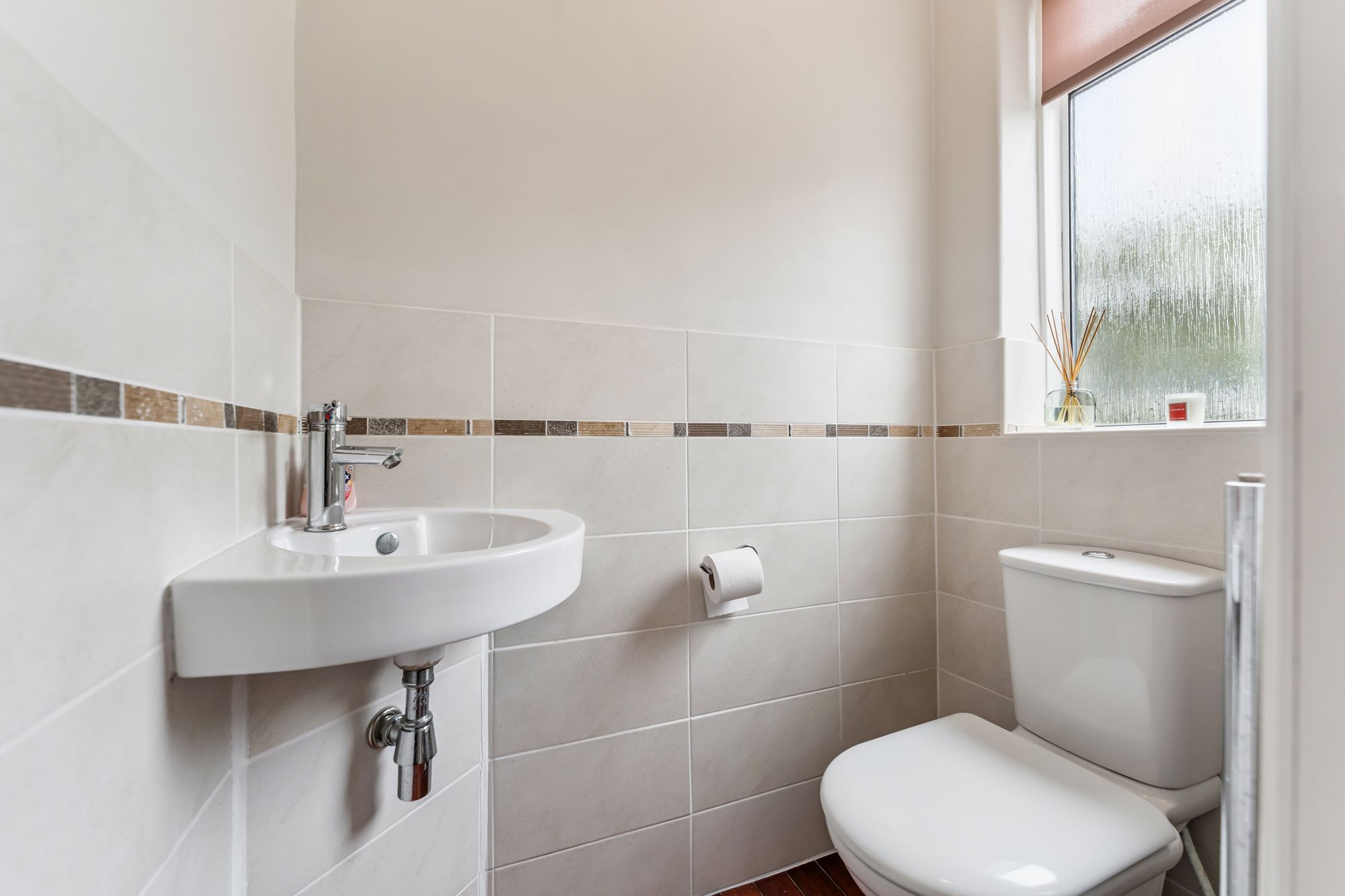 The interior offers bright, spacious and highly versatile accommodation across eight principal rooms. A warm and inviting reception hallway with under-stair storage, cloakroom and WC leads to a large formal lounge, where a picture window frames views of the garden and two additional windows bathe the space in natural light. A gas fire with elegant surround creates a cosy focal point for winter evenings. The lounge flows seamlessly into the dining room, which can be opened up for larger gatherings and features double doors onto the garden. From the lounge, a modern fitted breakfasting kitchen is equipped with an extensive range of wall and floor-mounted units and quality integrated appliances. The kitchen connects to a utility room with storage and boiler cupboard, which in turn provides access to an external hallway leading to the garden and the adjoining garage. A further sitting room, also reached from the kitchen, offers direct access to the garden, adding to the home’s flexibility.