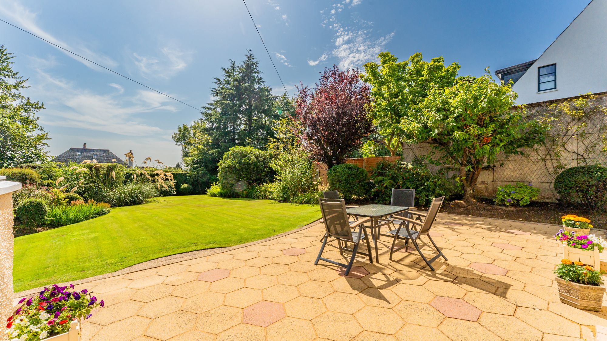 Additional benefits include gas central heating and double glazing. Outside, the south-facing garden is a standout feature, laid mainly to lawn and bordered by a beautiful variety of mature shrubs and herbaceous plants, all framed by a neatly kept hedge. A large sun patio offers the perfect setting for outdoor dining, barbecues or simply relaxing in the sun. To the front, an in-and-out monobloc driveway provides ample off-street parking and leads to the attached garage with up-and-over door.