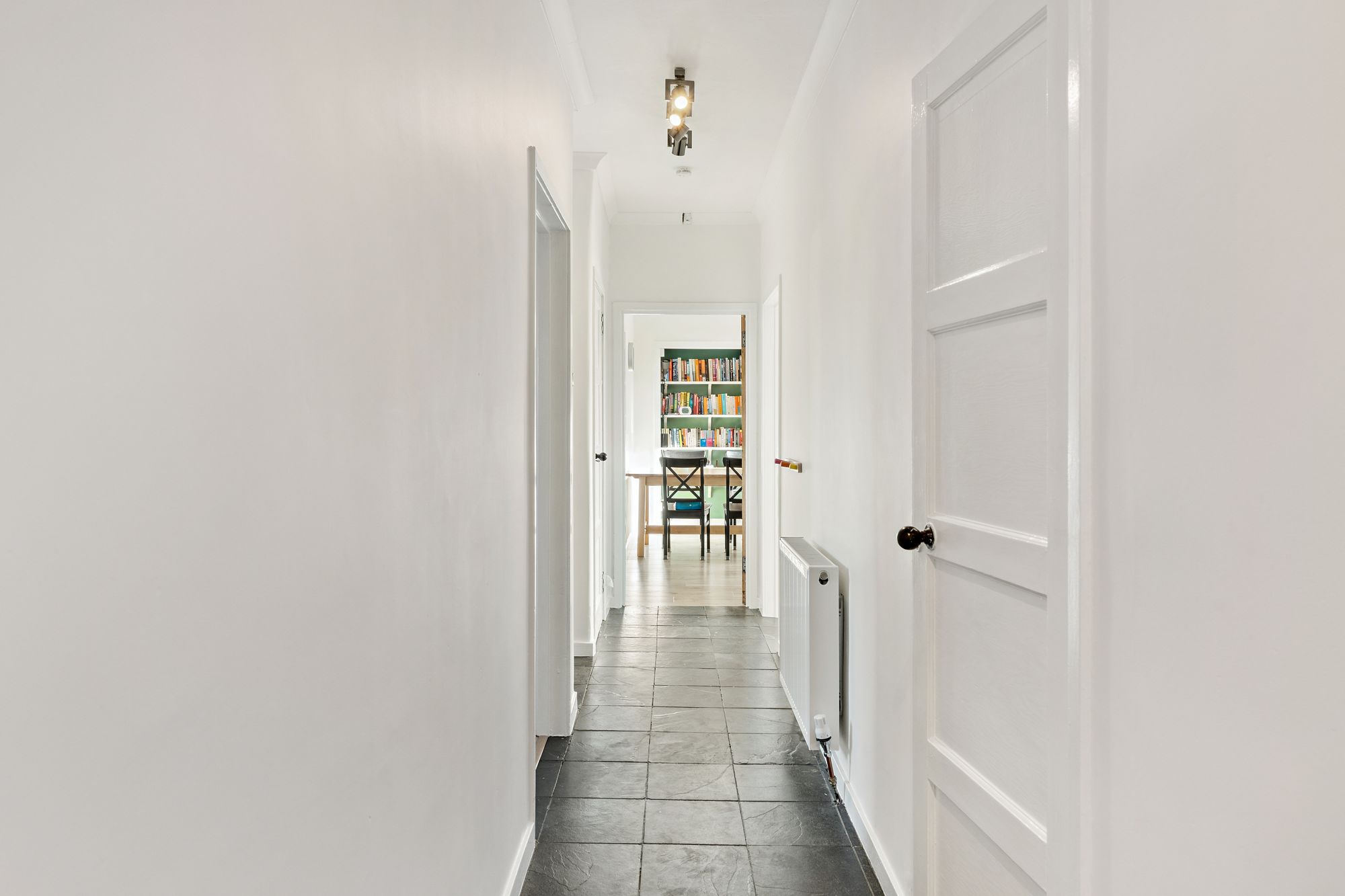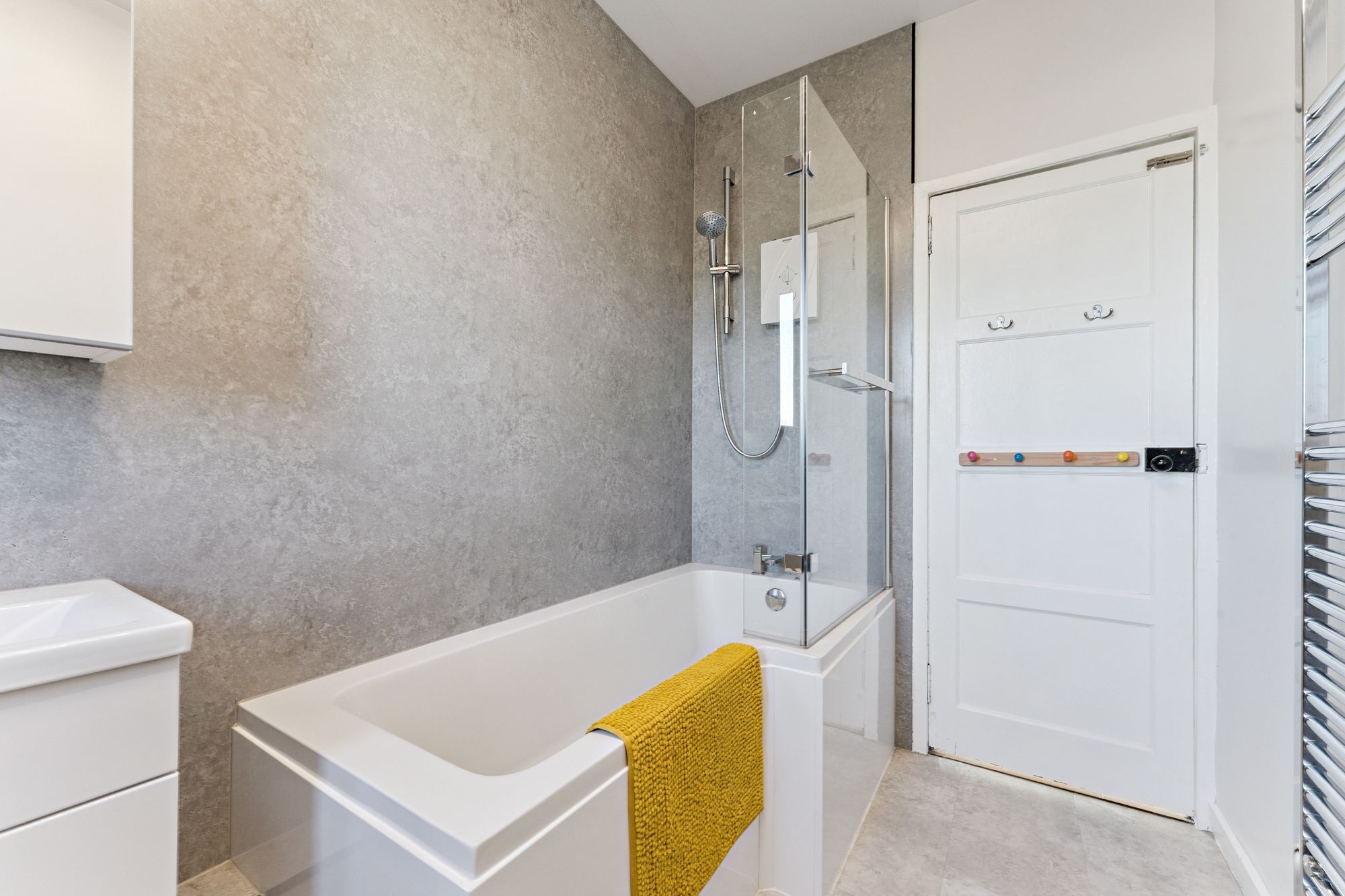 The home is entered via a welcoming vestibule that leads into the private stairway providing access to the hallway with a generous storage cupboard. To the front of the property is a bright and comfortable lounge, and three well-sized double bedrooms, each with fitted wardrobes. The contemporary kitchen, accessed via the lounge, is fitted with sleek satin cabinetry and a contrasting dark work surface. A newly fitted family bathroom completes the main internal accommodation, featuring a neutral three-piece suite with bath and over-bath shower.