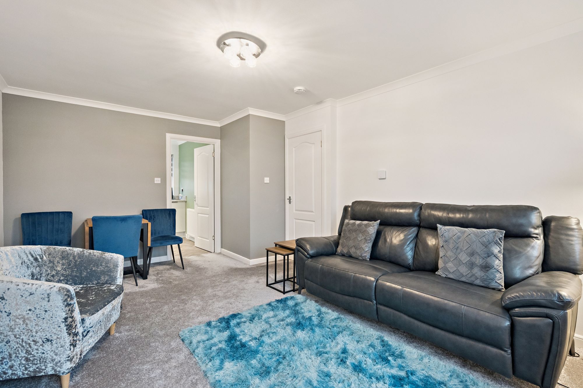 The property benefits from its own private front door, with a staircase leading to the main accommodation on the first floor. A welcoming landing provides access to all apartments, including a bright and generously proportioned lounge offering ample space for both living and dining furniture. The separate kitchen is fitted with a range of base and wall-mounted units and providing a practical and functional workspace.