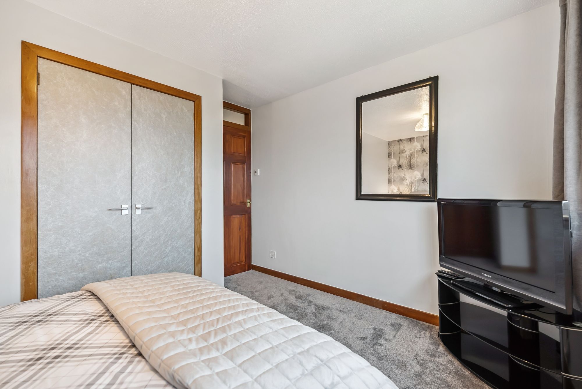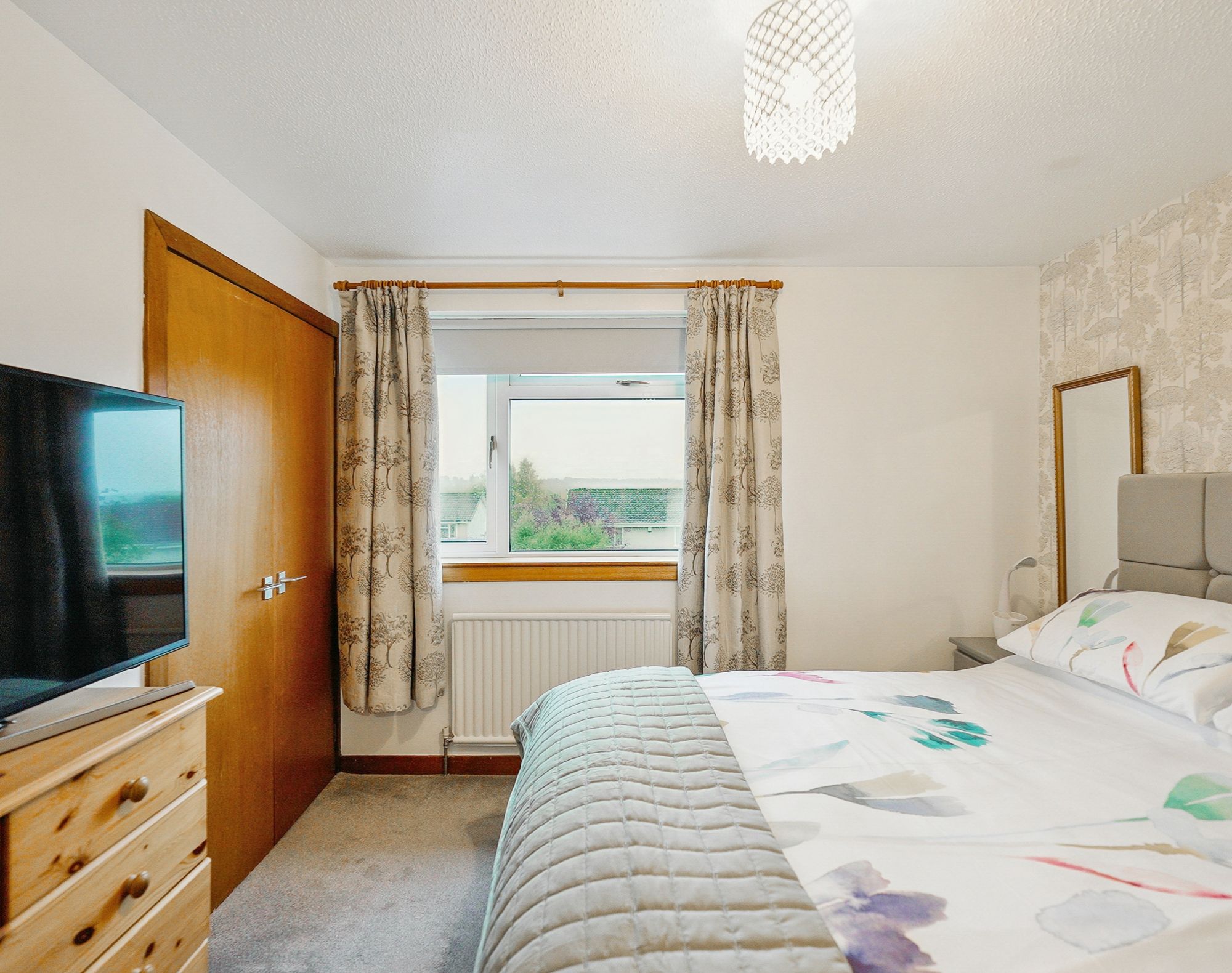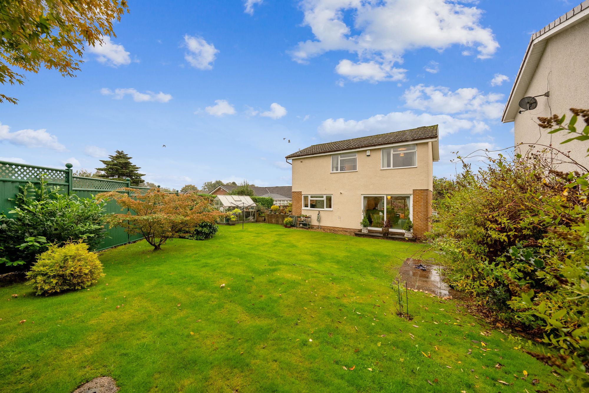 The rear garden is laid to lawn and surrounded by mature trees and shrubs, offering privacy and a peaceful outlook. A greenhouse and shed are also included, ideal for gardening enthusiasts.