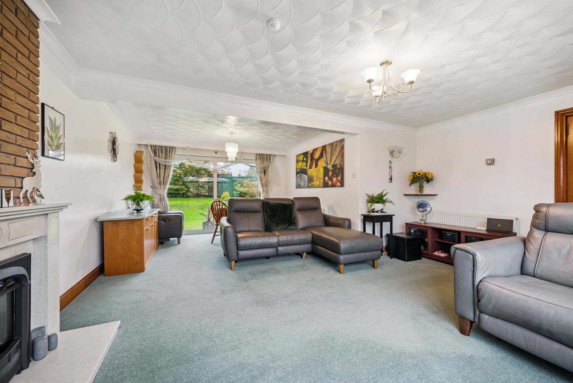 A monoblocked driveway provides off-street parking and leads to the double garage. The front garden features a neat lawn bordered by mature trees and shrubs, with steps rising to the main entrance. To the side, a generous patio area offers the perfect setting for outdoor entertaining and leads through to the rear garden. Additional steps provide access to the garage roof, offering potential for further use.