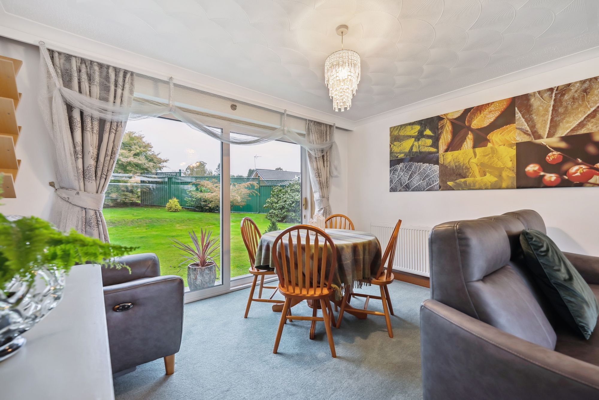 Inside, the home opens with a spacious entrance vestibule, ideal for coats and shoes, which leads through to a welcoming hallway. From here, you will find a bright and airy open-plan lounge and dining area, enhanced by large full-length windows to both front and rear, flooding the space with natural light. Sliding glass doors from the dining area provide access to the back garden.