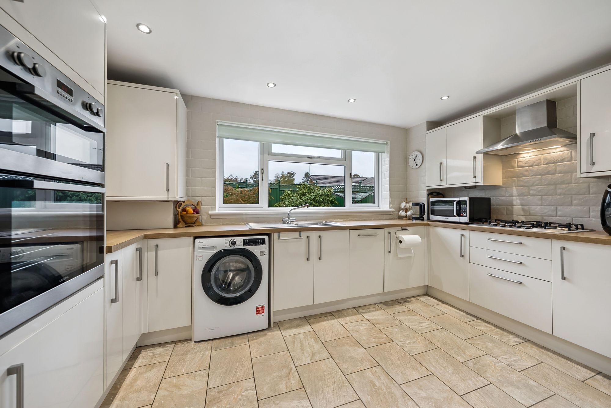 The modern contemporary kitchen is fitted with cream gloss cabinets and integrated appliances including a double oven, five-burner hob, and dishwasher. A rear door offers direct garden access. Additional ground floor features include a handy under stair storage cupboard and a convenient downstairs WC.