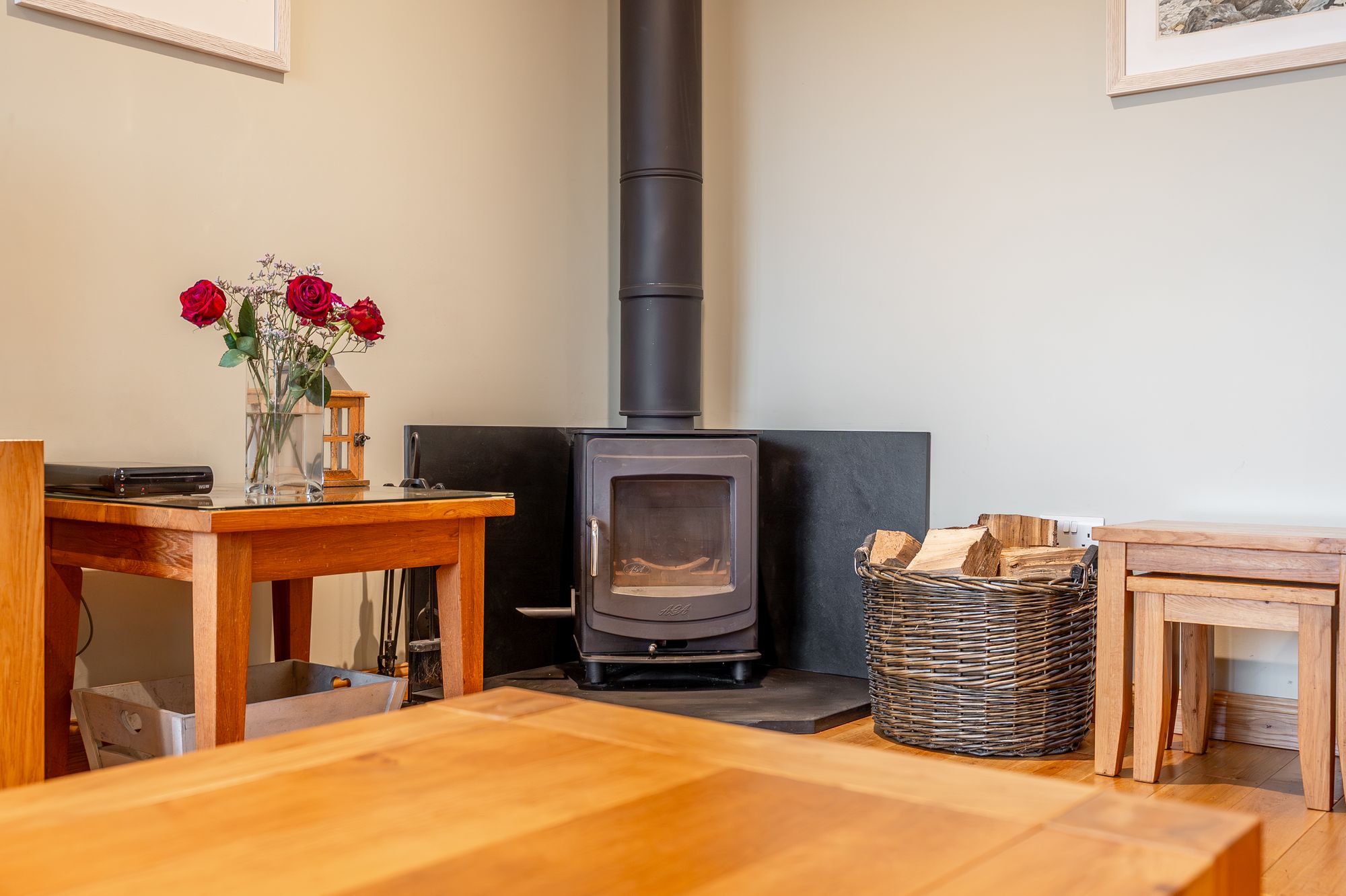 Entrance vestibule; welcoming hallway with stairs to the upper level; spacious front lounge with log-burning stove and dual-aspect windows; large open-plan dining kitchen fitted with a range of high-quality cabinetry and a selection of premium integrated appliances, including a fantastic electric-powered Everhot range cooker; ground-floor bedroom with smart en-suite shower room; and a handy downstairs W/C.