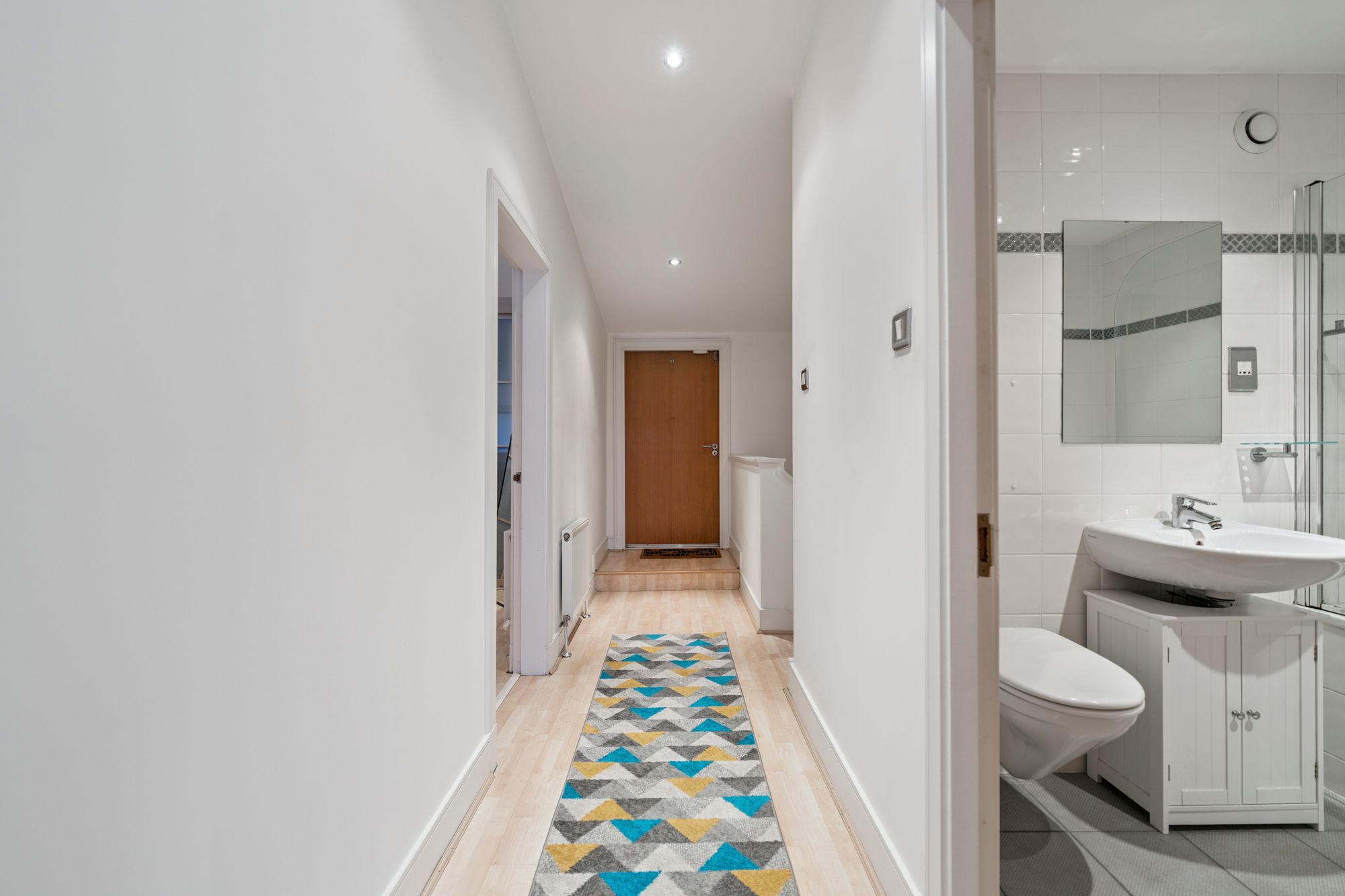 There are three generously proportioned bedrooms, including a principal bedroom with en-suite shower room. The accommodation is completed by a family bathroom with shower over bath, and an impressive roof terrace offering both private sections and access to a large communal square.