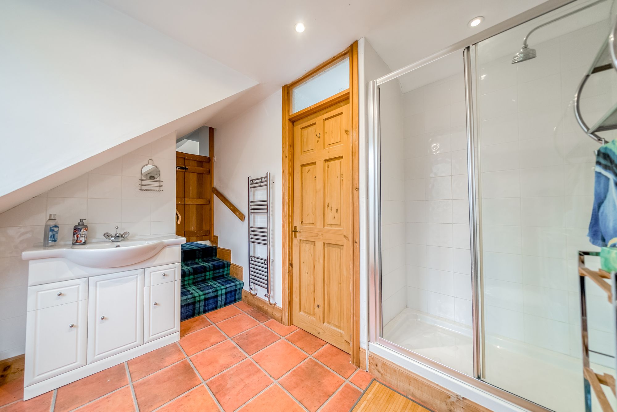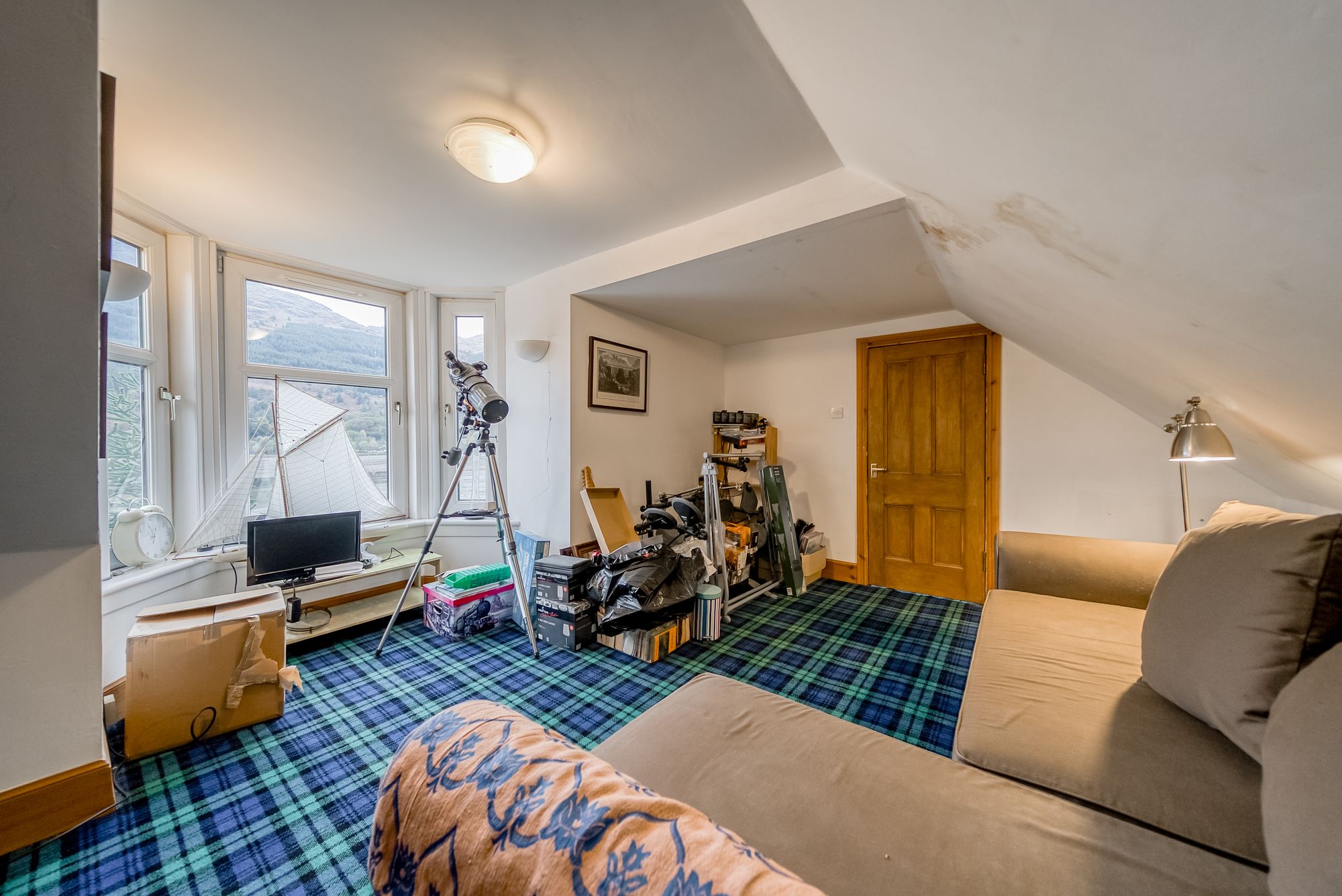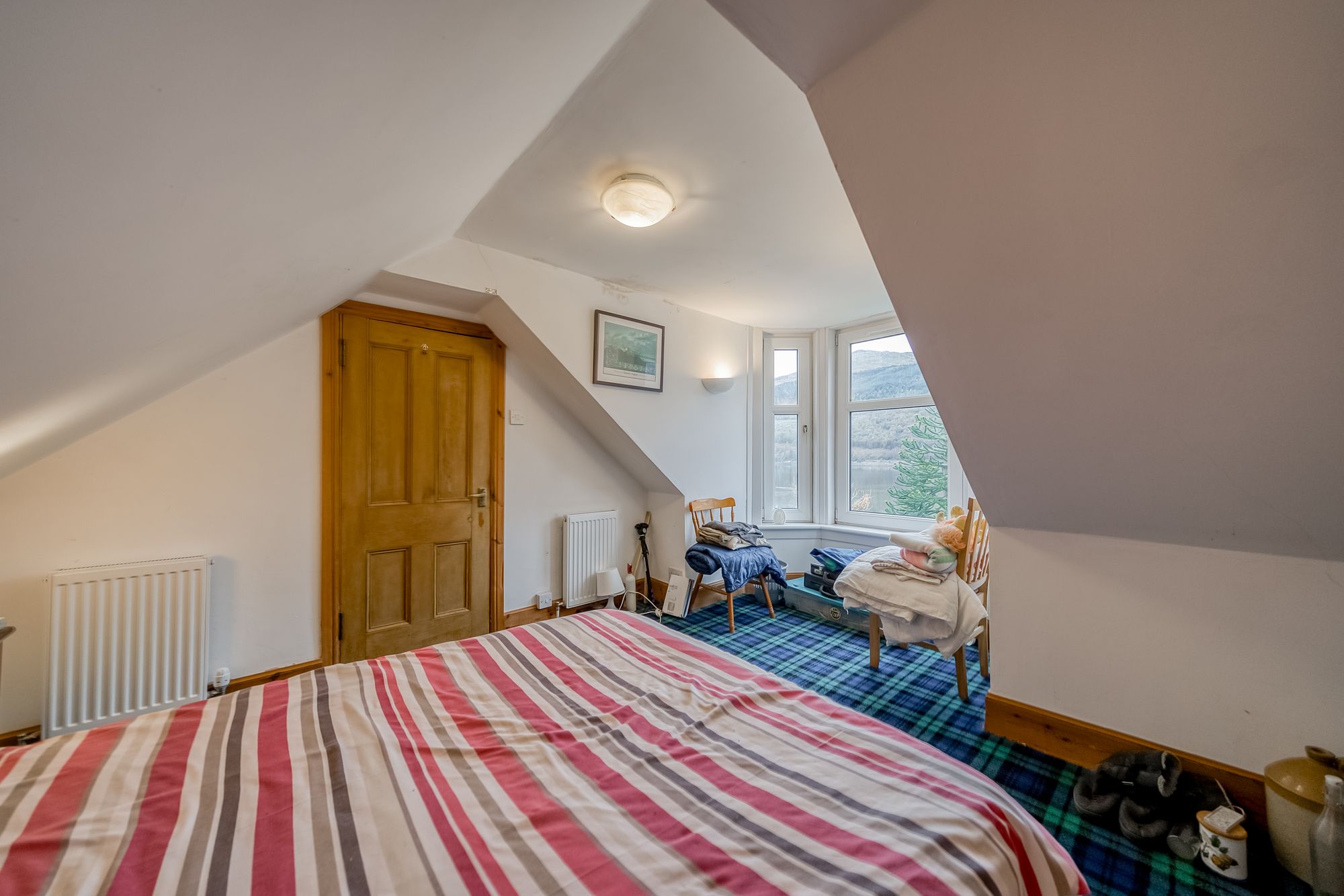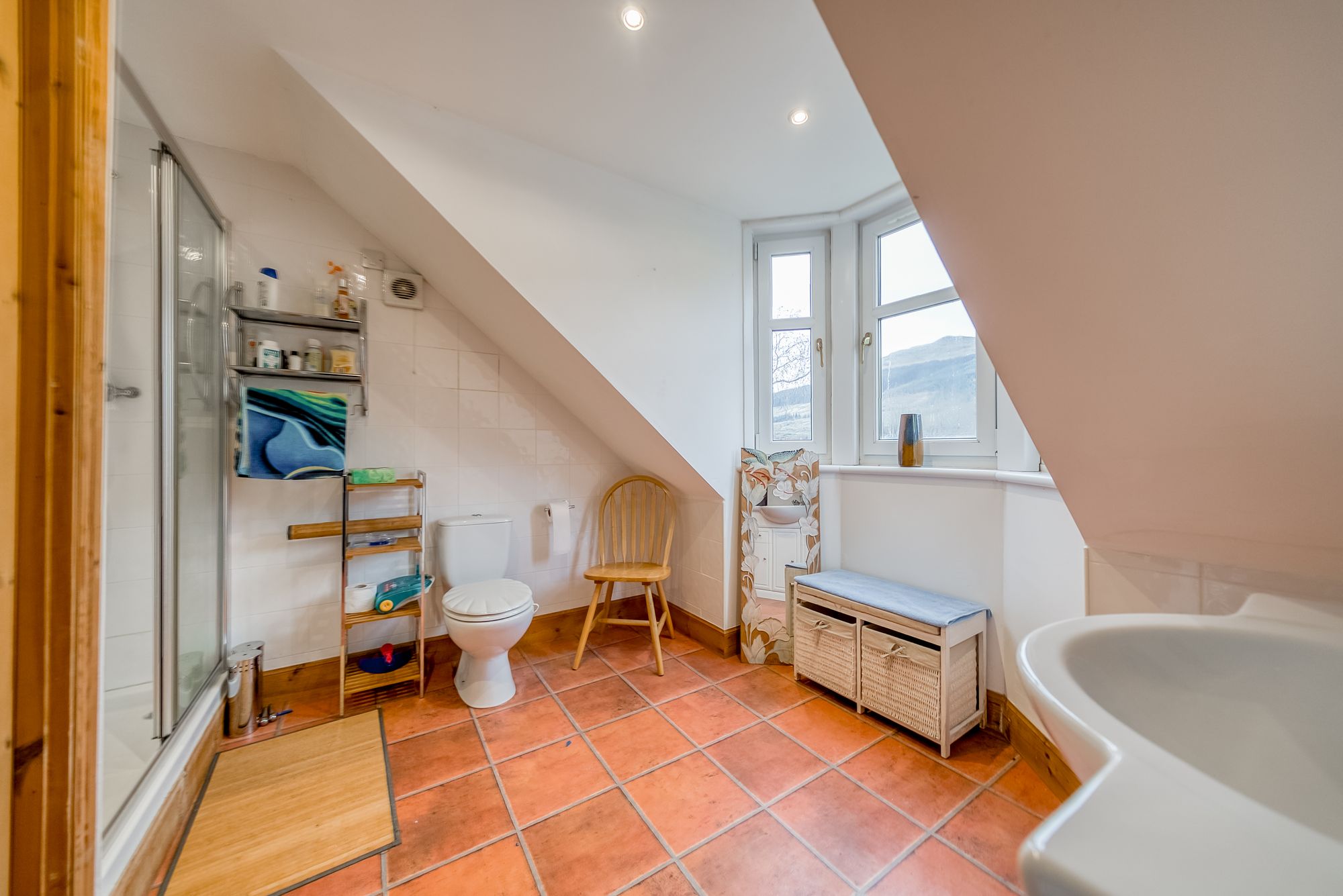 The ground floor of this charming property welcomes you through an inviting entrance hall that sets the tone for the rest of the home. A bright and spacious lounge opens directly onto a balcony, the perfect place to relax and take in the stunning panoramic views across the loch. The lounge retains much of its traditional character, including a feature fireplace in the lounge with a timber mantelpiece and wood-burning stove, The generously sized dining kitchen combines style and practicality, featuring quality cabinetry, ample workspace, and a classic Belfast sink, creating an ideal setting for family meals and entertaining guests. Across the hall, the large tiled bathroom offers plenty of potential for modernisation and currently includes a corner bath with shower overhead, wc and wash basin. To the rear of the property, a versatile room overlooking the water provides a ground-floor bedroom or dining room. Completing the layout is a substantial utility room with shelving, a wash hand basin and more delightful loch views, ensuring both functionality and charm throughout this impressive home. A timber staircase leads to the attic level, where a remarkably spacious living area offers endless versatility, perfect as a guest suite, studio, or entertainment space. Just a few steps down is a stylish ensuite, complete with a walk-in shower, wc and wash hand basin. This floor also features an additional shower room, again fitted with a walk-in shower, wc and wash hand basin, providing excellent convenience for family and guests alike. Completing this level is a well-proportioned double bedroom with a charming bay window framing picturesque views over the water. Extensive eaves storage adds to the practicality of the space, combining comfort, functionality and character in equal measure.