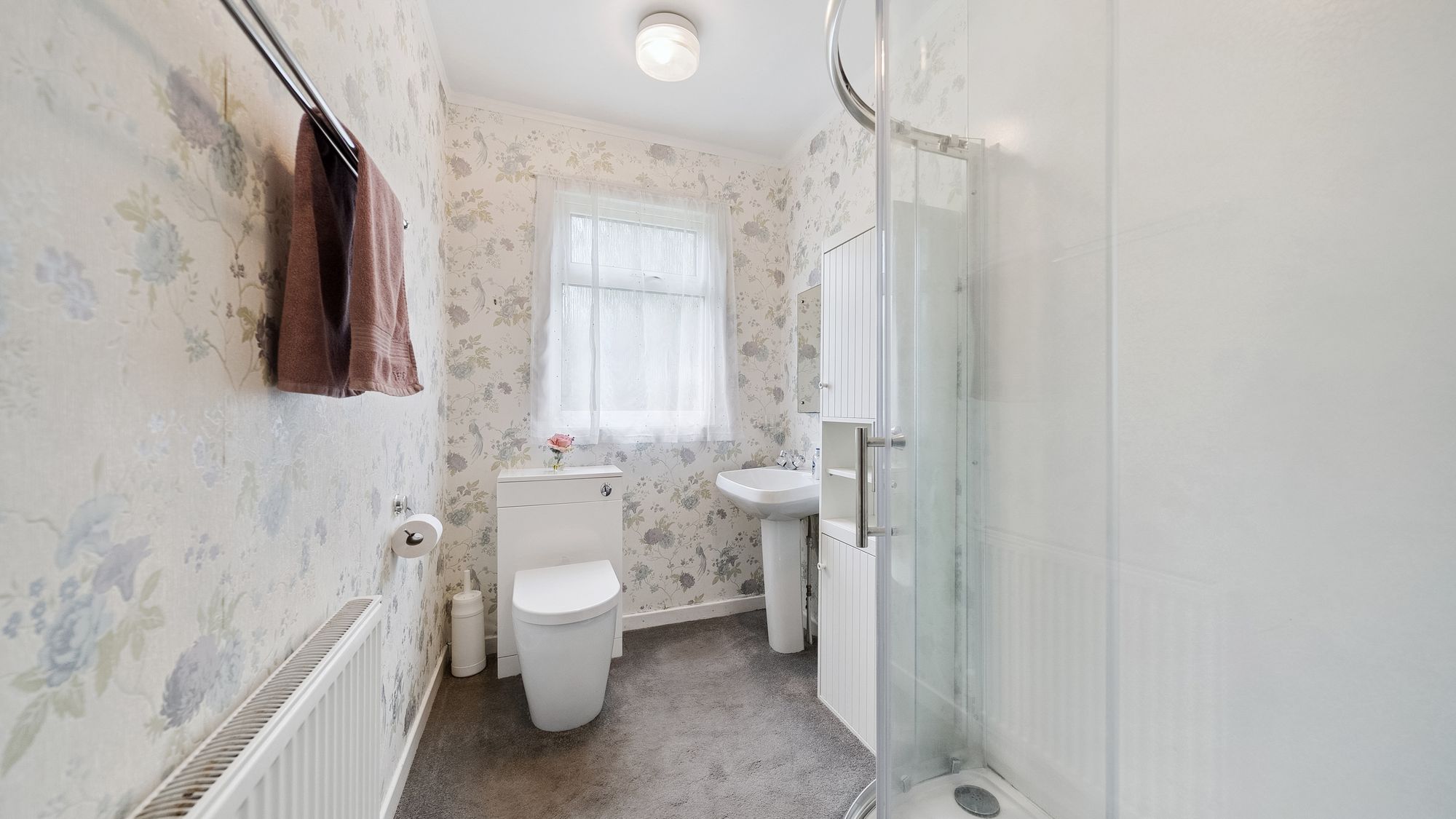 The delightful rear garden is also predominantly lawned and features a slabbed patio. The garden is enclosed by bordering timber fencing and a selection of mature trees and shrubbery.