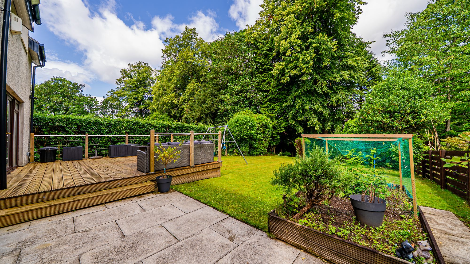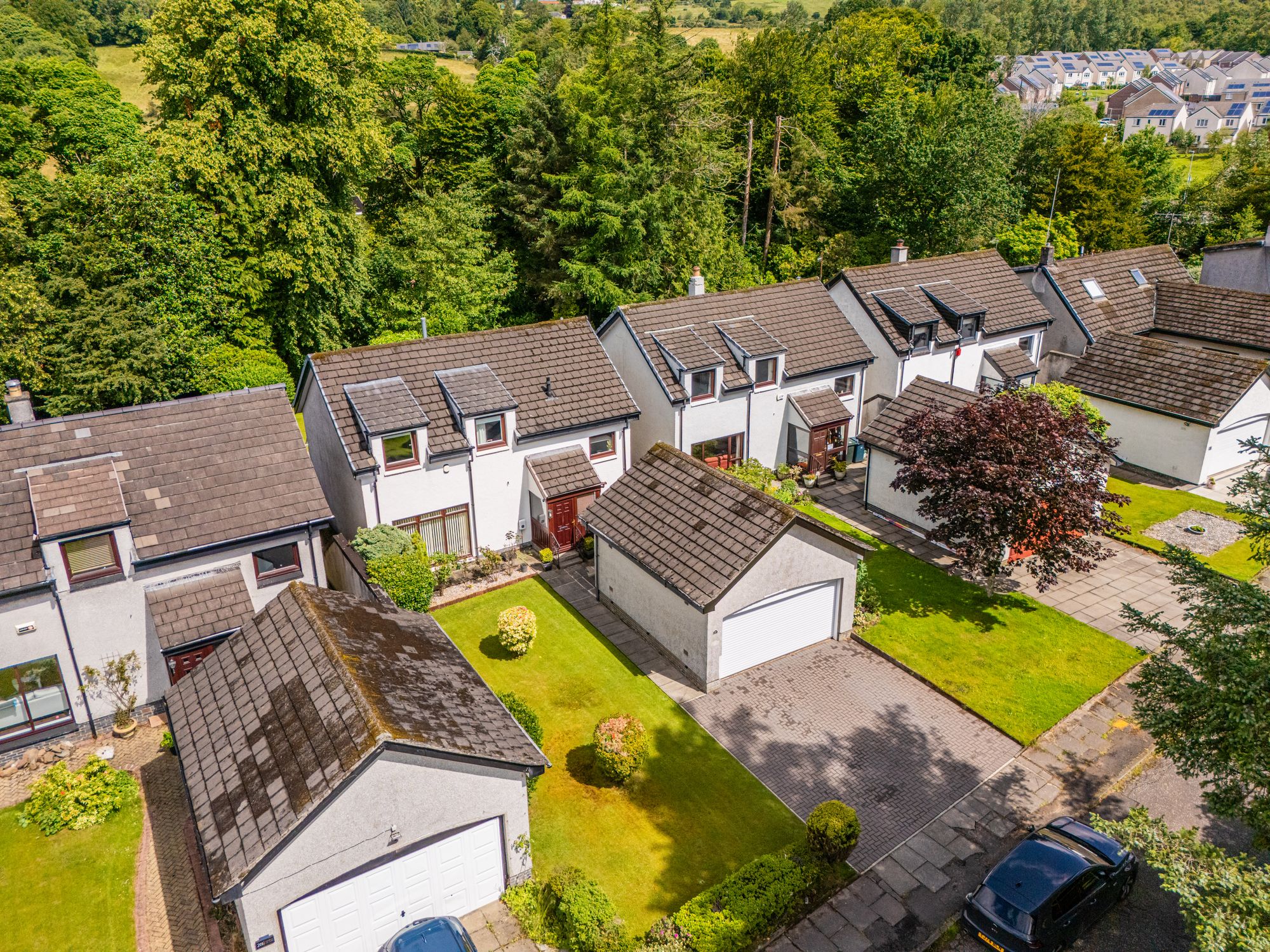 Externally, the home benefits from attractive front and rear gardens. The front features a lawn with neat borders and a monoblocked driveway leading to a large detached garage. The garage has an automatic roller shutter door, electric lighting and power supply. To the rear of the house, a timber deck and adjacent paved patio area offer ideal spaces for entertaining or relaxing outdoors. The garden is laid mainly to lawn with planted borders and is bordered by rendered walls. A small burn runs along the bottom of the garden with a stone wall beyond, and a number of mature trees, understood to be protected by a tree preservation order, provide privacy and a picturesque setting. A small metal garden shed and plastic greenhouse add to the practicality of the outdoor space. Additionally, there is a communal landscaped area forming part of the shared frontage of the development, enhancing the sense of community and visual appeal.