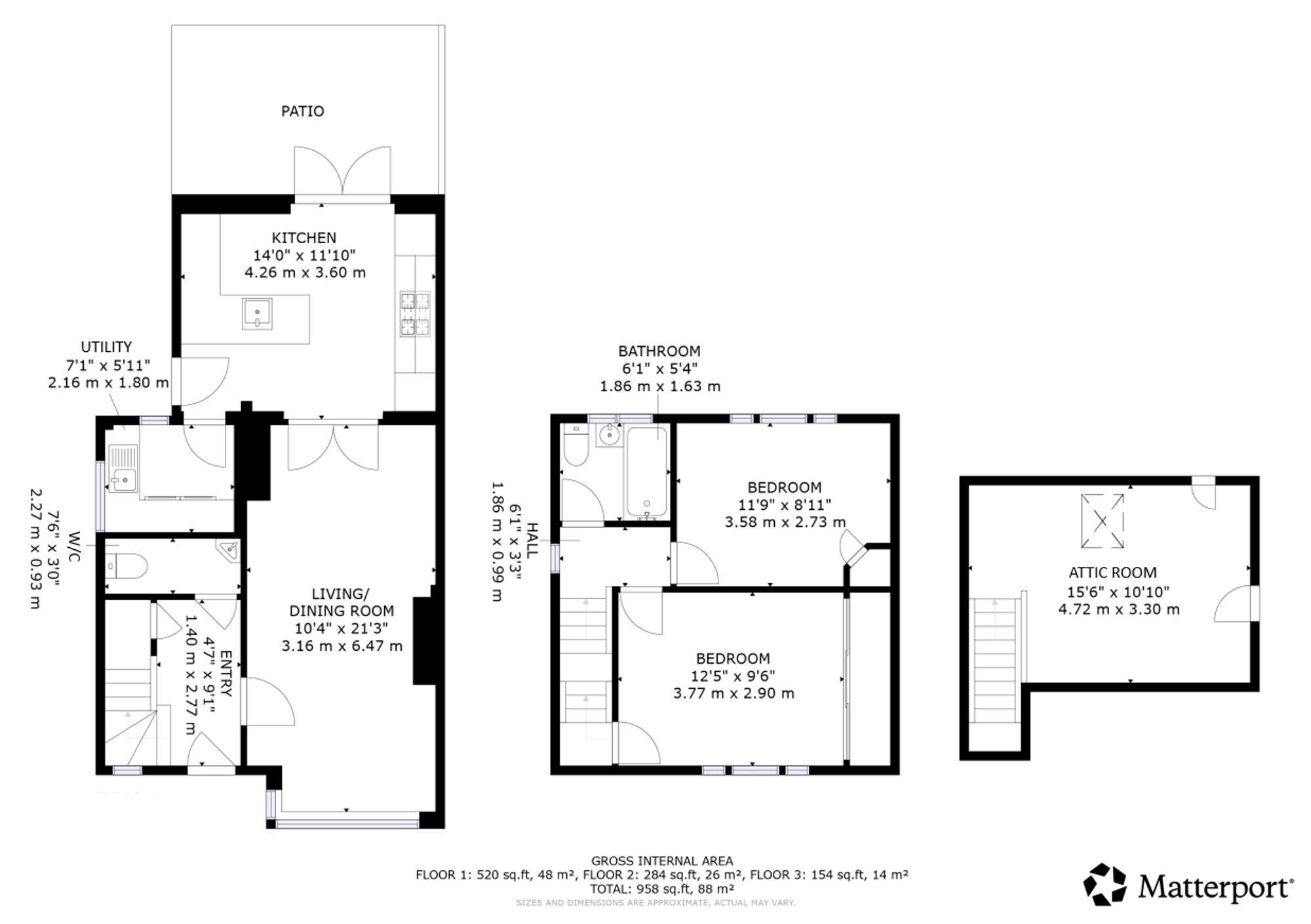 Upstairs, there are two generous double bedrooms and a fully tiled family bathroom featuring a three-piece suite with vanity sink, WC, and bath with mains shower over. A staircase leads to a floored and lined loft room, offering excellent additional storage or flexible use. The property further benefits from double glazing and gas central heating.