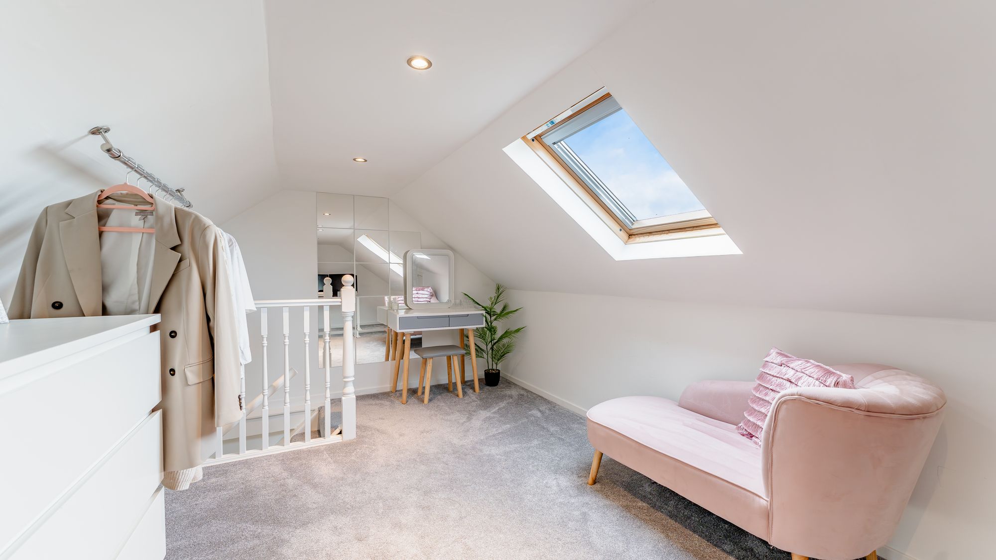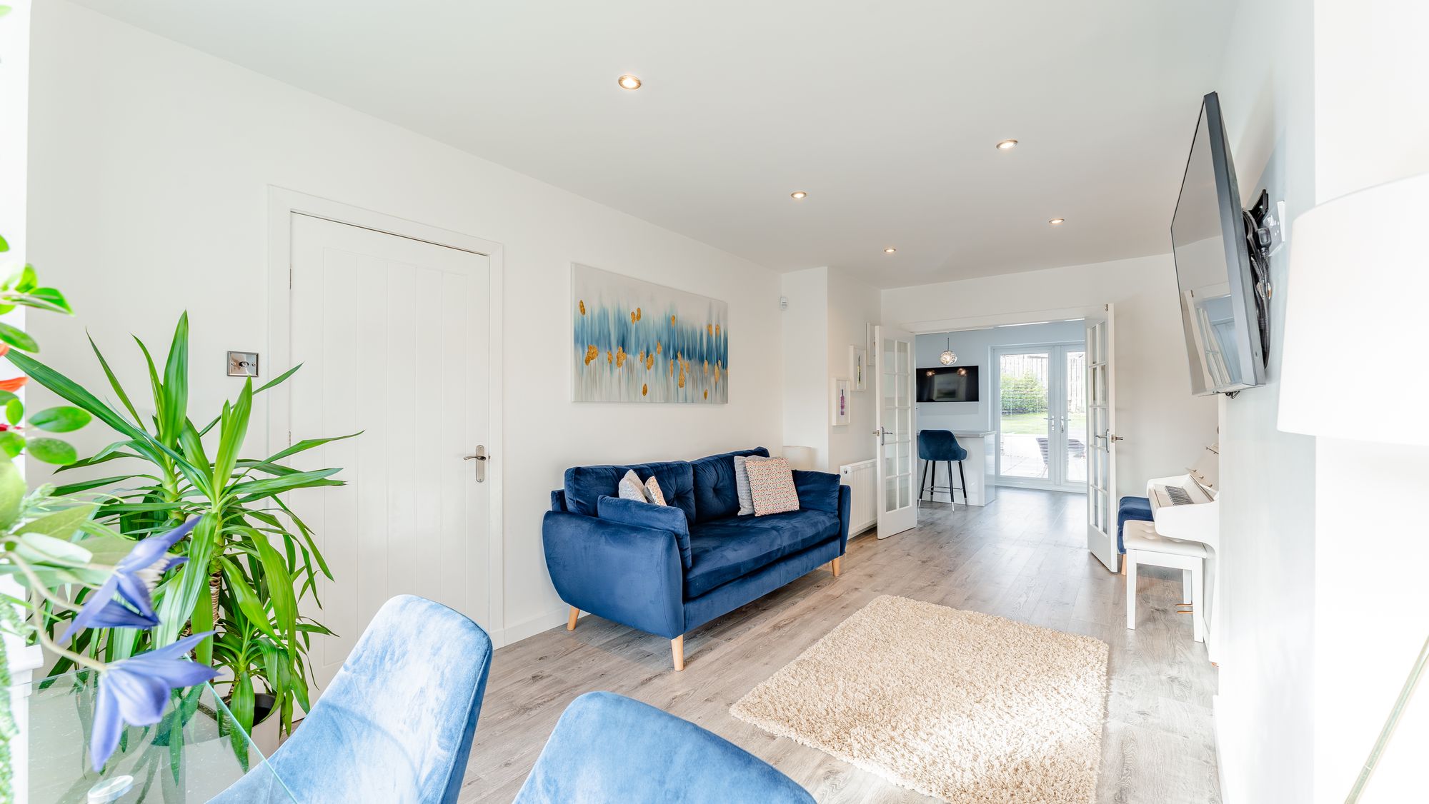 The accommodation comprises a spacious lounge with a large picture window to the front, leading through to a fantastic breakfasting kitchen fitted with white satin wall and base units complemented by sleek grey work surfaces and a range of high-quality integrated appliances. The kitchen enjoys an abundance of natural light thanks to patio doors opening directly onto the rear garden and also benefits from a useful utility room in the same specification as the kitchen. Completing the ground floor is a conveniently placed WC finished with white subway tiling.