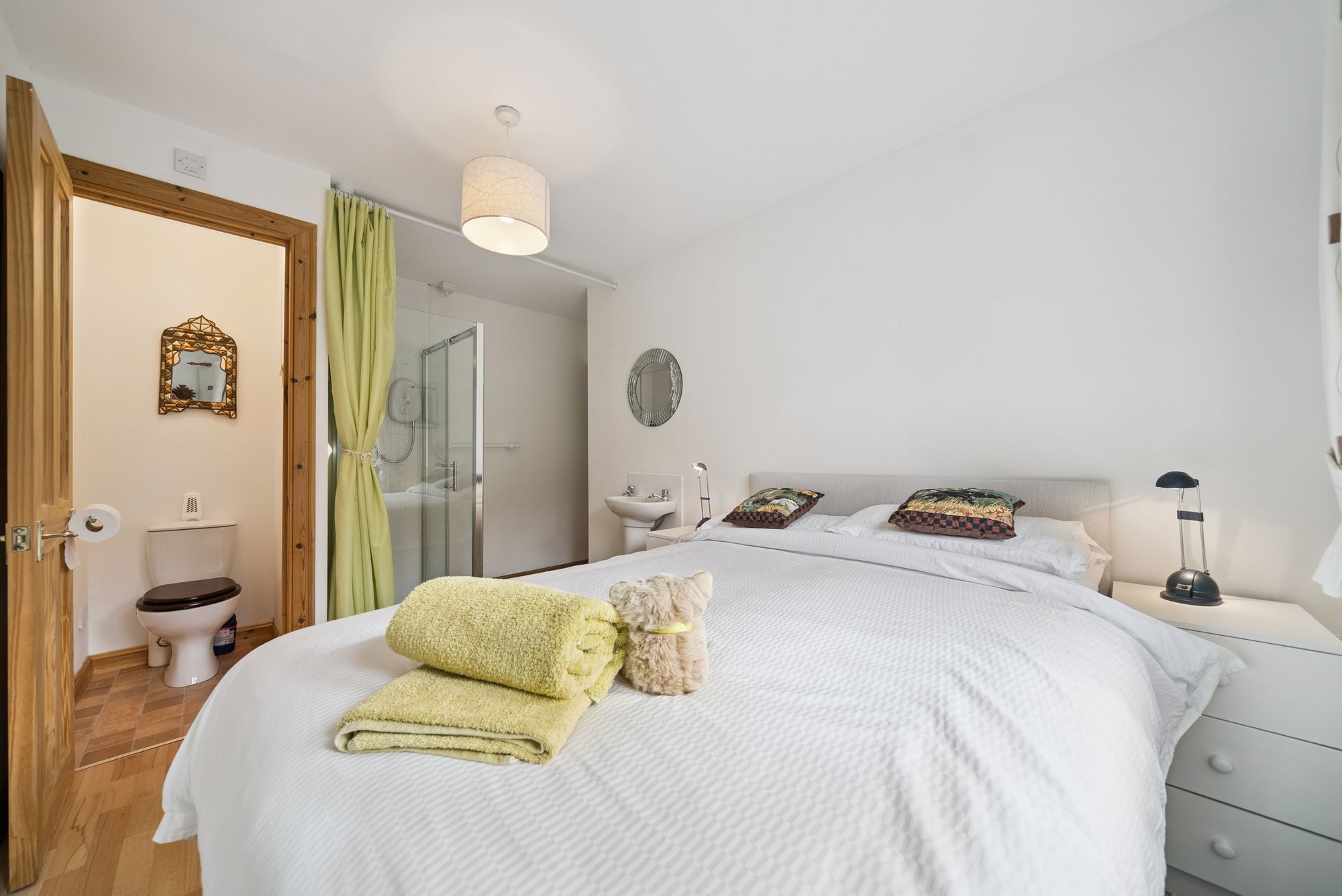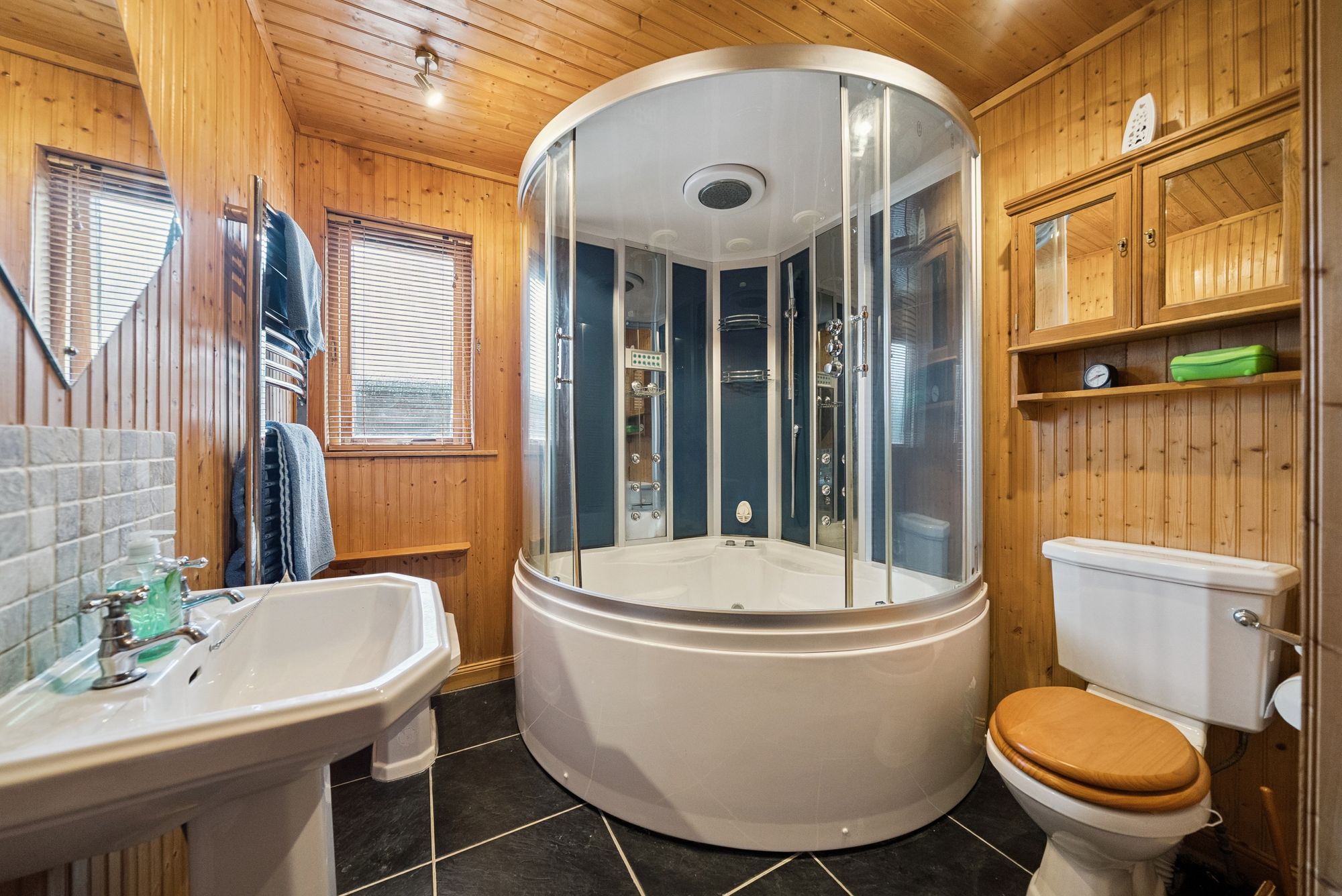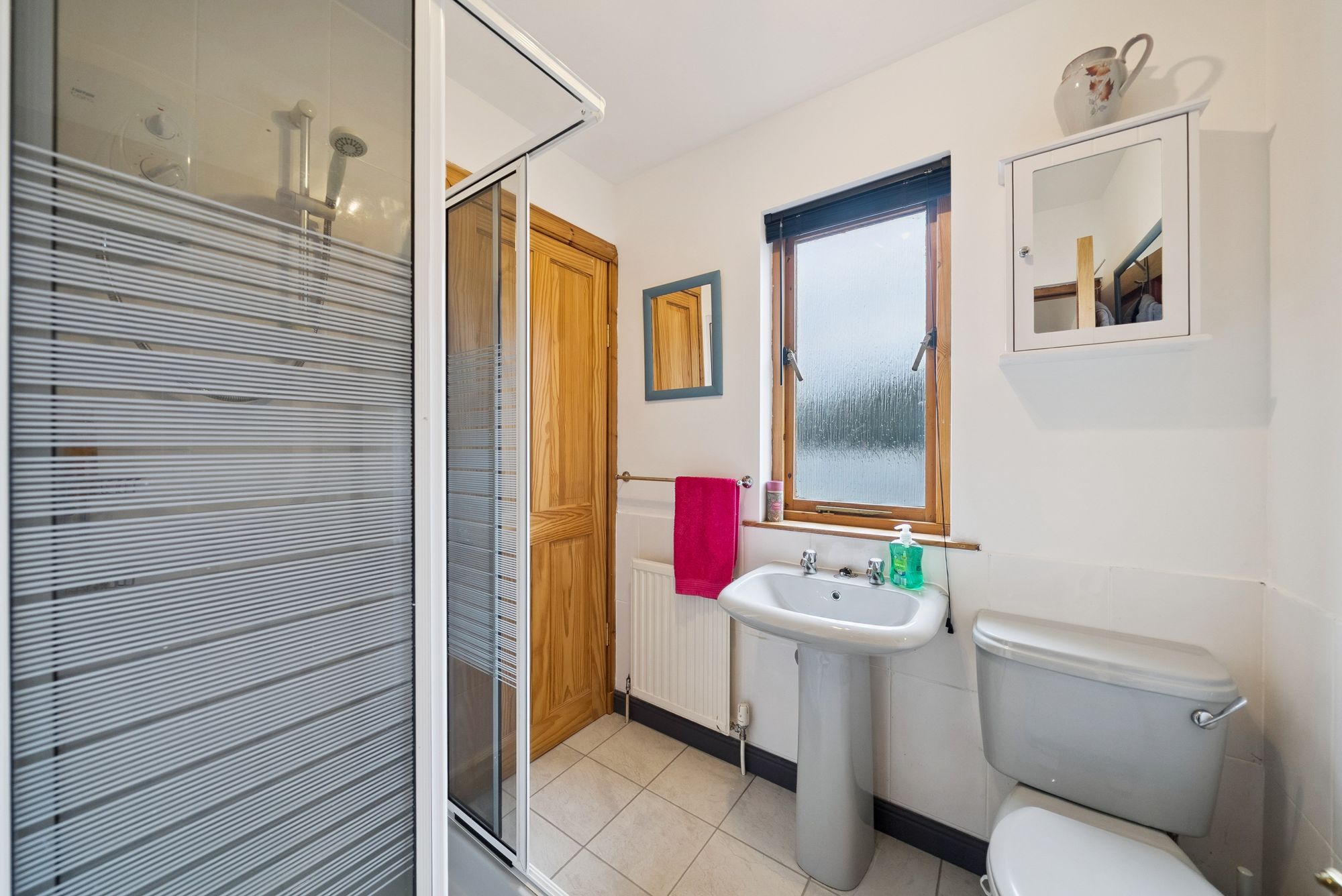 The dining-sized kitchen is well-appointed with an array of floor and wall-mounted units and provides ample space for a family dining table and chairs. There are three well-proportioned bedrooms, with the principal bedroom boasting in built wardrobes and access into a luxurious en-suite bathroom, featuring mood lighting, an enclosed jacuzzi bath with immersing shower assembly featuring a superb and powerful rainfall shower with side massage jets, creating a spa-like retreat within the home. The second double bedroom offers an en-suite shower room and a further stylish Jack and Jill shower room serves both the hallway and a third bedroom, offering added convenience and privacy.