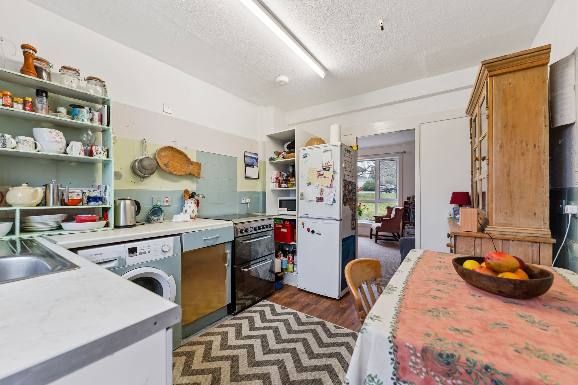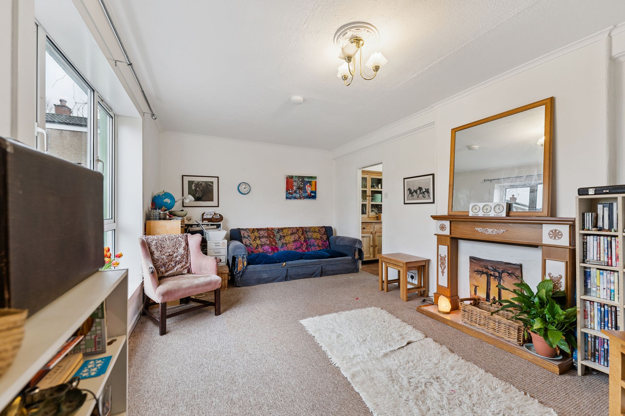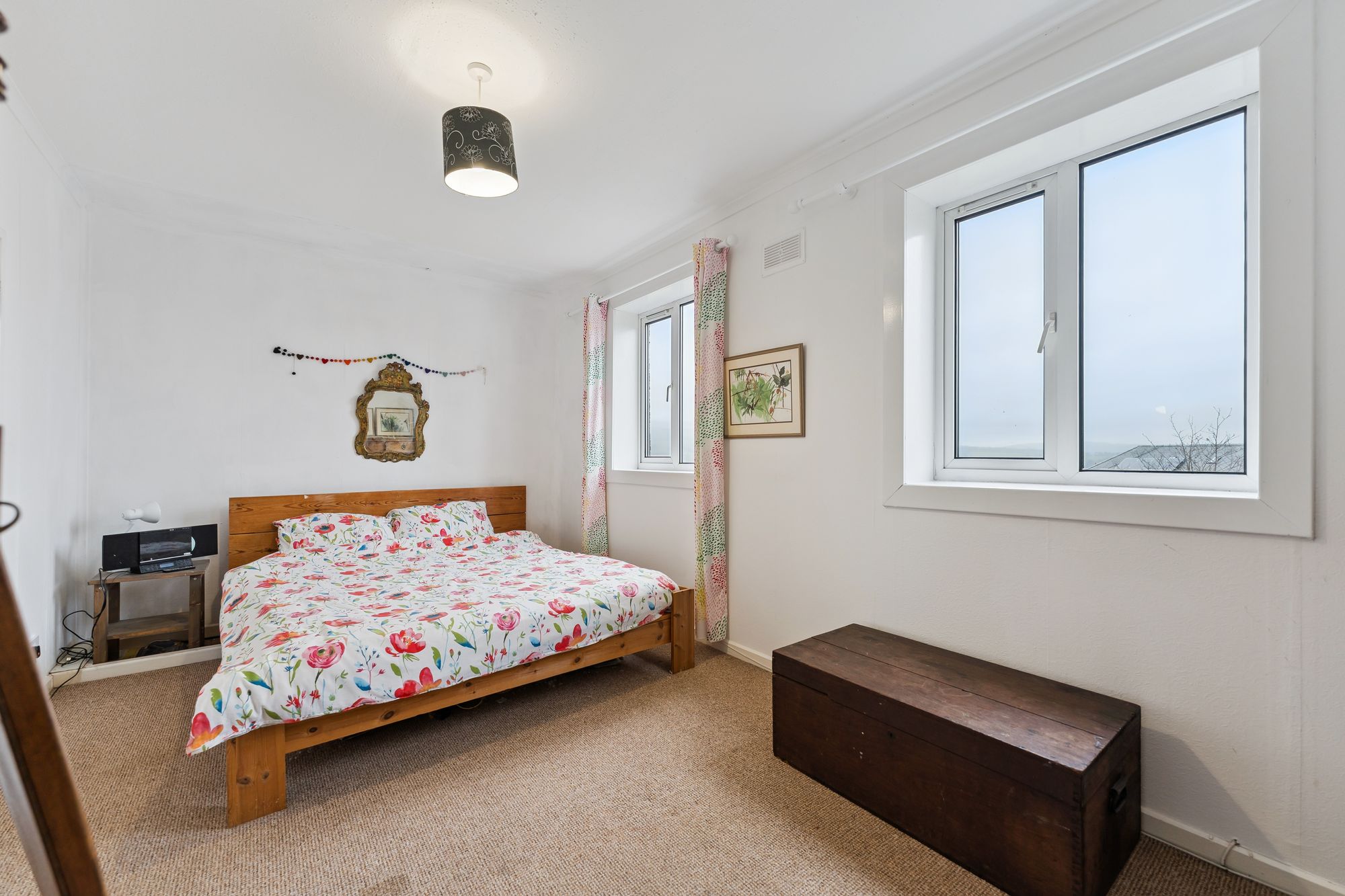 Internally, the freshly painted accommodation is arranged over two levels and finished in a light, neutral palette. The ground floor comprises an entrance hall, a bright lounge and an almost floor-to-ceiling window overlooking the open grounds to the front. The kitchen is fitted with a range of wall and base units, new flooring, a traditional clothes-drying pulley and a door providing access to the rear garden.