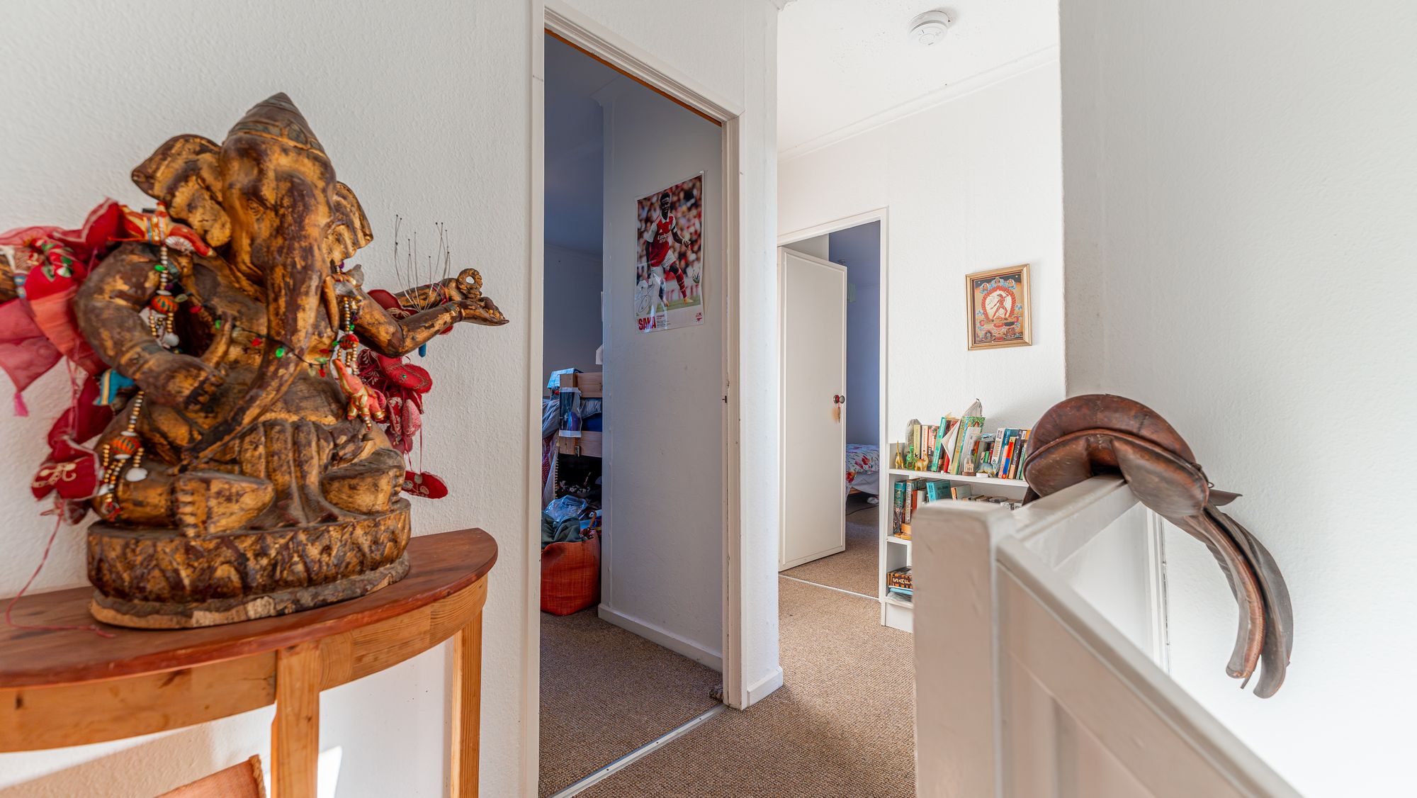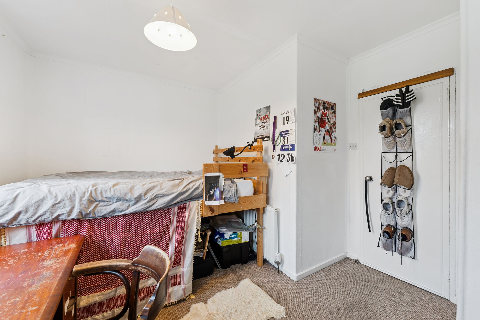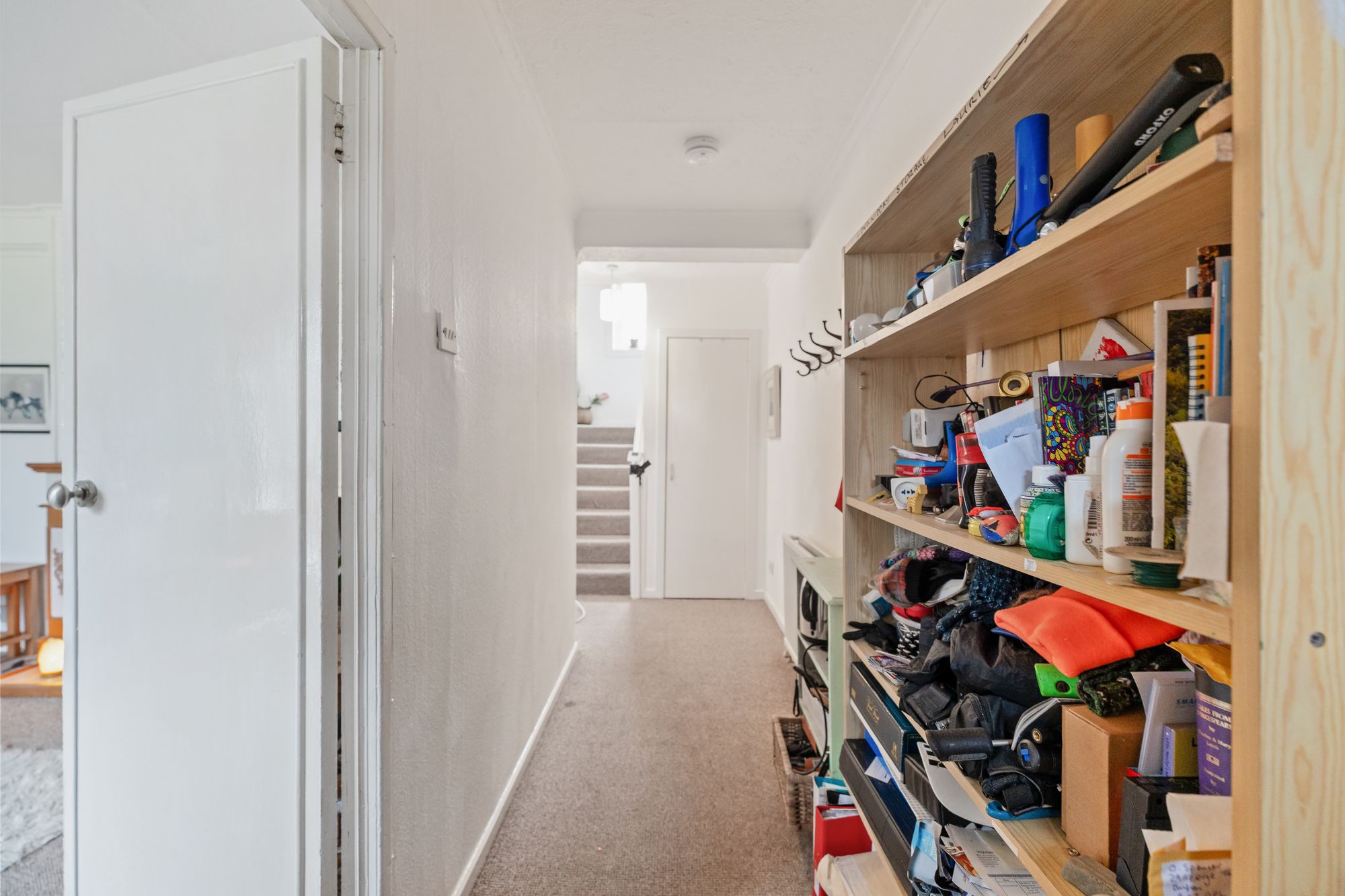 Internally, the freshly painted accommodation is arranged over two levels and finished in a light, neutral palette. The ground floor comprises an entrance hall, a bright lounge and an almost floor-to-ceiling window overlooking the open grounds to the front. The kitchen is fitted with a range of wall and base units, new flooring, a traditional clothes-drying pulley and a door providing access to the rear garden.