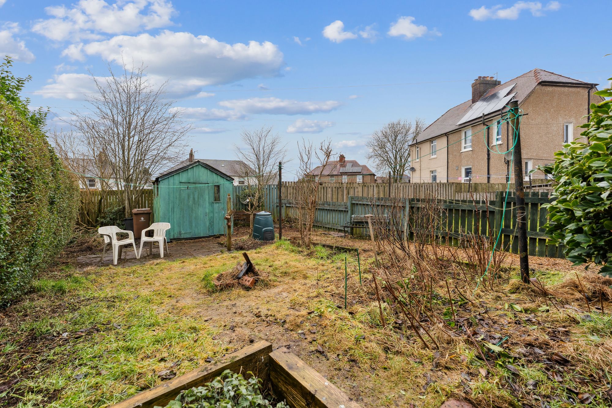 Upstairs, there are three generous double bedrooms, all benefiting from fitted wardrobes, with the rear facing rooms enjoying attractive views towards the Campsie Fells. Additional storage is provided by a deep cupboard off the hallway, while the family bathroom is fully tiled and fitted with a white three-piece suite and an electric shower over the bath. Further features include double glazing and gas-fired central heating.