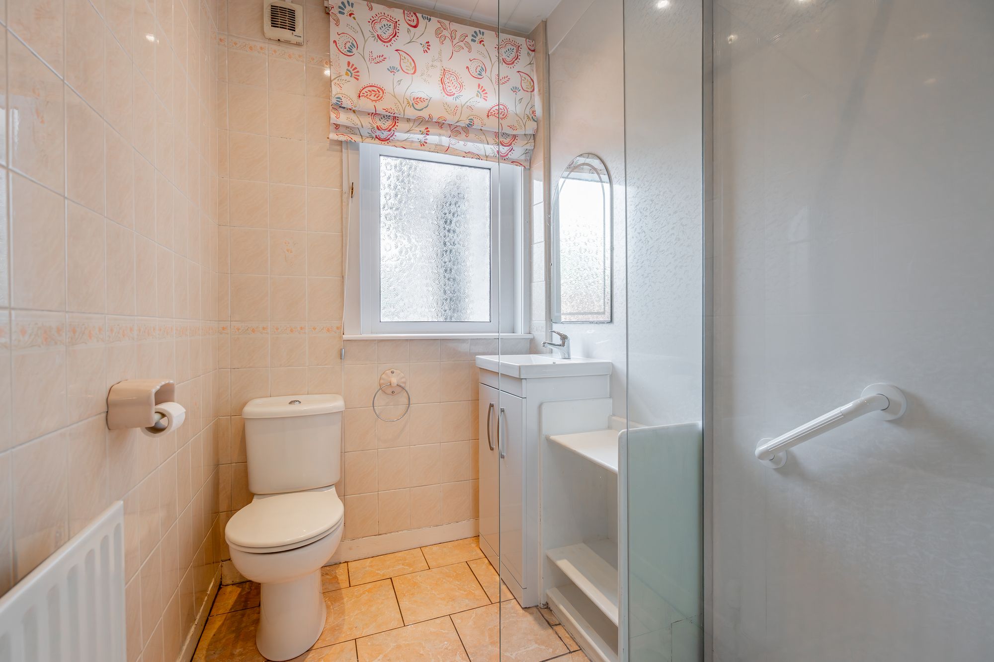 The ground floor comprises an entrance hall, a bright living room, a separate dining room, a shower room, and a fitted kitchen with direct access to the rear garden. On the first floor, there are three good-sized bedrooms and a separate toilet with wash hand basin.
