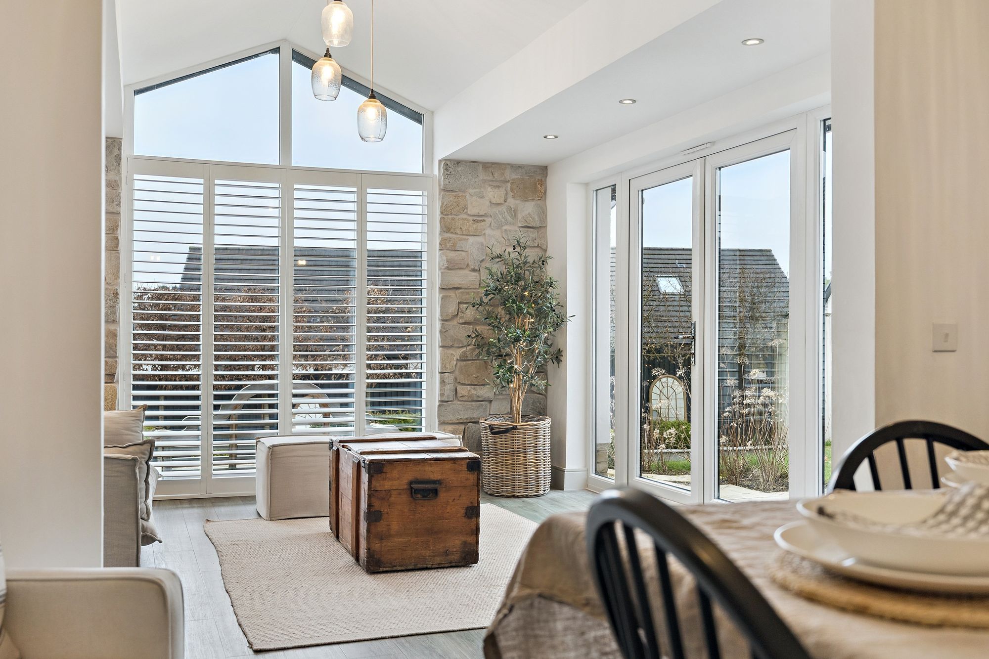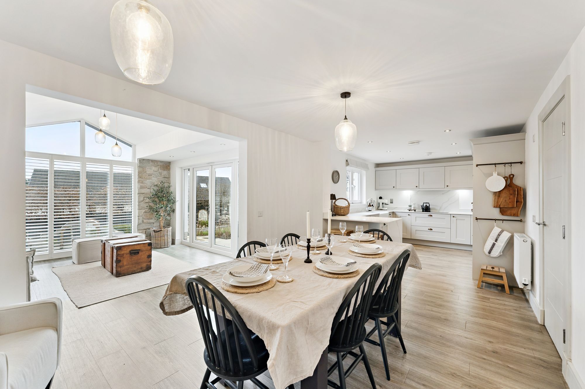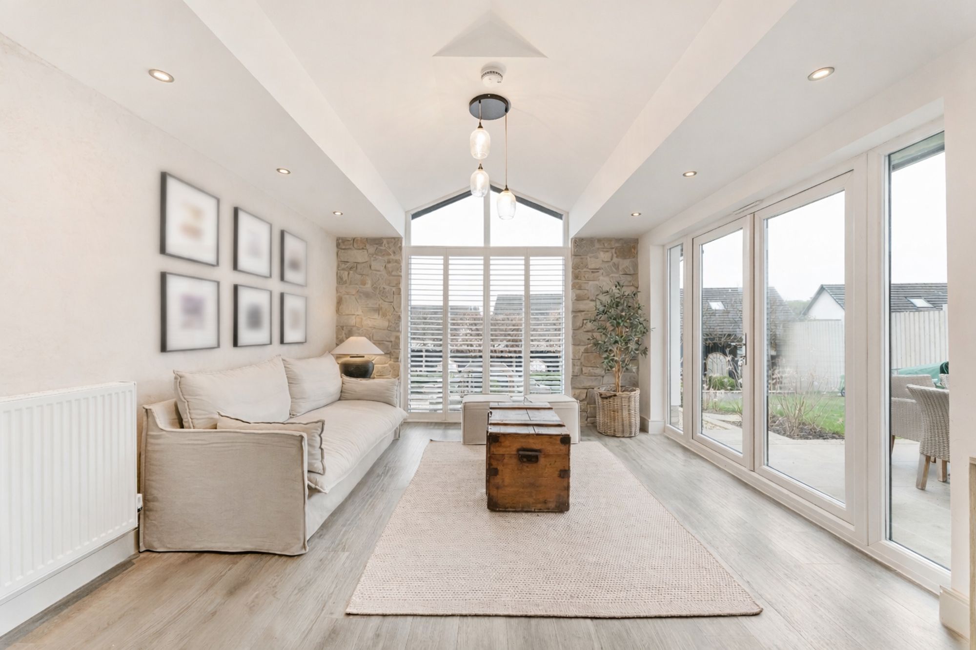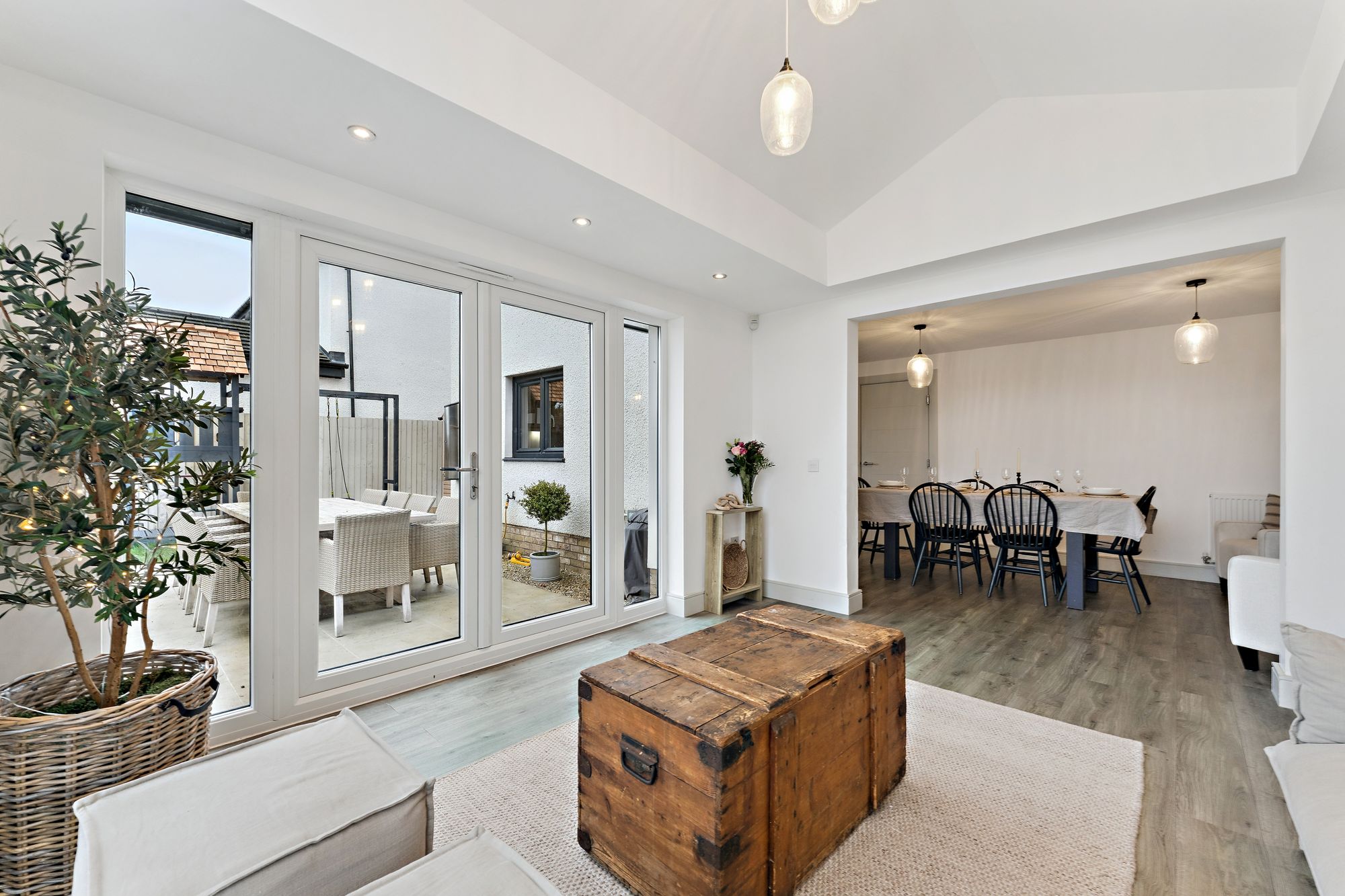 The dining area offers flexibility for both formal and informal use, while the adjoining garden room is a standout feature, boasting a vaulted ceiling and French doors leading to the rear garden. This versatile space could easily function as an additional lounge, dining area, home gym, or games room.