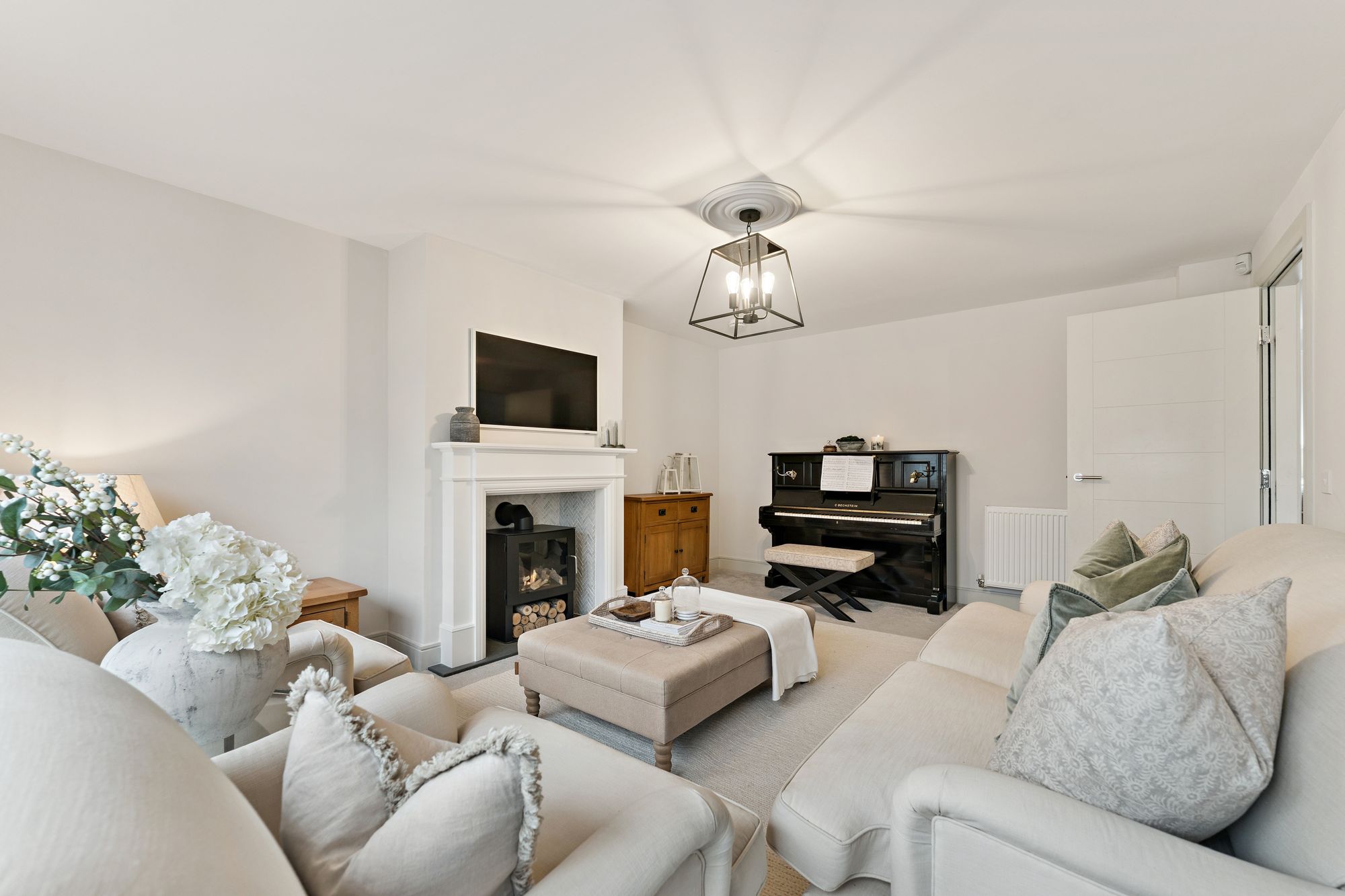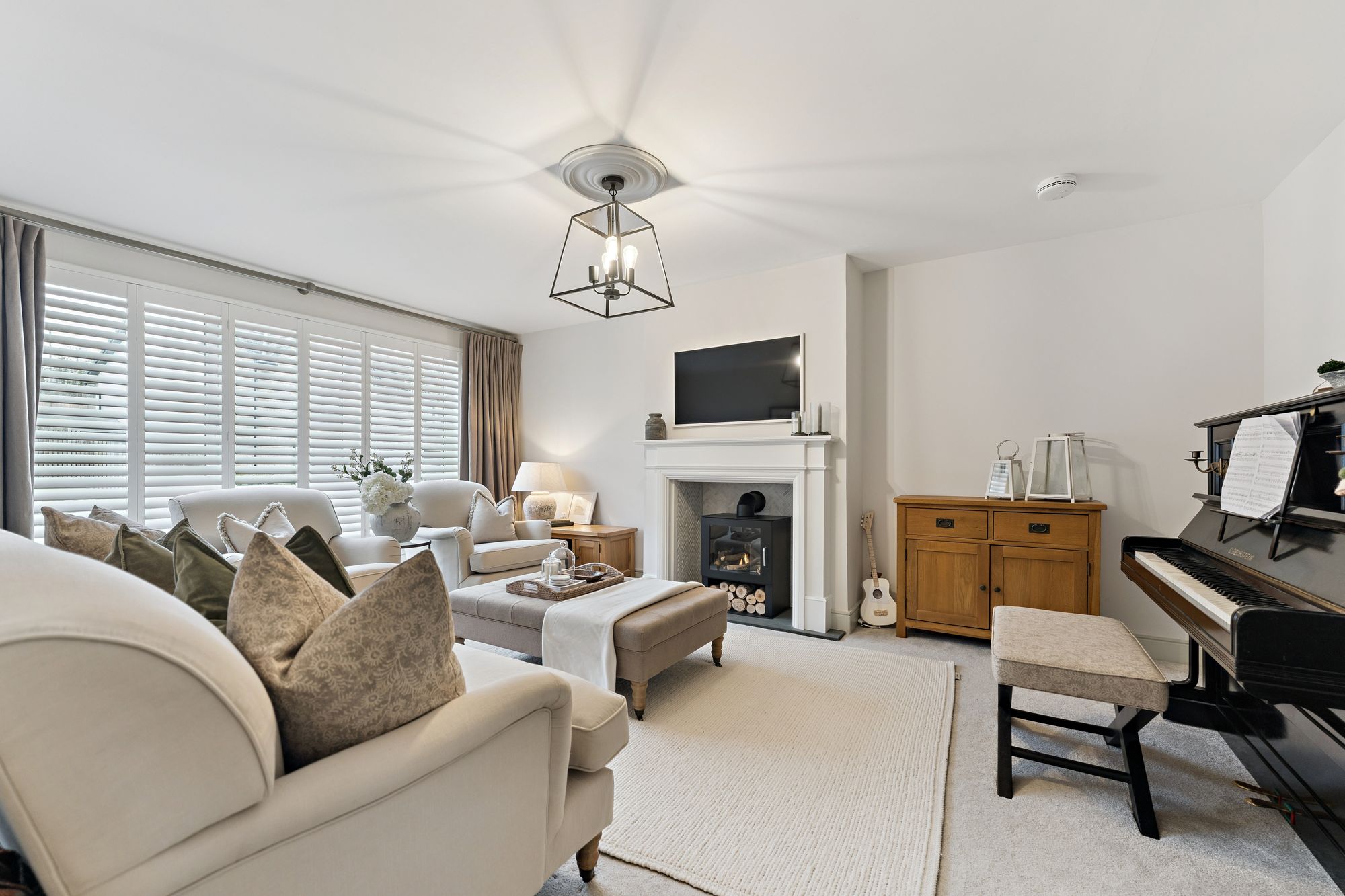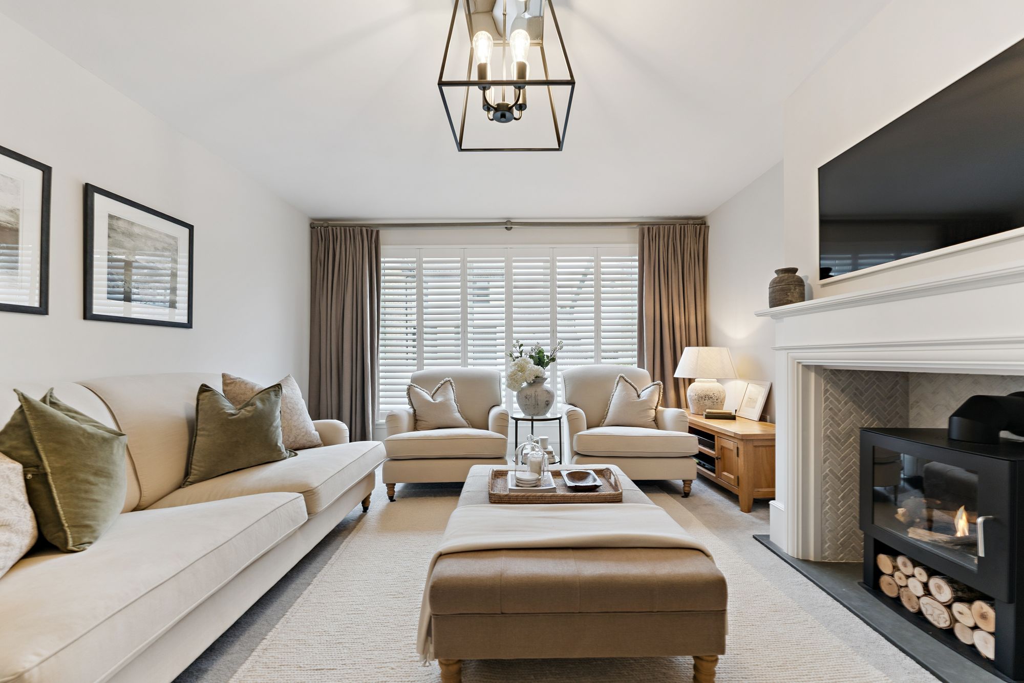 Undoubtedly, the heart of the home is the stunning open-plan kitchen, dining and garden room positioned to the rear. Flooded with natural light, the kitchen has been finished in a timeless Shaker style, complemented by white quartz worktops, a Belfast sink, breakfast bar, and an induction hob with extractor. The kitchen is exceptionally well equipped, with an integrated larder and pantry featuring bespoke solid oak dovetail drawers, integrated microwave, 50/50 fridge freezer, wine cooler, and dishwasher, along with an excellent range of base and wall-mounted units.