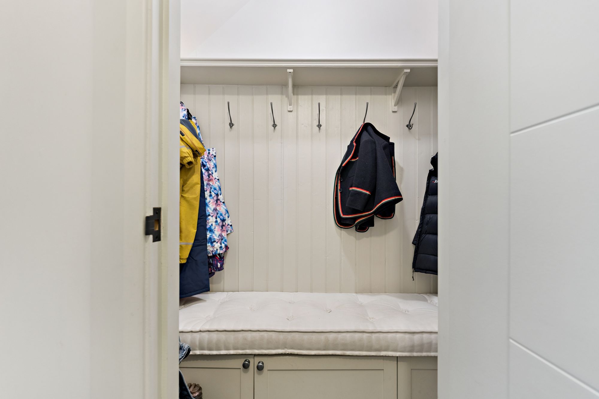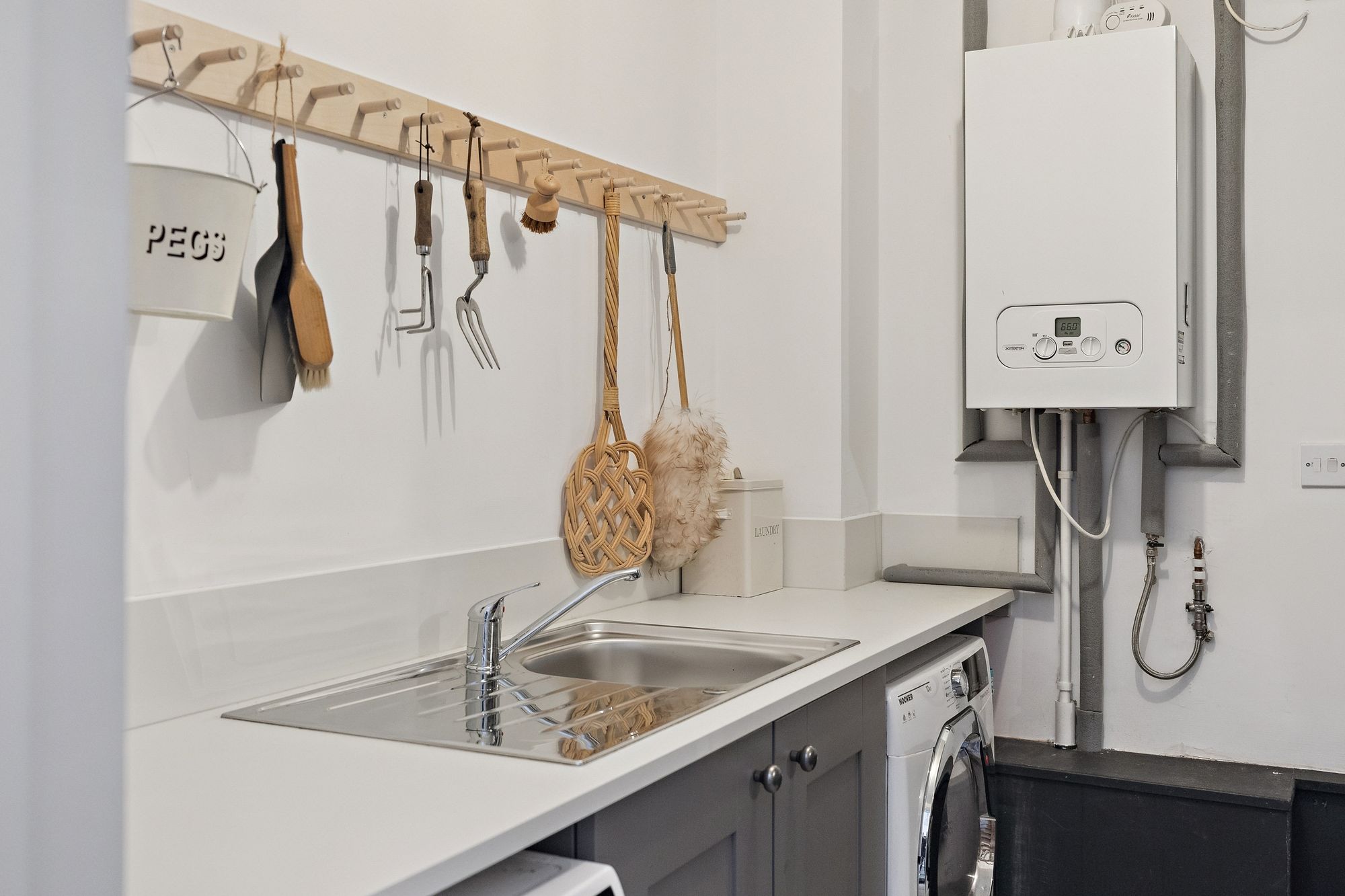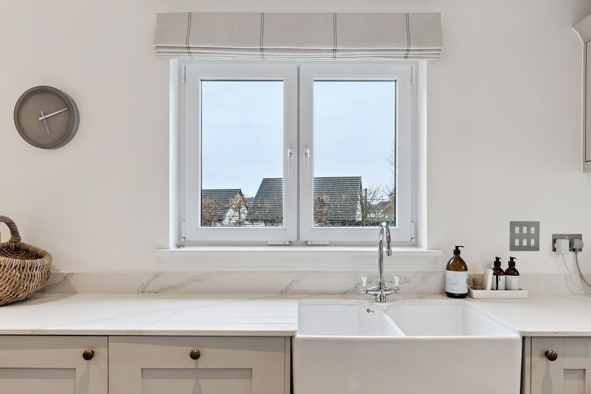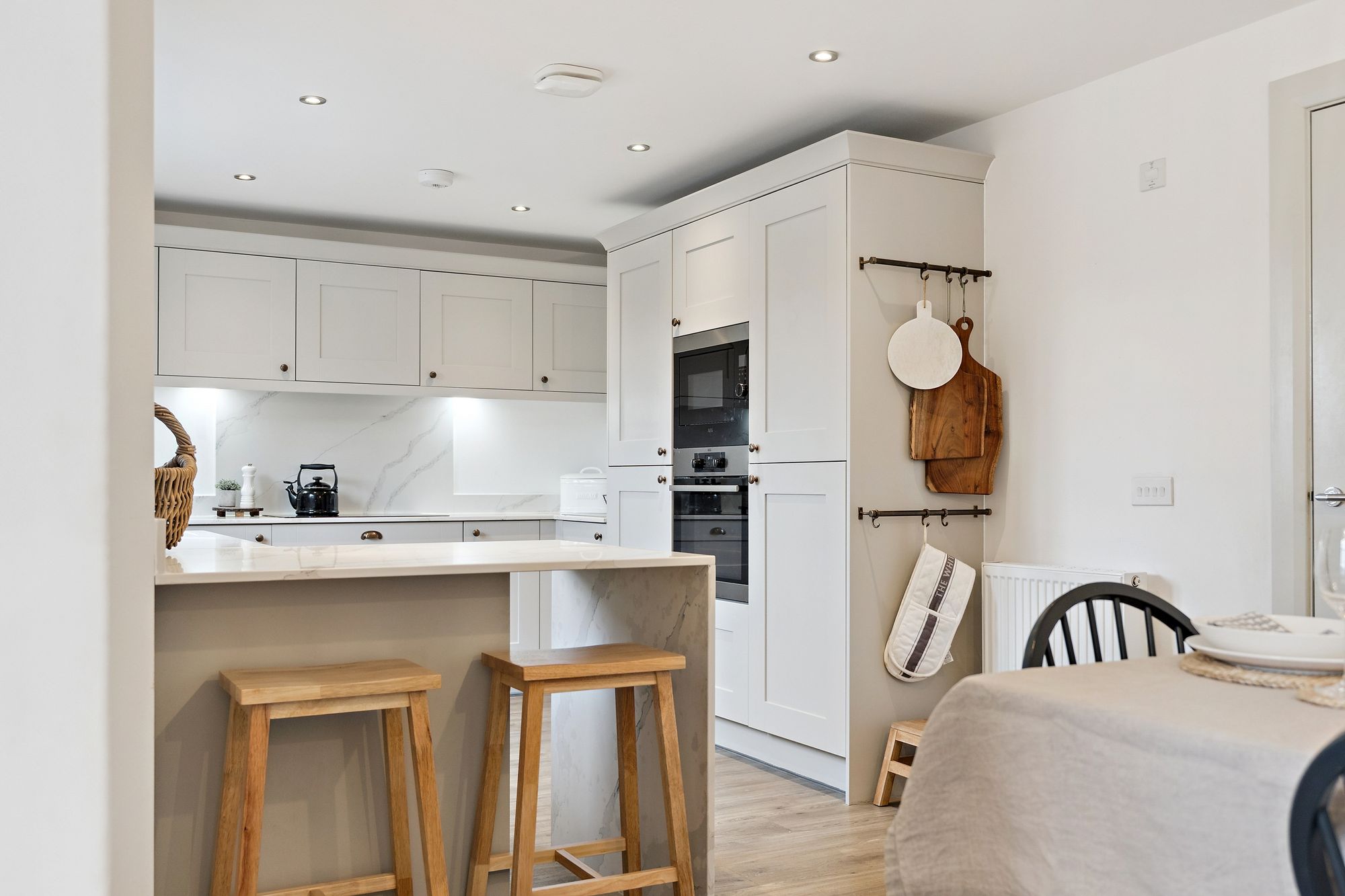 Undoubtedly, the heart of the home is the stunning open-plan kitchen, dining and garden room positioned to the rear. Flooded with natural light, the kitchen has been finished in a timeless Shaker style, complemented by white quartz worktops, a Belfast sink, breakfast bar, and an induction hob with extractor. The kitchen is exceptionally well equipped, with an integrated larder and pantry featuring bespoke solid oak dovetail drawers, integrated microwave, 50/50 fridge freezer, wine cooler, and dishwasher, along with an excellent range of base and wall-mounted units.