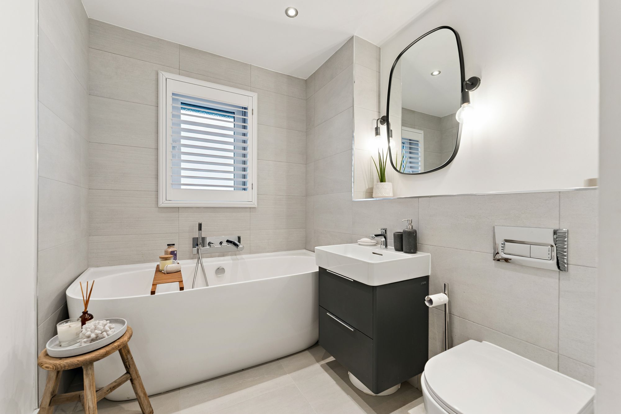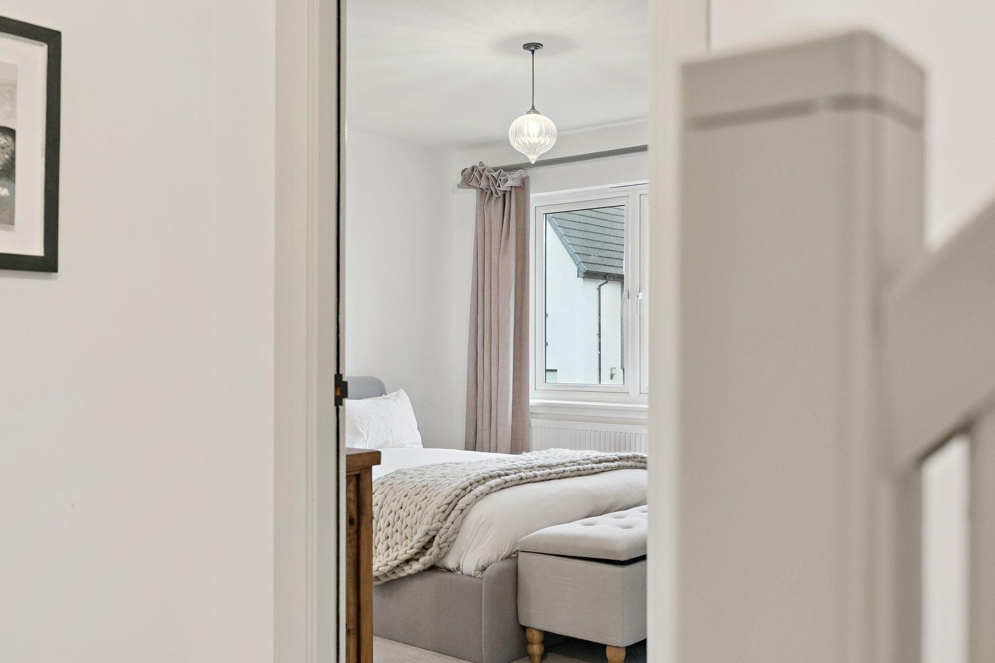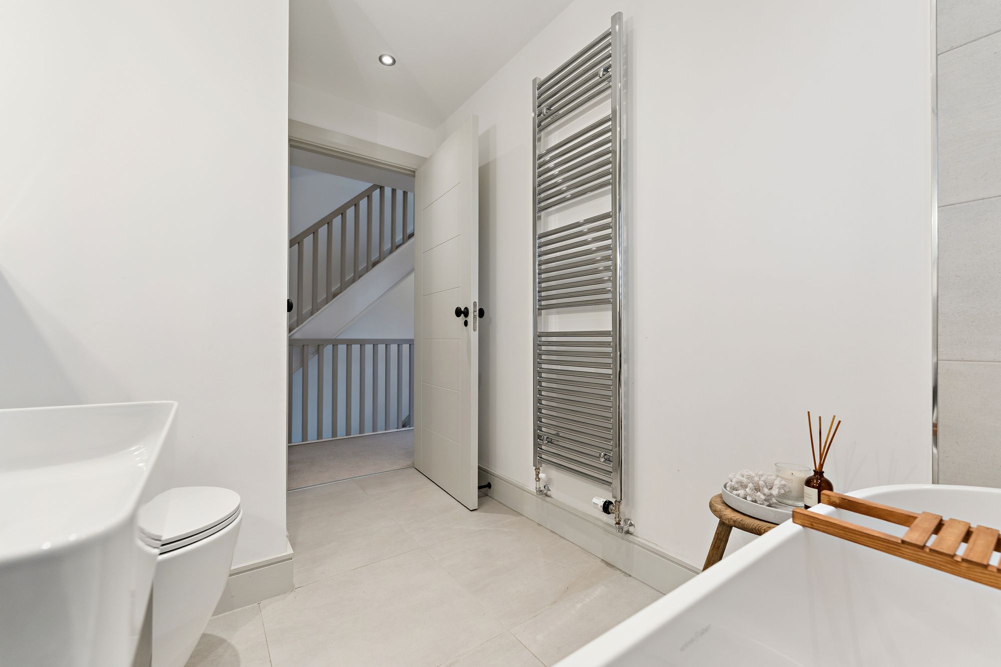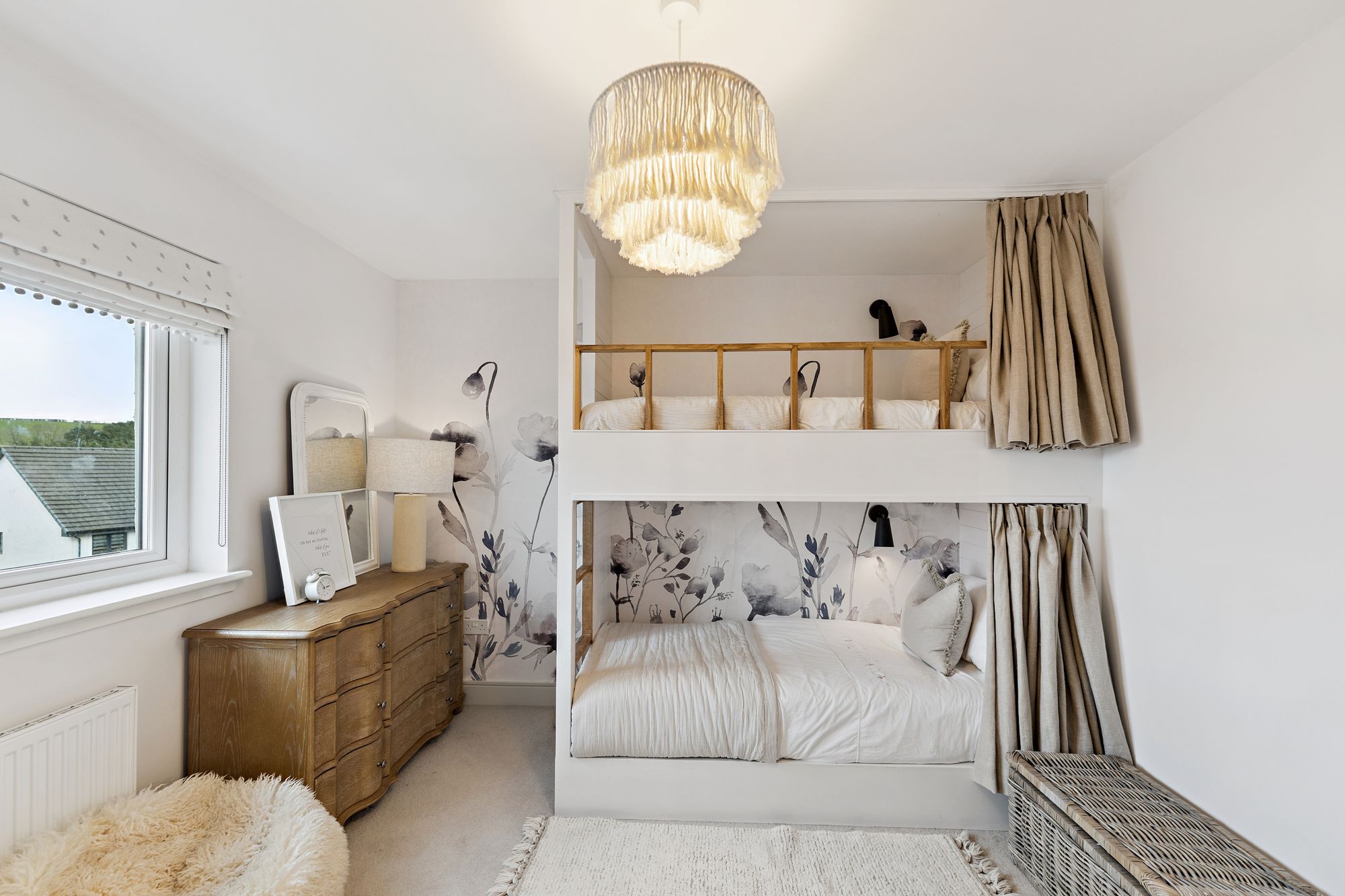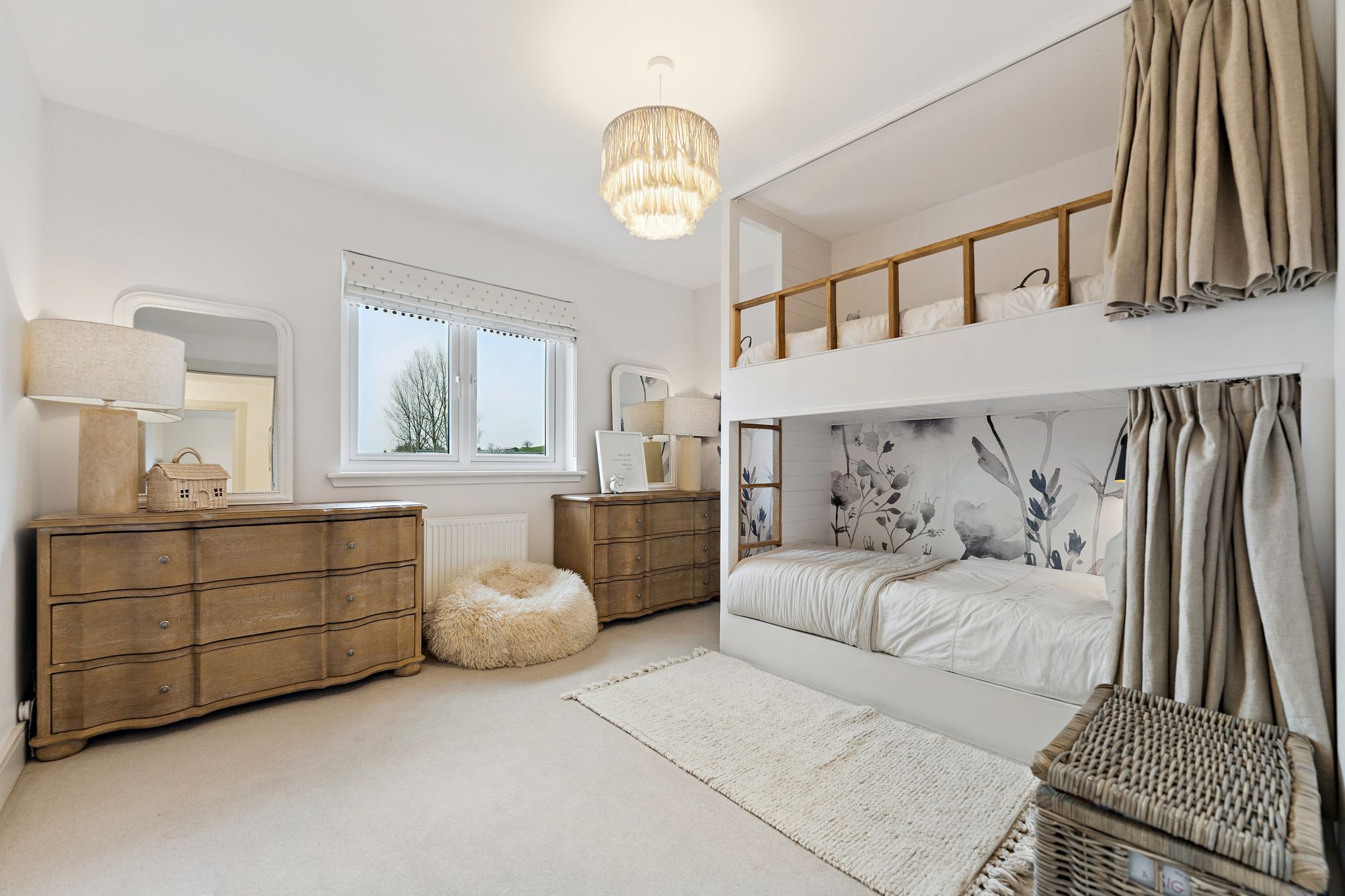 Bedrooms three and four are both well-proportioned, with bedroom three further enhanced by bespoke bunk beds with a solid oak safety rail and ladder. The family bathroom is bright and spacious, featuring a four-piece suite including a Victoria and Albert bath, Laufen sanitaryware, and Porcelanosa tiling.
