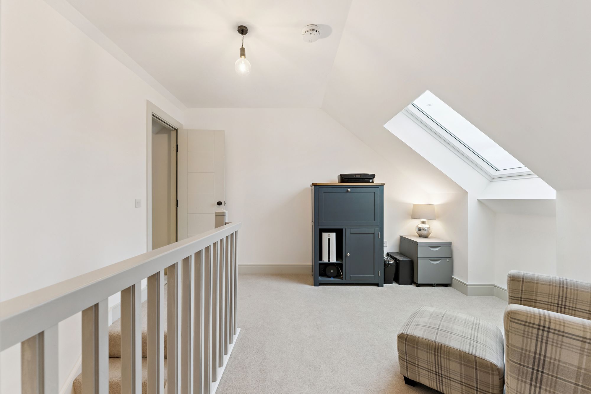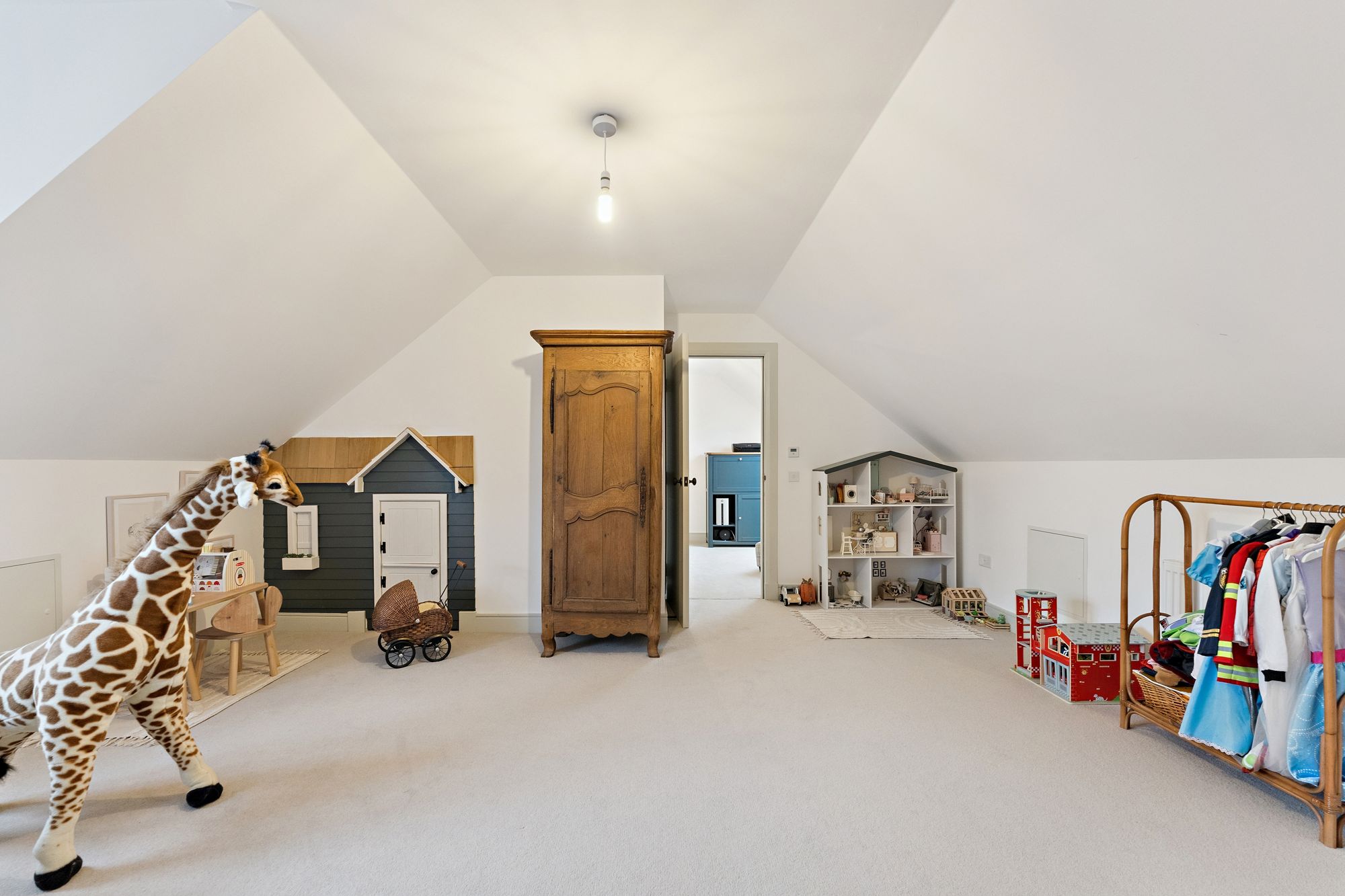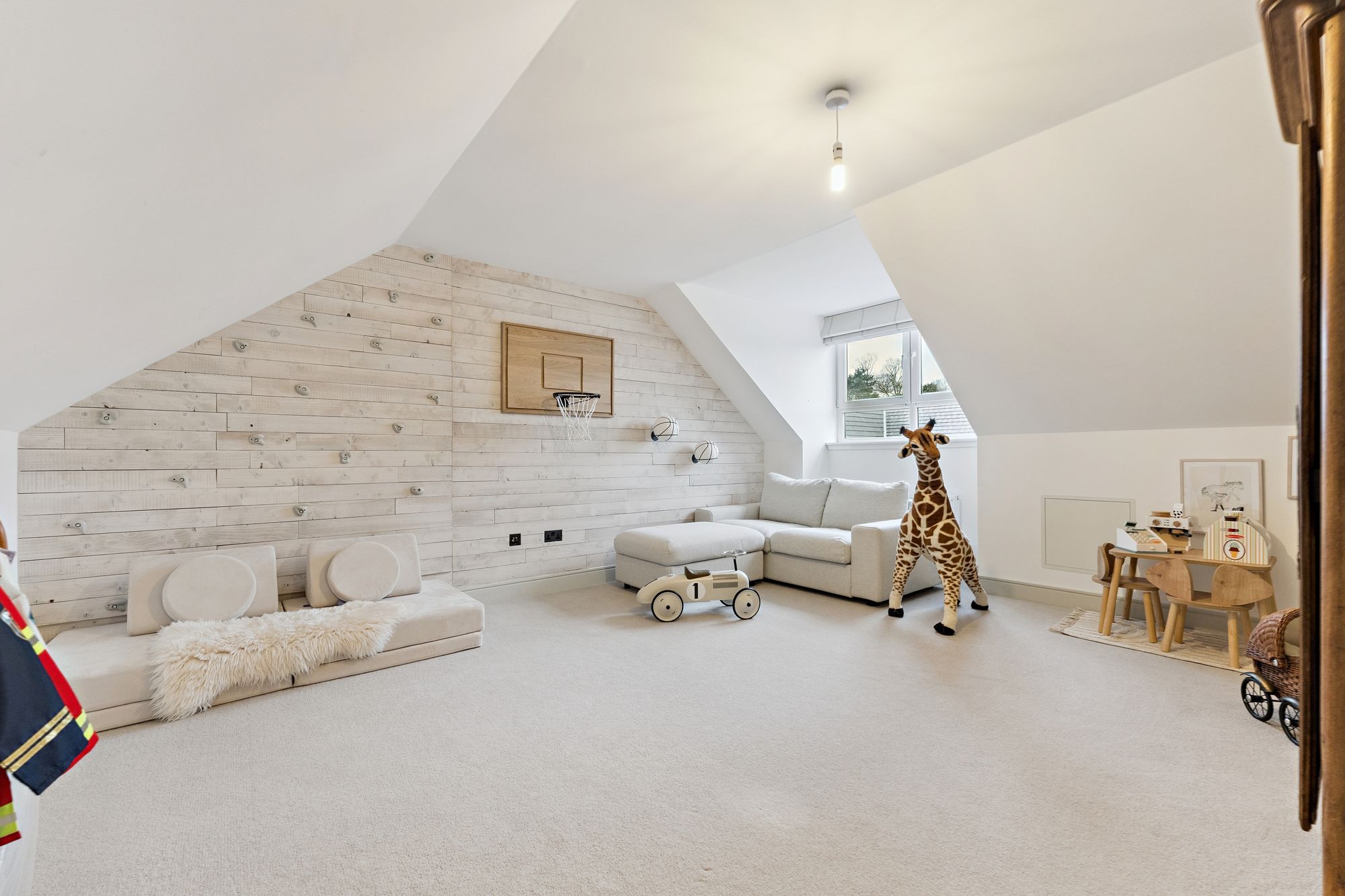 The second floor completes the accommodation and offers a highly versatile space. A bright upper landing with Velux window provides an ideal home working area and access to a substantial eaves storage room, currently utilised as a gym. There is also a large multi-purpose room with dormer window, suitable for use as an additional bedroom, cinema room, games room, or gym.