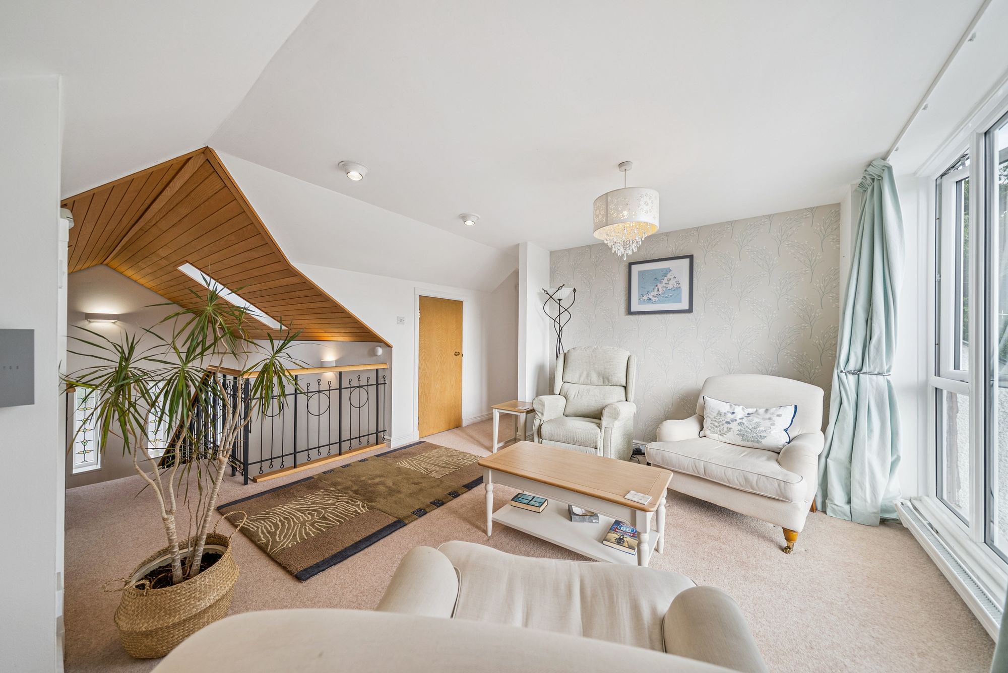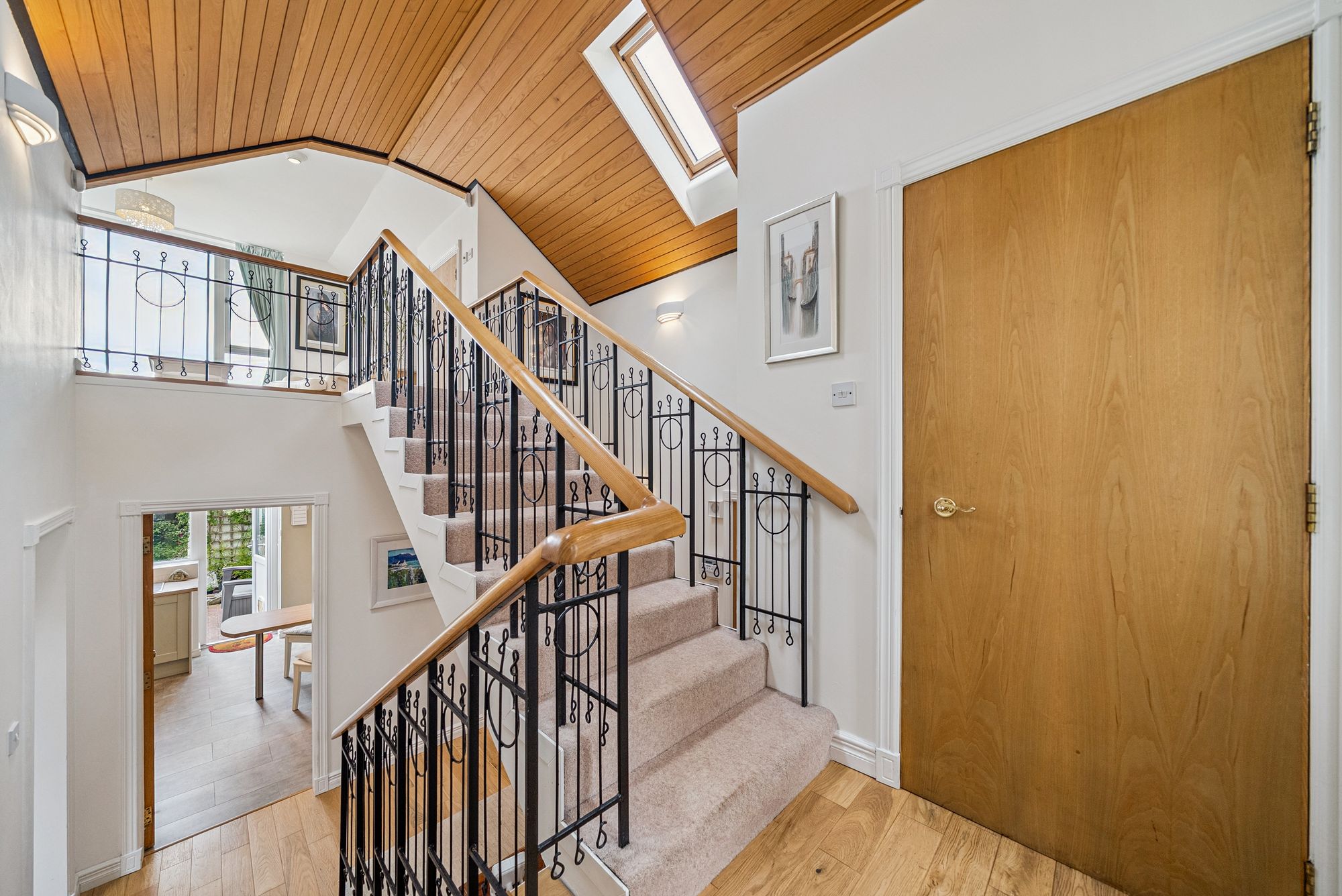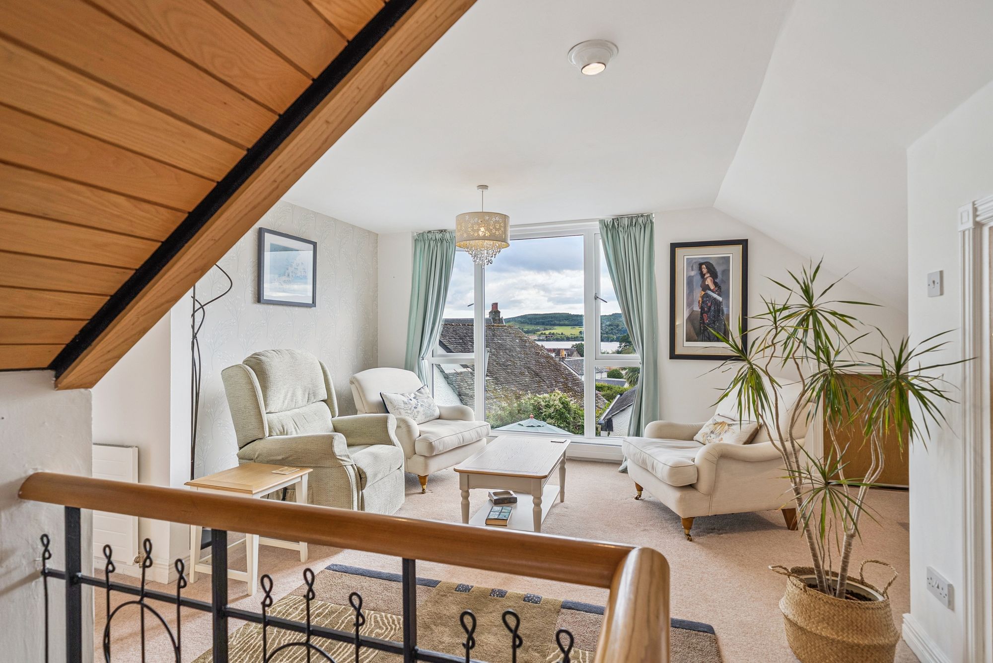 On entering the property, the entrance vestibule opens into a stunning double height reception hall with vaulted ceiling and with its “Velux” windows providing great natural light. From here stairs lead down to a lower hall which in turn gives access to a bright open plan and spacious lounge and separate dining room. The lounge area is cosy and sunken and enjoys a wood burning stove at its focal point. The dining room has a large picture window overlooking the courtyard and enjoys a south facing aspect. From the lounge there is a door leading through to the garage which as mentioned is a good size double with power and light laid on and with an electric door. Also, off the reception hall is a beautifully refitted modern and stylish kitchen which is well fitted with extensive units and a range of modern appliances. From here there is a door out to the courtyard garden. A hallway leads from the main reception hall to two double bedrooms, with the master bedroom overlooking the courtyard garden and with a full run of wardrobes along one wall and with its own ensuite bathroom which is modern and has recently been refitted. There is also a modern refitted shower room on this level. Moving onto the upper accommodation, a grand staircase ascends to a stunning, bright and open sitting area which takes in the best views in the house and gives access to eaves storage, a built-in cupboard and an additional strongroom. To one side of this space is an additional and spacious double bedroom.