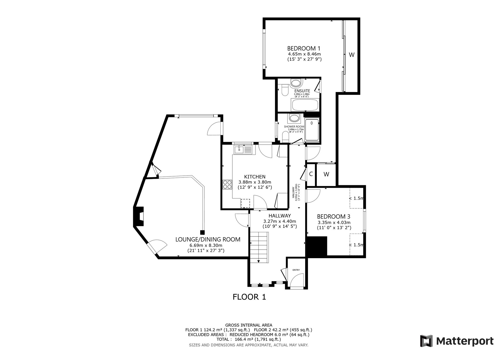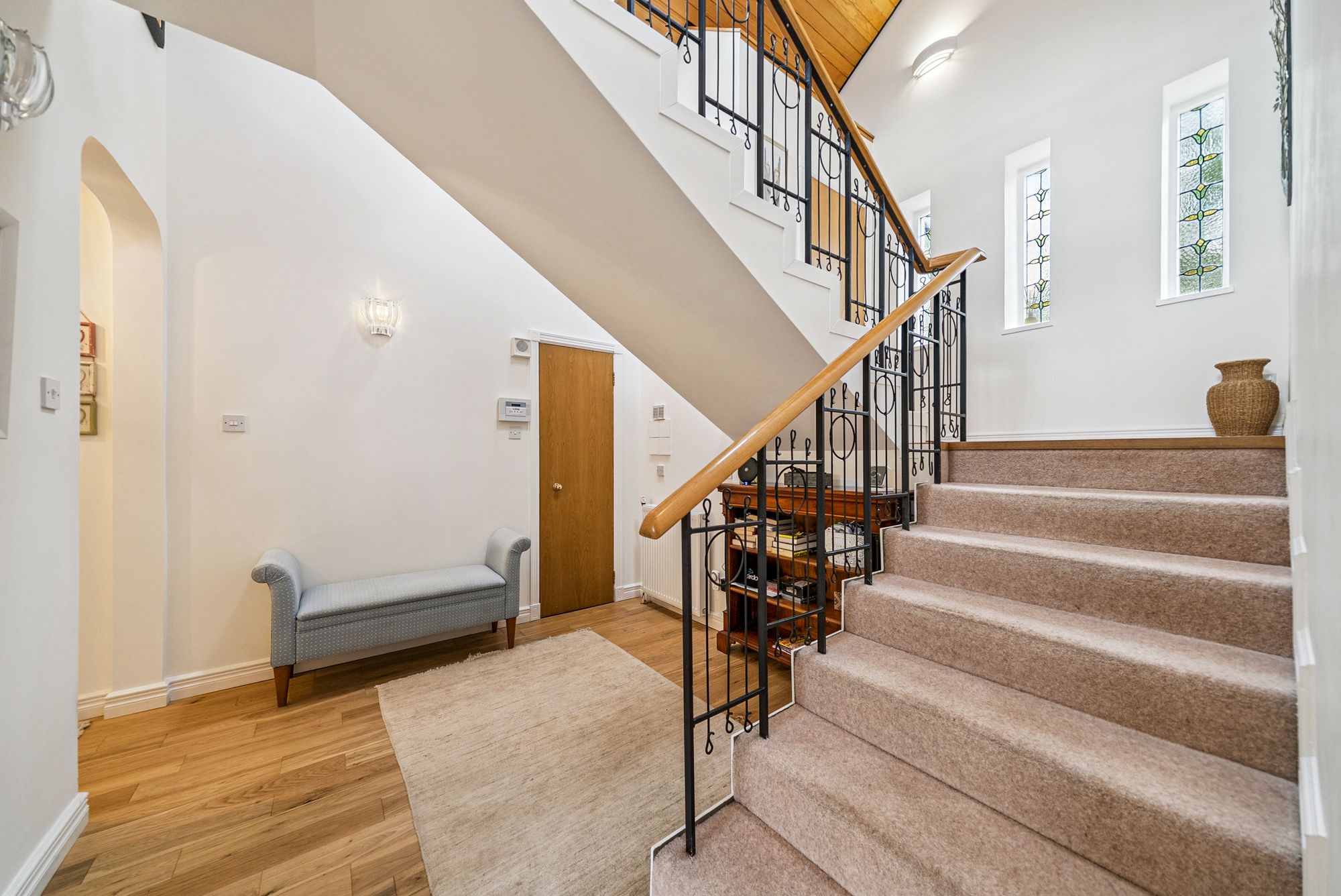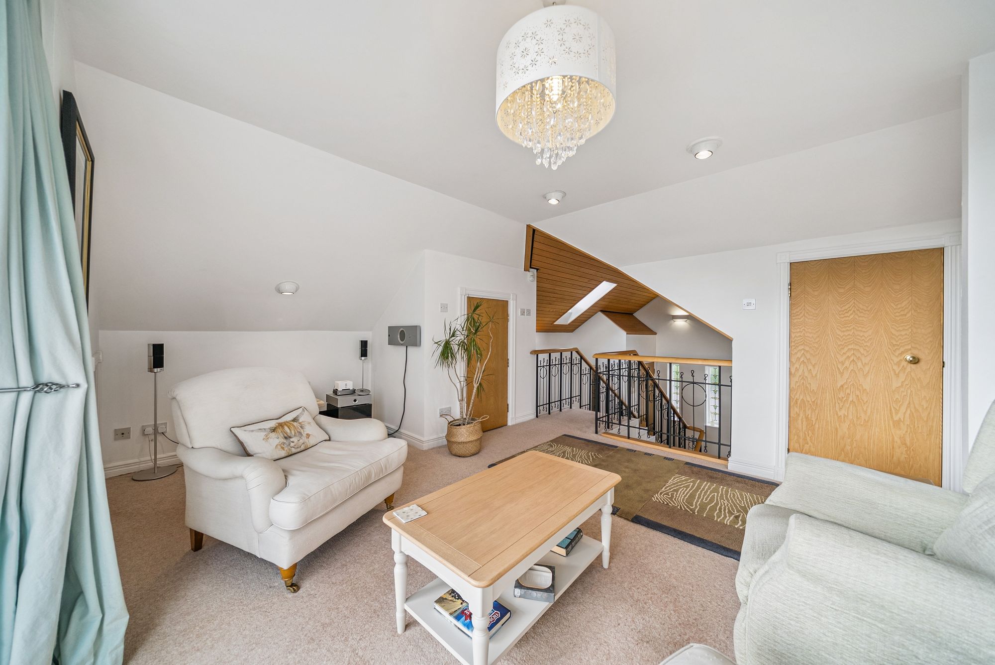 On entering the property, the entrance vestibule opens into a stunning double height reception hall with vaulted ceiling and with its “Velux” windows providing great natural light. From here stairs lead down to a lower hall which in turn gives access to a bright open plan and spacious lounge and separate dining room. The lounge area is cosy and sunken and enjoys a wood burning stove at its focal point. The dining room has a large picture window overlooking the courtyard and enjoys a south facing aspect. From the lounge there is a door leading through to the garage which as mentioned is a good size double with power and light laid on and with an electric door. Also, off the reception hall is a beautifully refitted modern and stylish kitchen which is well fitted with extensive units and a range of modern appliances. From here there is a door out to the courtyard garden. A hallway leads from the main reception hall to two double bedrooms, with the master bedroom overlooking the courtyard garden and with a full run of wardrobes along one wall and with its own ensuite bathroom which is modern and has recently been refitted. There is also a modern refitted shower room on this level. Moving onto the upper accommodation, a grand staircase ascends to a stunning, bright and open sitting area which takes in the best views in the house and gives access to eaves storage, a built-in cupboard and an additional strongroom. To one side of this space is an additional and spacious double bedroom.