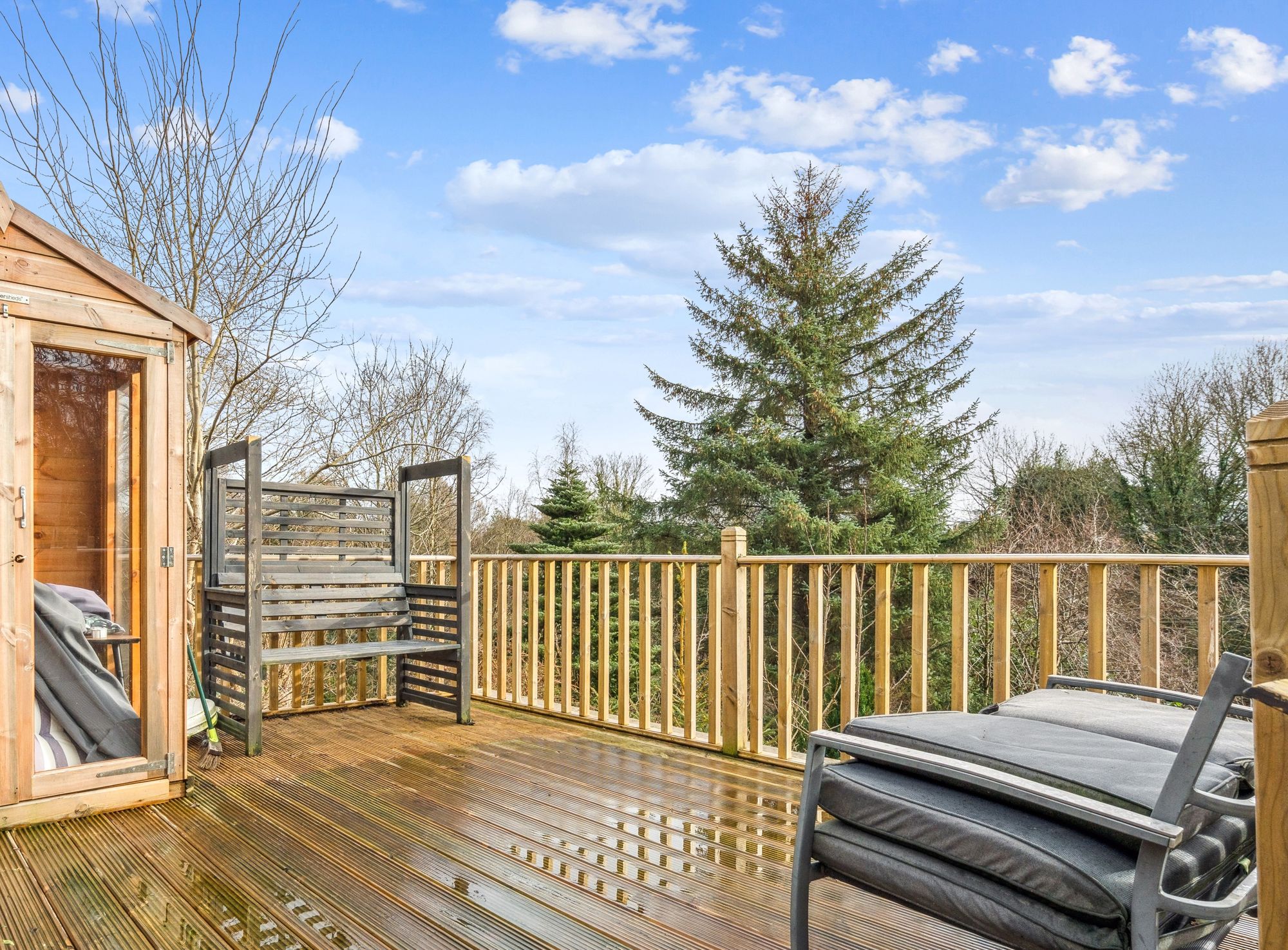 Externally, the property enjoys substantial garden grounds that wrap around the house and are enclosed by a combination of brick walls, hedging, and timber fencing, providing both privacy and security. Several timber decking areas are incorporated throughout the garden, creating ideal spots for outdoor dining, entertaining, or simply enjoying the surroundings. A driveway to the front provides off-street parking and leads to a single integral garage, adding further convenience and storage.