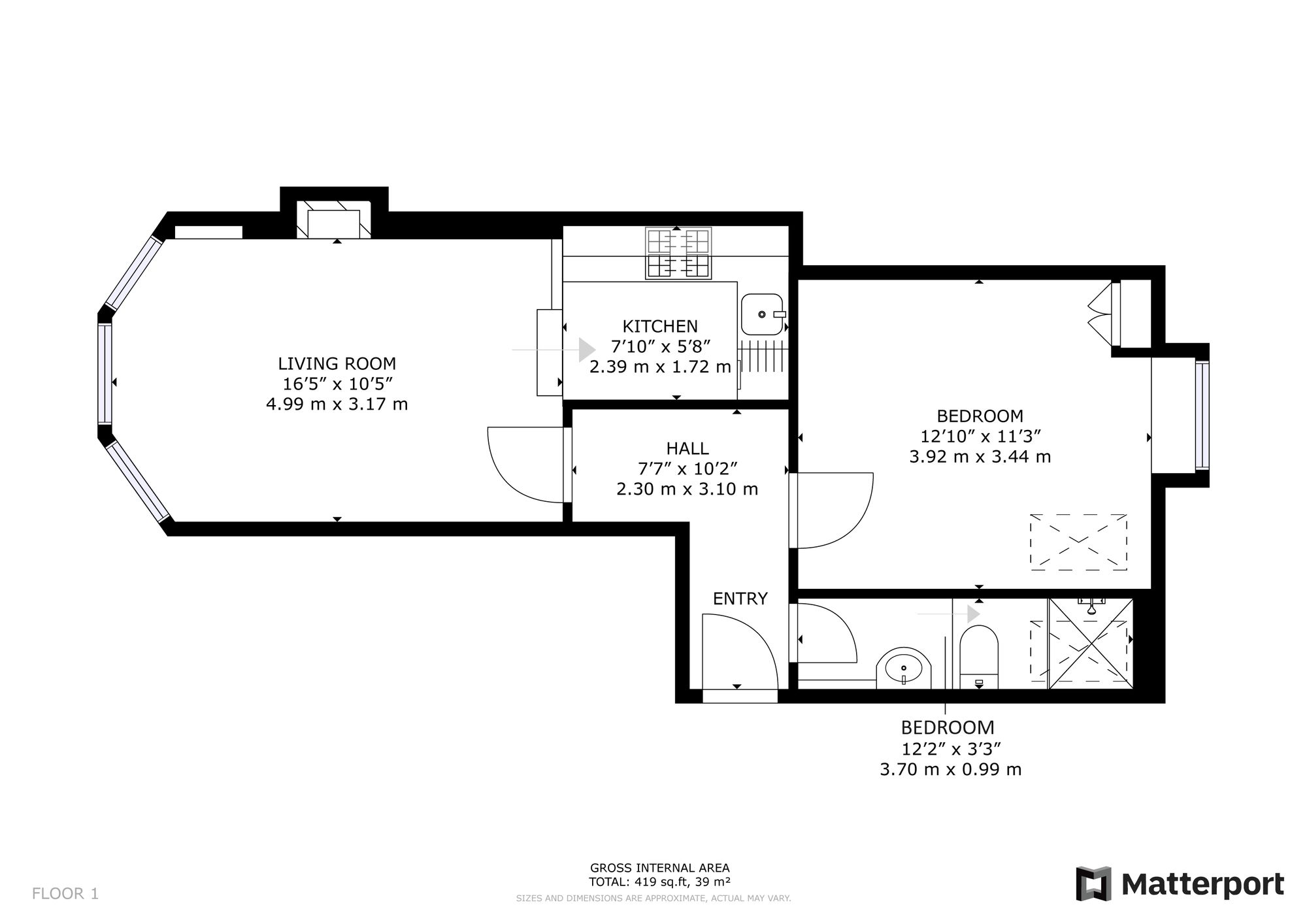 The attached photographs, floor plan and HD video tour will give an indication to the size and layout of the flat. However, in brief the accommodation extends to; bay windowed living room with space for dining and kitchen off, spacious double bedroom with built in storage, and a tiled shower room with enclosed cubicle.