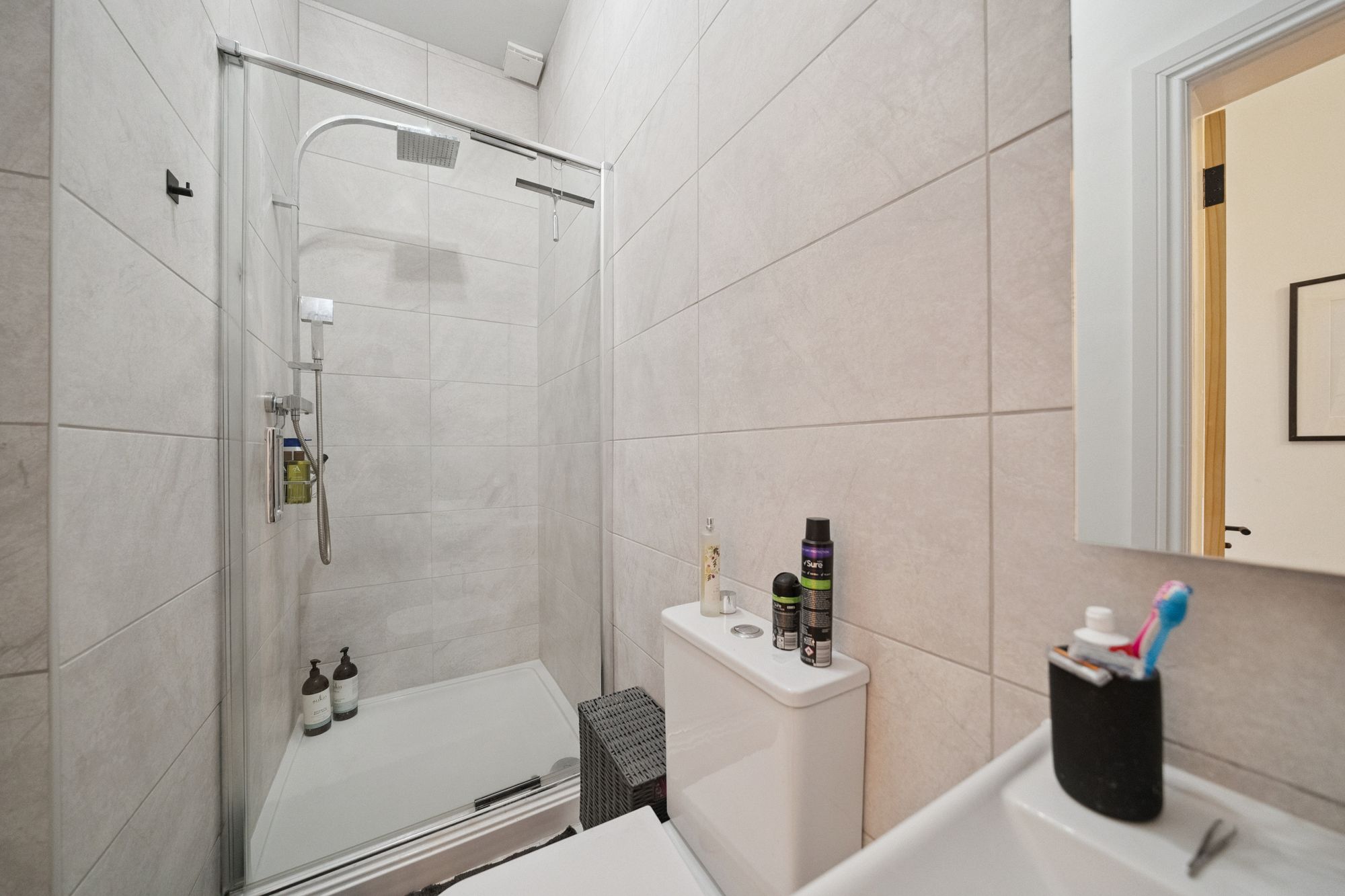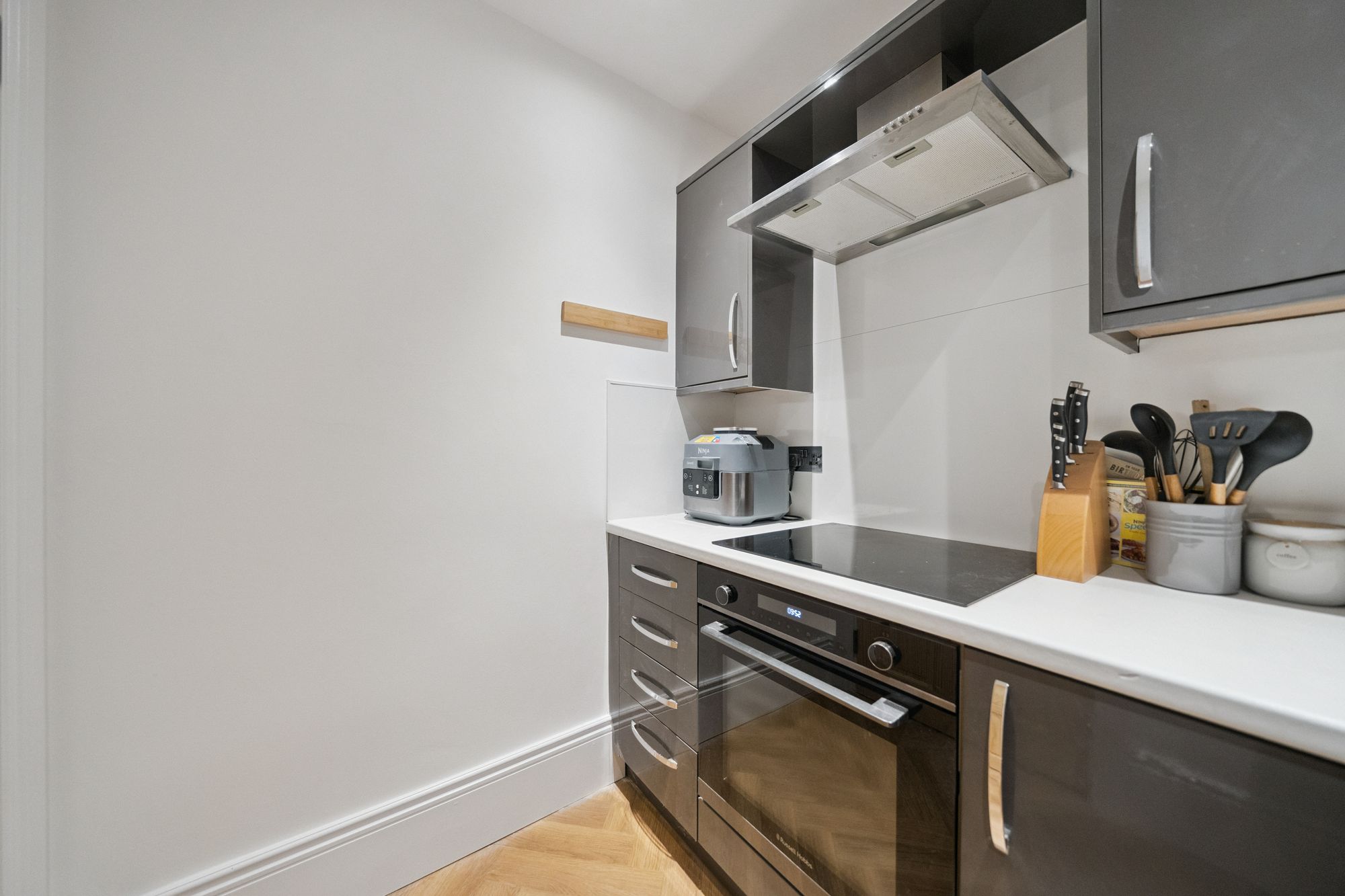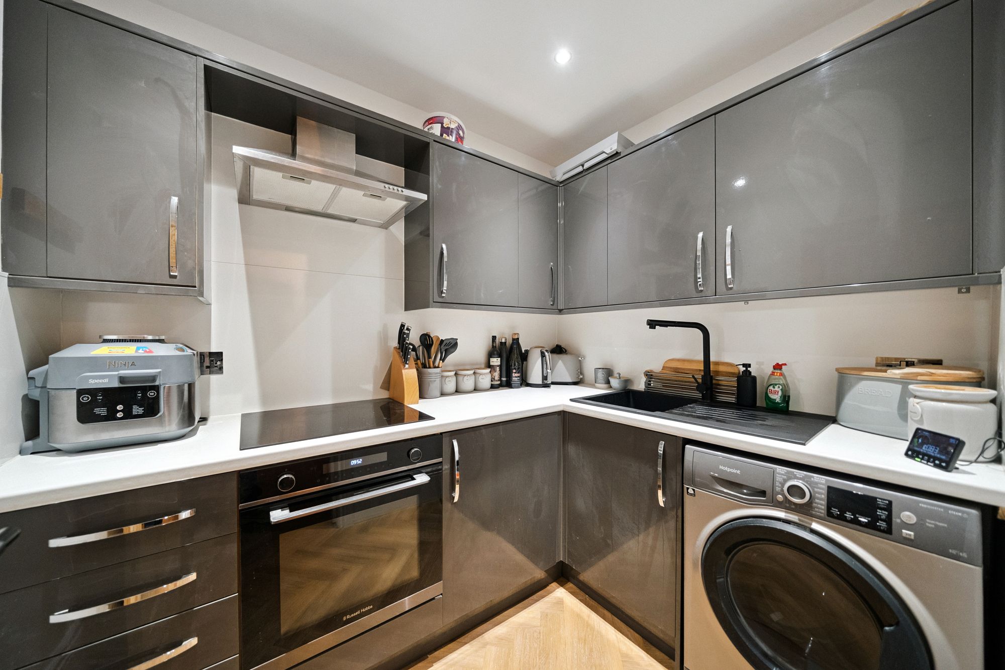 The modern kitchen is particularly impressive, complete with sleek floor-to-ceiling units providing excellent storage, complemented by spot lighting and a clean, streamlined finish. The principal bedroom is a spacious double with a useful built-in cupboard, while the second bedroom is also a well-proportioned double, offering flexibility as a guest room, home office or additional sleeping accommodation. The accommodation is completed by a contemporary tiled bathroom fitted with a shower.
