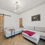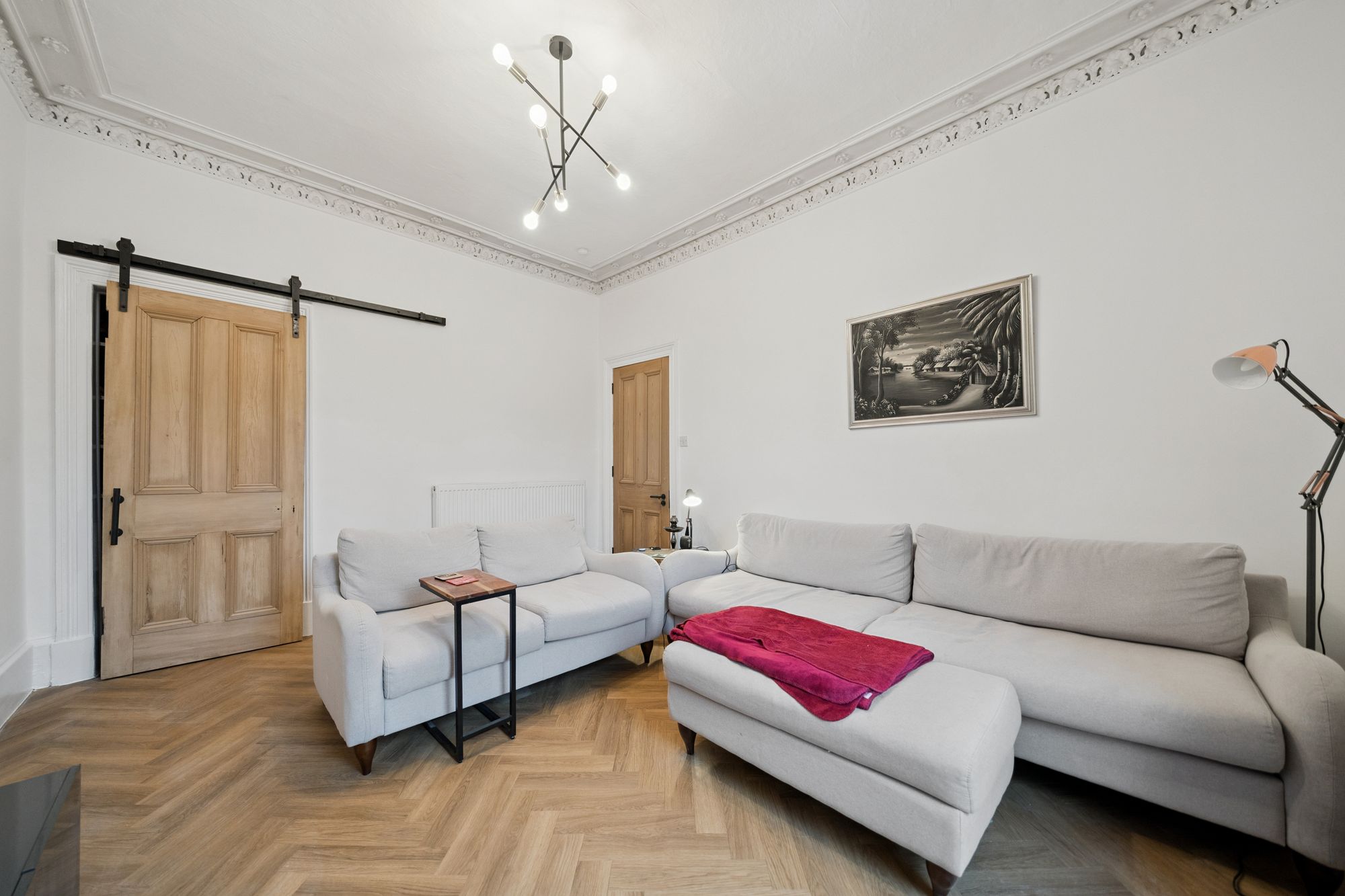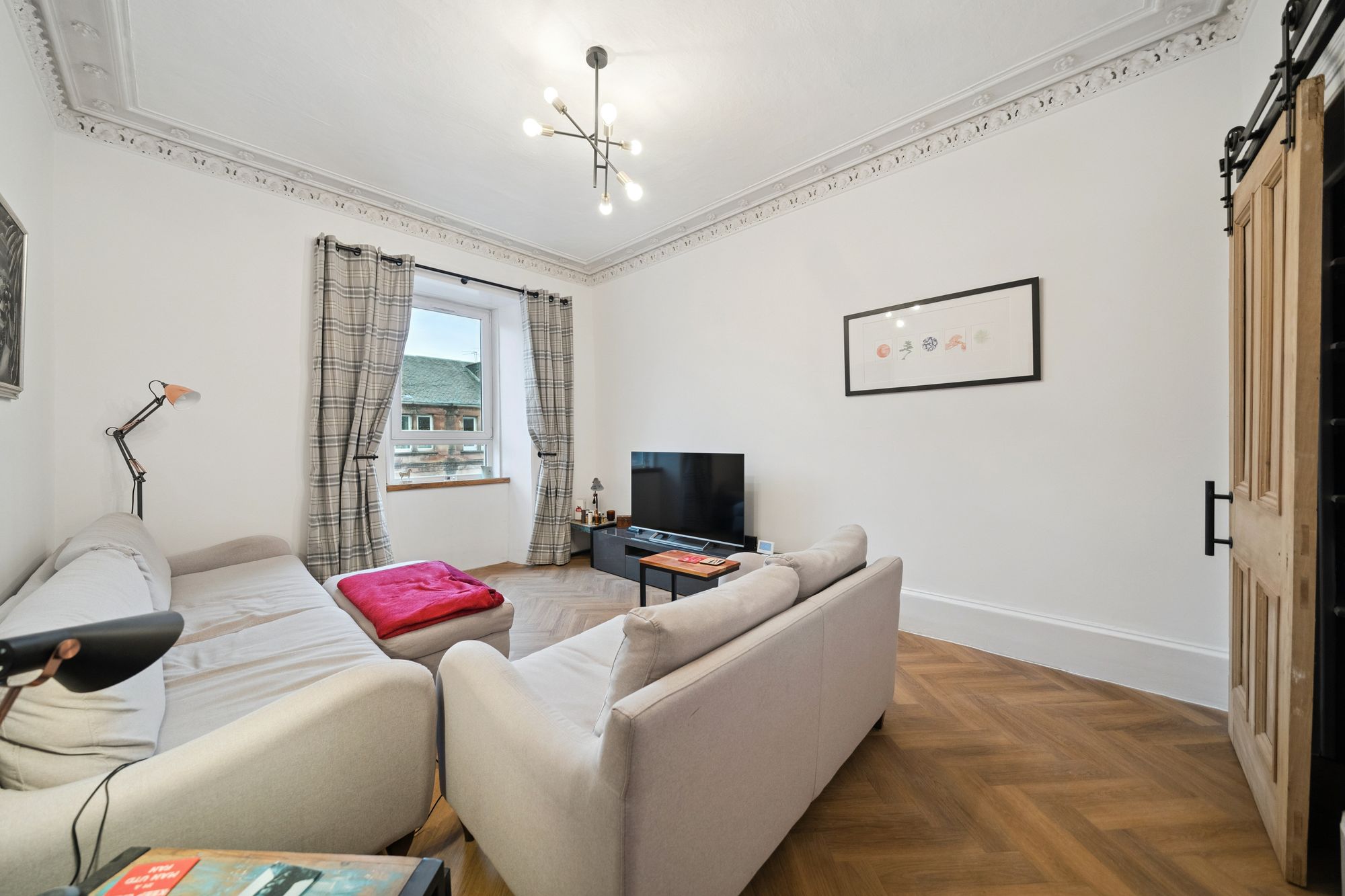 Accessed via a secure door entry system into a well-maintained communal close, the apartment opens into a welcoming reception hall which sets the tone for the stylish interior beyond. The generous living room is flooded with natural light from a large double-glazed window and retains charming period character with ornate cornicing, seamlessly blending traditional features with contemporary décor.