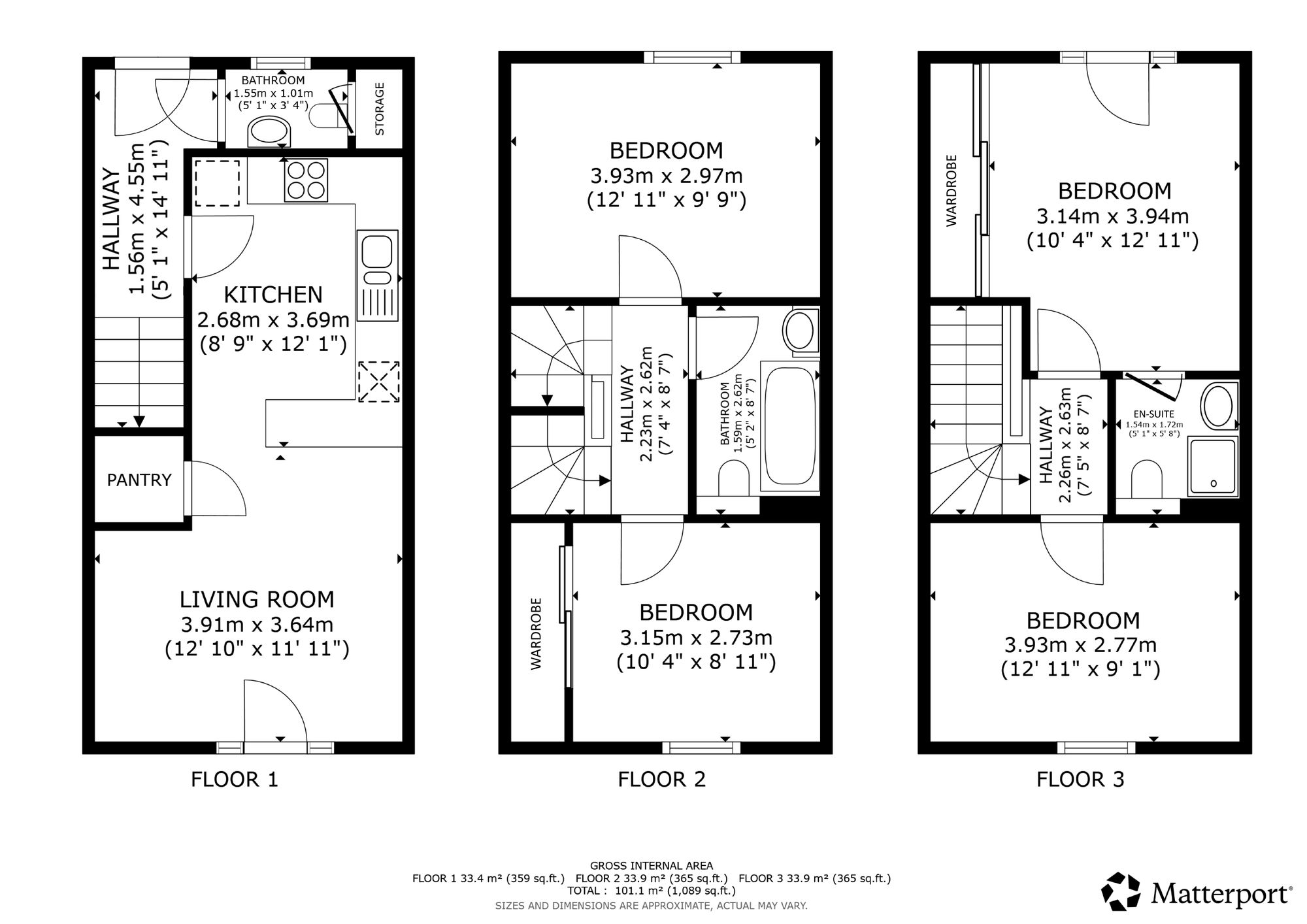 The attached photographs, floor plan and HD video tour will give an indication to the size and layout of the house. However, in brief the accommodation extends to; welcoming entrance hallway with w/c off, an open plan living/dining/kitchen with a door leading to the back garden. The kitchen itself has base and wall mounted units with appliances, tiled splash back and breakfast bar. On the first floor there is a spacious double bedroom with built in wardrobes, a main bathroom with three piece and shower over the bath, and another living room, which is currently being utilised as a bedroom. On the top level there is a hallway which benefits from a sun tunnel which allows an abundance of natural light, two double bedrooms, with the principal room benefitting from built in wardrobes an en-suite shower room and a Juliet balcony. The back garden is a fantastic size and is made up of a section of artificial grass and a patio area.