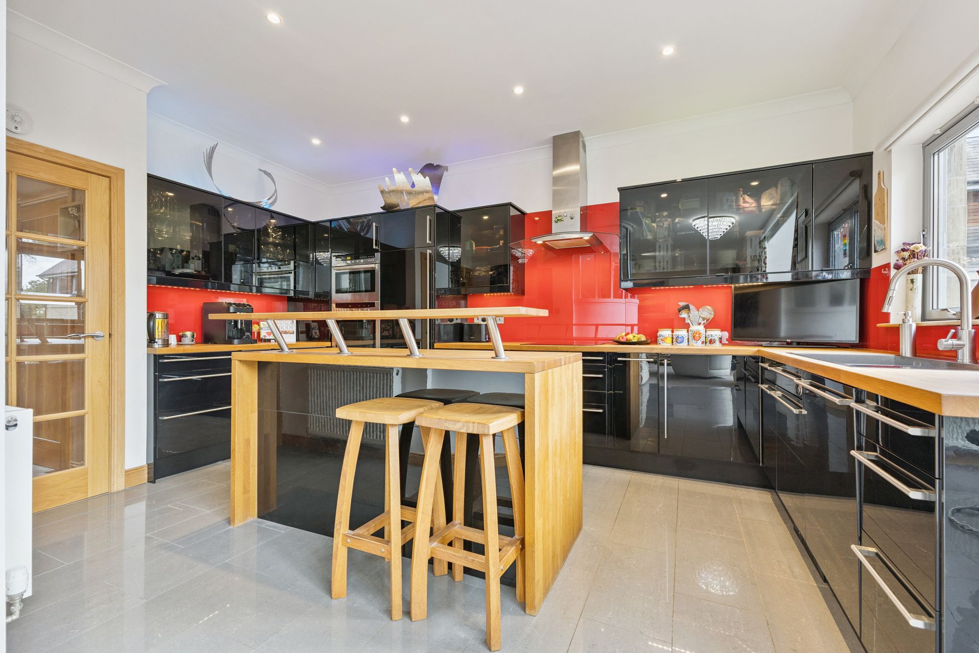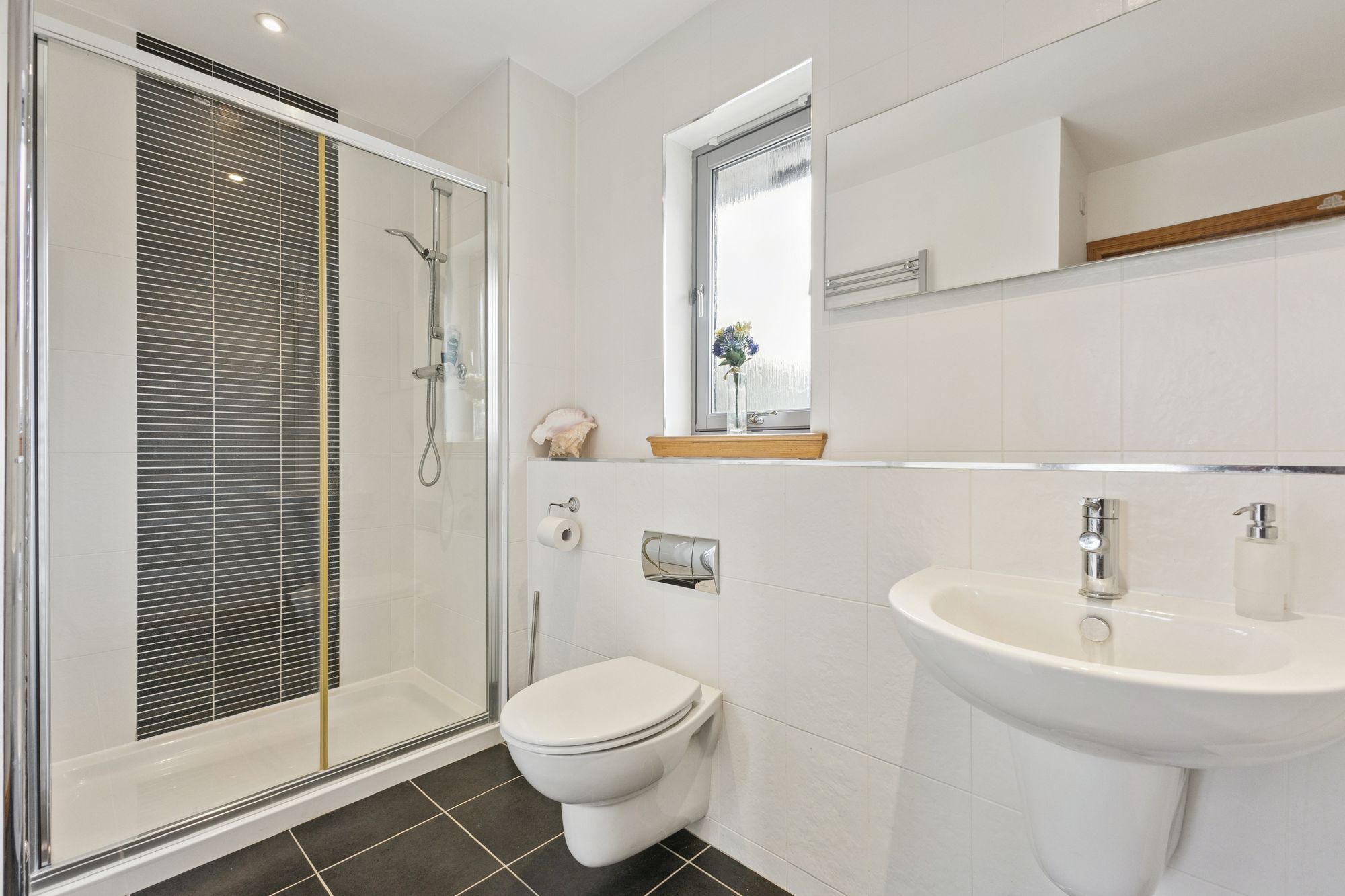 Upstairs, a feature gallery landing provides access to all upper rooms. The master bedroom benefits from a stylish en suite shower room, while the guest bedroom also enjoys its own private en suite. A third bedroom offers flexible use as a child’s room, home office, or guest accommodation, and a contemporary family bathroom serves the remainder of the upper floor.