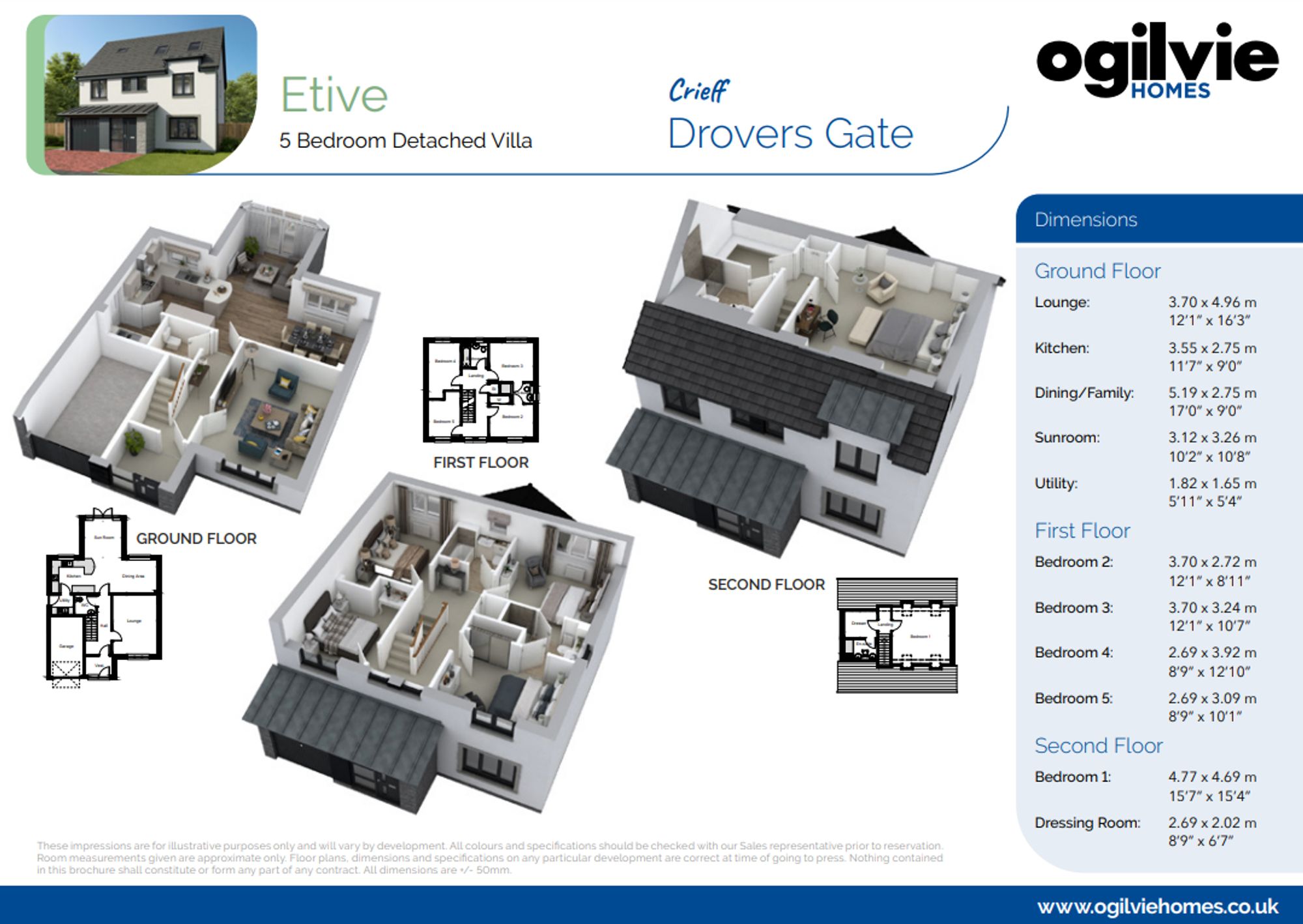The Etive is an impressive five bedroom detached villa with accommodation compromising; welcoming reception hallway, front facing sitting room, cloakroom WC, stylish fully fitted dining kitchen with separate utility room and additional family room with French doors to rear garden. On the first floor there are four good sized bedrooms with bedroom 1 offering en-suite shower. Upstairs on the second floor her is a principal bedroom with ensuite and dressing room. Double integral garage.