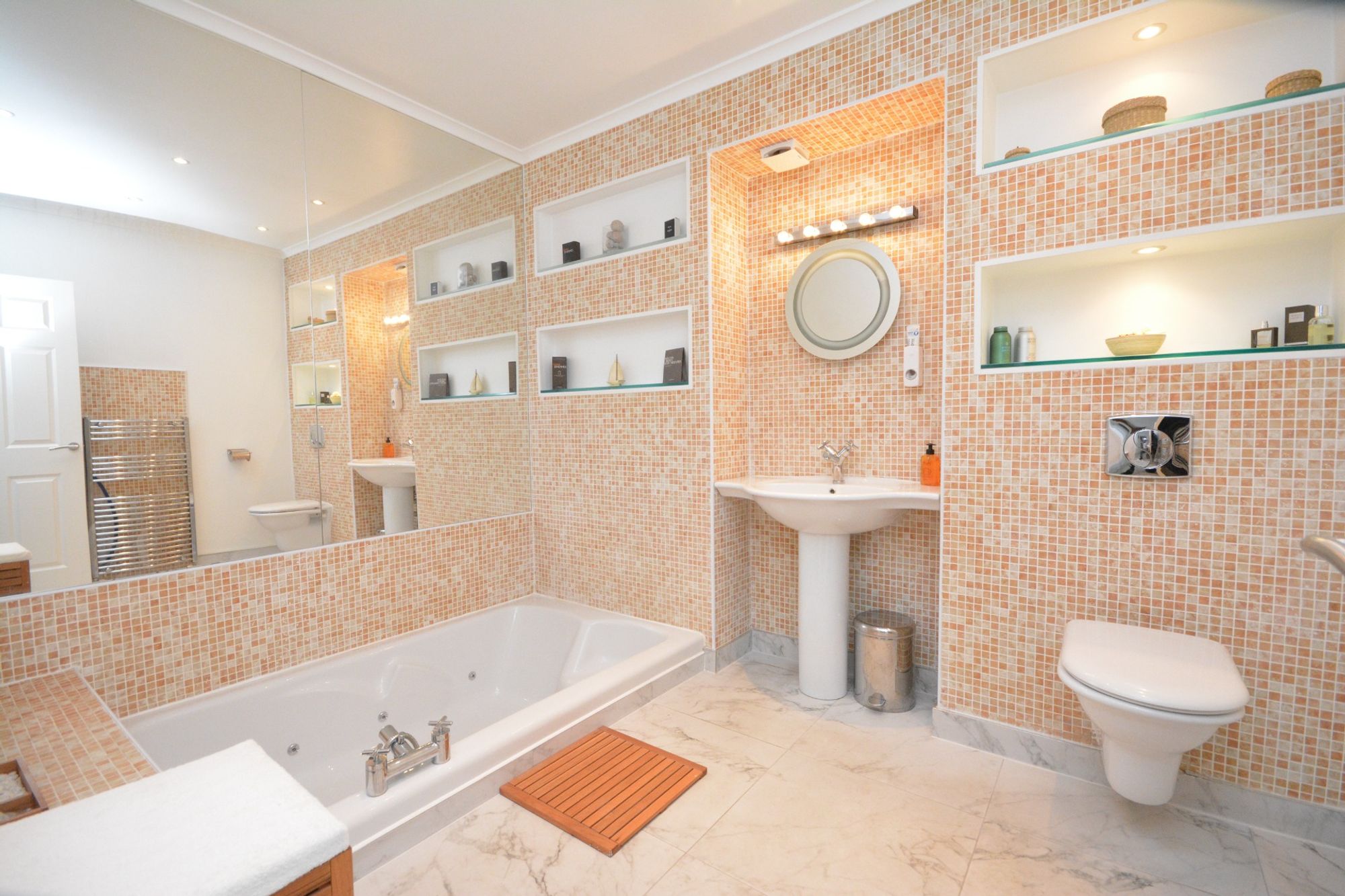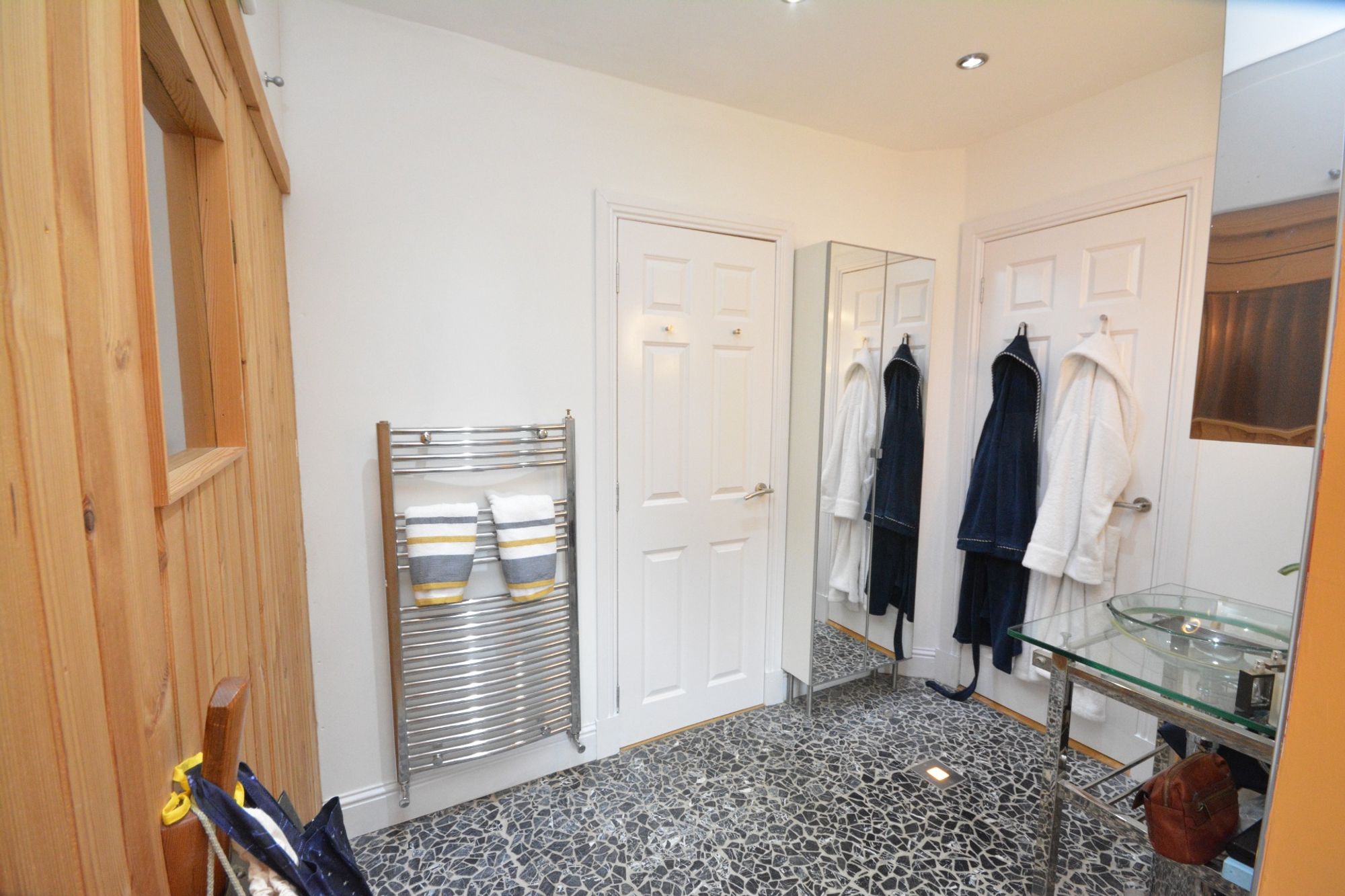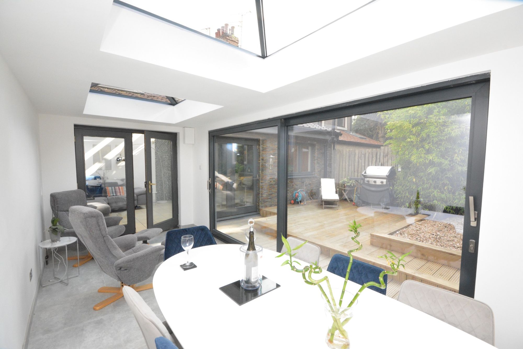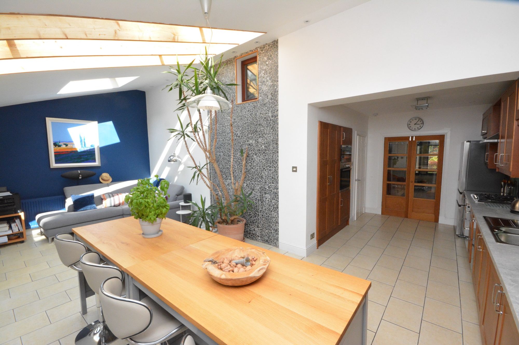 Skilfully extended, the property provides particularly flexible accommodation formed over two levels. Access is through twin-leaf timber storm doors to a long reception hallway and stairway to upper apartments. The sitting room has a feature window with open aspect and focal point fireplace. The kitchen enjoys open plan access to an impressive dining/family room with feature velux and fixed roof lights offering wonderful natural light. The property is offered for sale with stainless steel integrated and stand-alone appliances. Two sets of French doors allow separate access to both the sun deck and the wonderful garden room. The garden room extends to in excess of nineteen feet and has multiple windows, two roof super lantern roof lights and full-height glazed sliding doors leading to the sun deck. Bedroom four is a versatile downstairs apartment which could easily be utilised as a further public room if required. The lower level accommodation is completed by a generously sized and stylish bathroom complete with ceramic tiling, jacuzzi bath and porcelain carrara marble style tiled flooring.