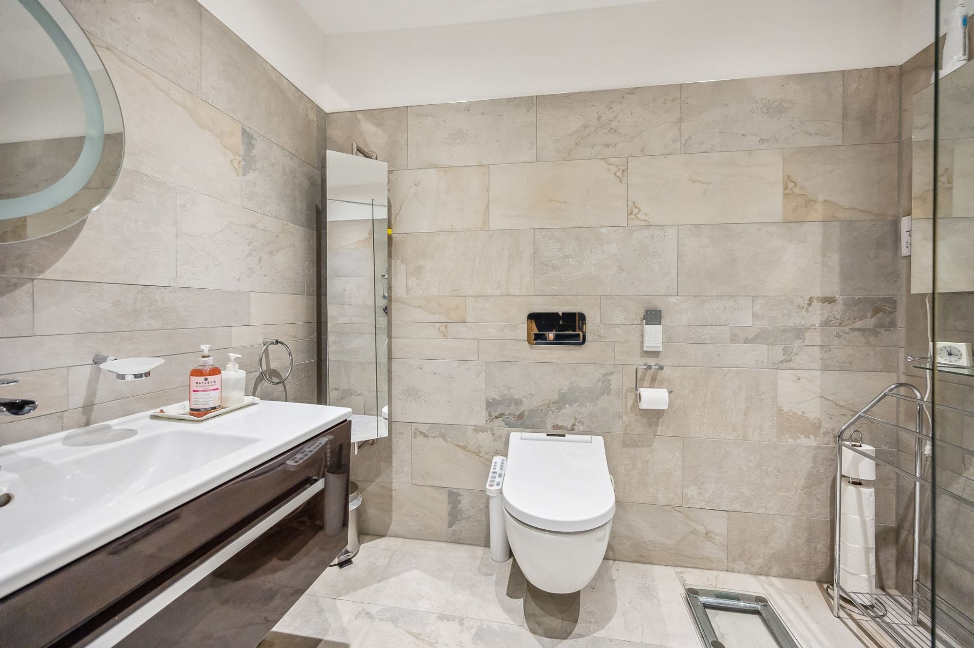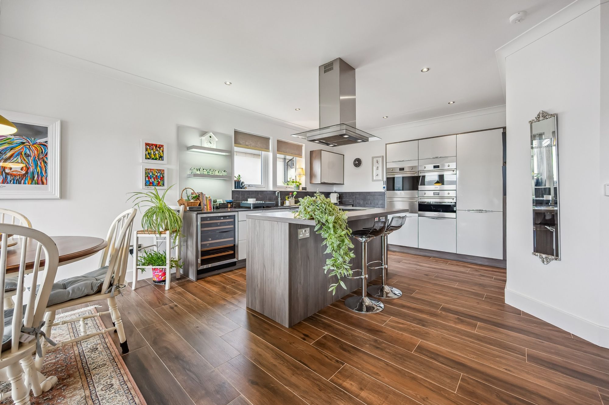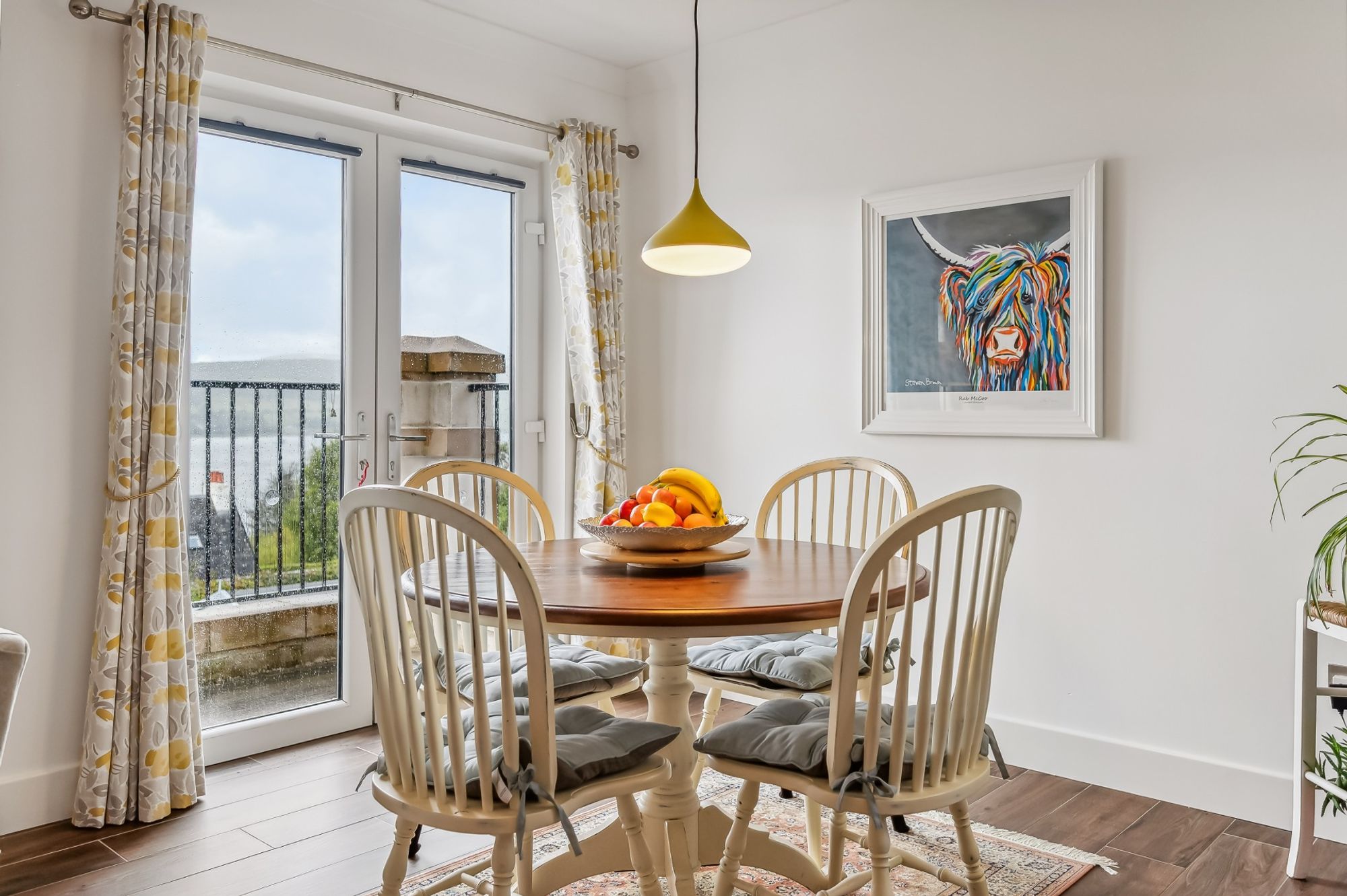 The interior is entered from the driveway through an arched front door and window formation, where a grand reception hall features a staircase to the lower level of the house. The reception hall is bathed in natural light and gives access to the main living accommodation on this level. Forming part of the reception area, to the rear is a large semi open plan formal dining room with loch views. To one side of the hall is the main lounge which is a striking room with a bay window to the front and french doors opening out to a balcony with views of the loch. A log effect living flame gas fire is in the centre. There is a beautiful and spacious cloaks/wc compartment off the hall and this is fitted with a bespoke vanity basin and wc, along with dado tiling. The heart of the home is the sizeable and ultra sleek, open plan kitchen, dining room and family area which has a beautiful tiled floor and windows and French doors out to another balcony with water views. The designer German kitchen features a large central island with breakfast bar set-up and a range of in-built appliances. Off the kitchen is a utility room, leading through to the garage.