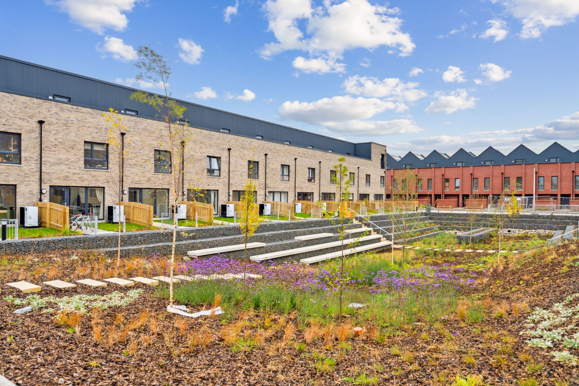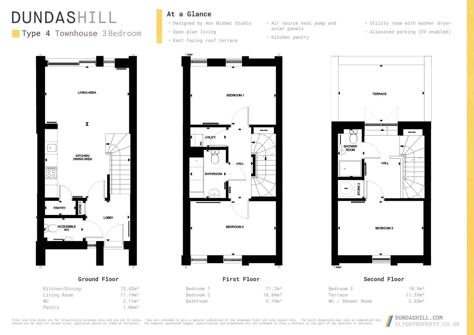 NOW AVAILABLE - SUSTAINABLE LIVING BY GLASGOW’S CANAL: An EPC A-rated contemporary 3 storey home designed only for Dundashill. Open plan living and kitchen to the ground floor, with a pantry space to the side. Large windows to the rear bring lots of daylight to the living space, which opens onto the garden studio. Separate entrance lobby with WC. On the first floor, you’ll find two double bedrooms, a bathroom and separate utility room with washer dryer. The top floor has a studio space comprising a double bedroom, shower room and area for home working, which opens onto the feature east facing roof terrace. A cupboard containing the hot water cylinder and storage space is positioned on this floor too.
