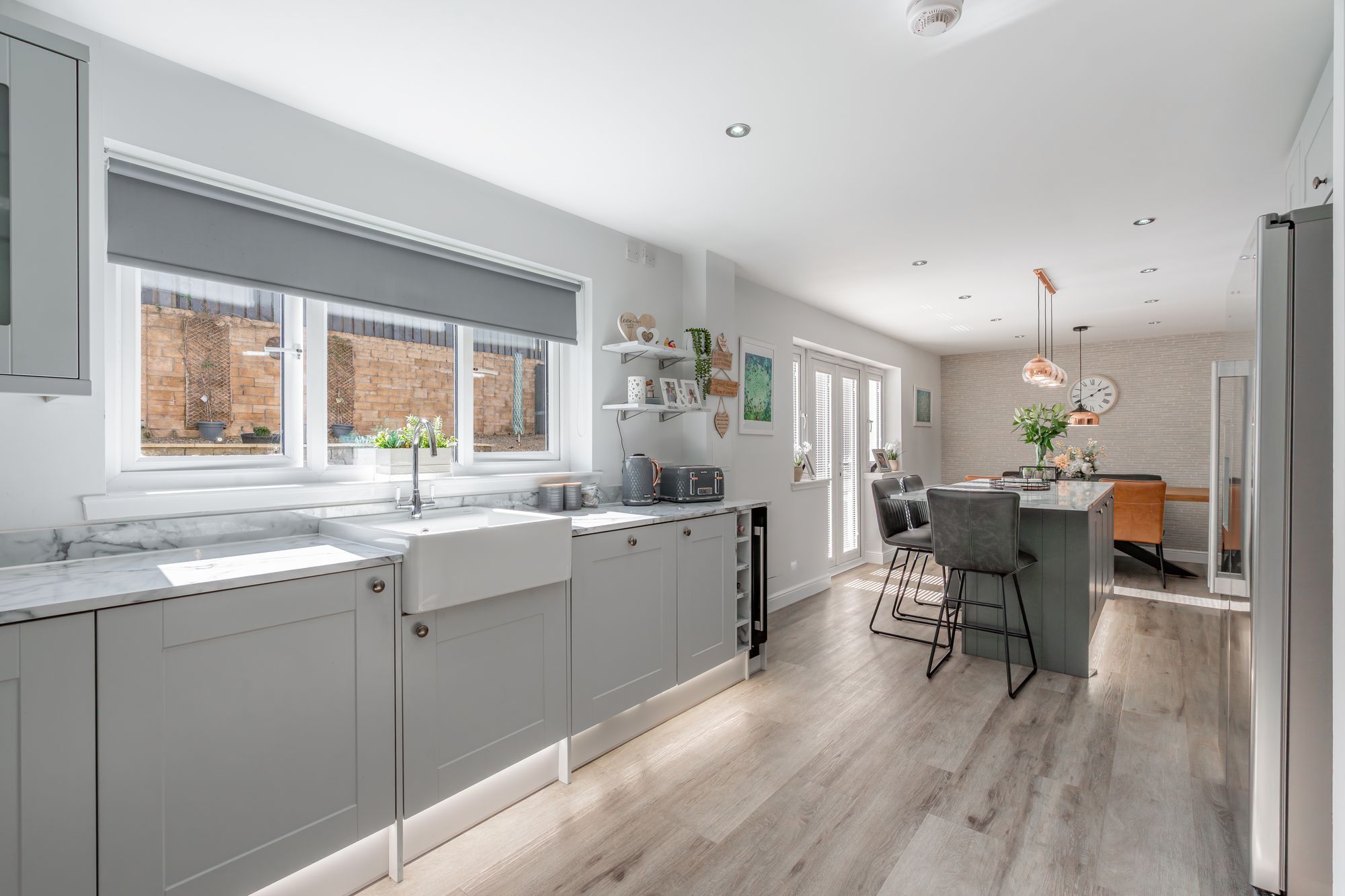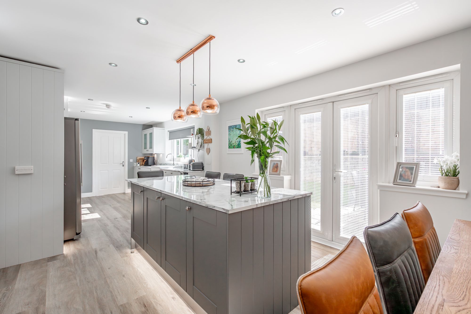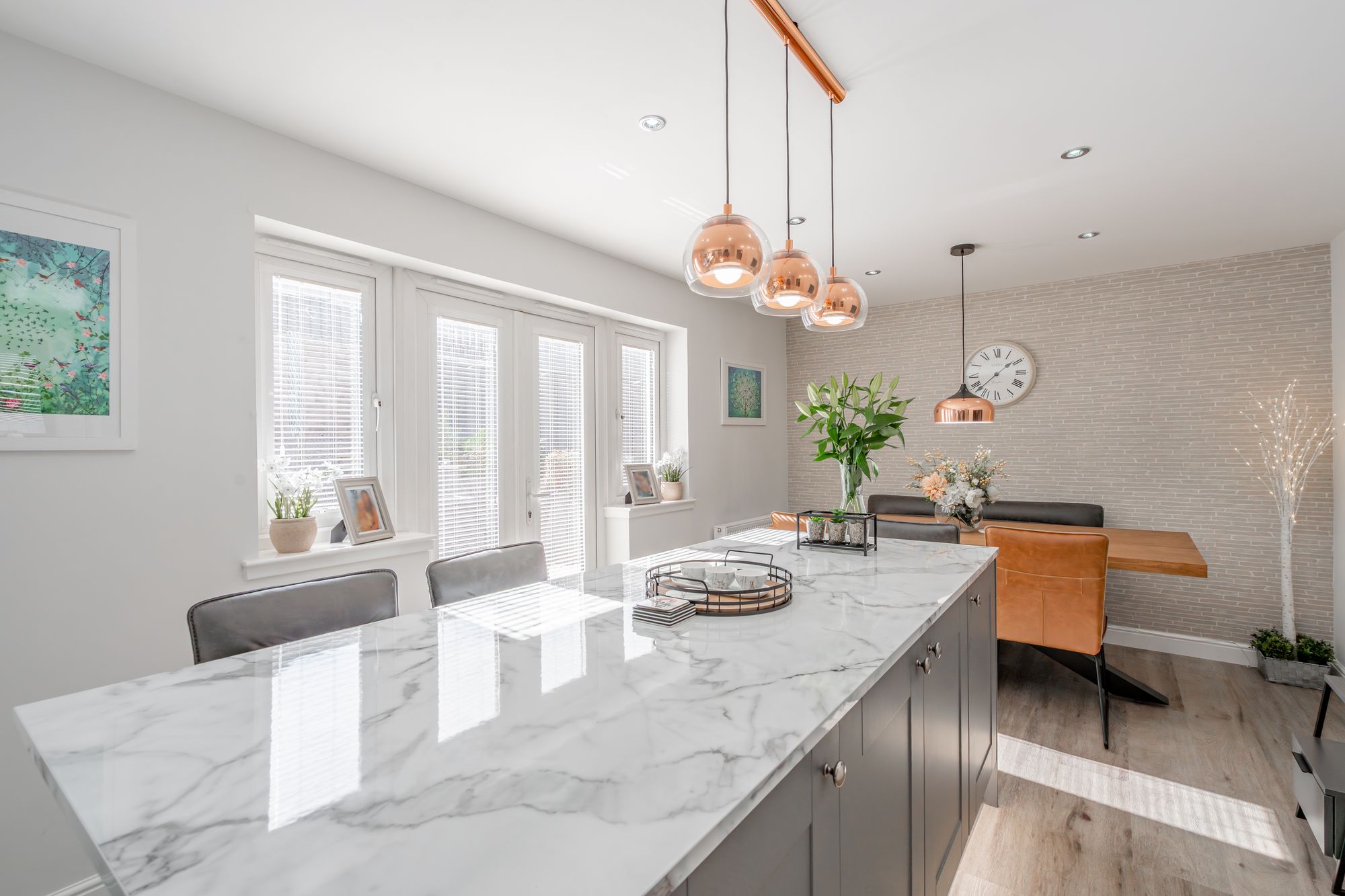 The ground floor accommodation is both spacious and versatile. A welcoming entrance hall sets the tone for the home and leads to a bright and comfortable lounge, ideal for everyday living. A separate sitting room provides additional flexible space, perfect for a formal dining room or family room. The kitchen and dining area is well appointed and thoughtfully designed, offering an excellent space for family meals and entertaining, with direct access to the rear garden. A separate utility room adds further practicality, while a conveniently located ground floor toilet completes the lower level.