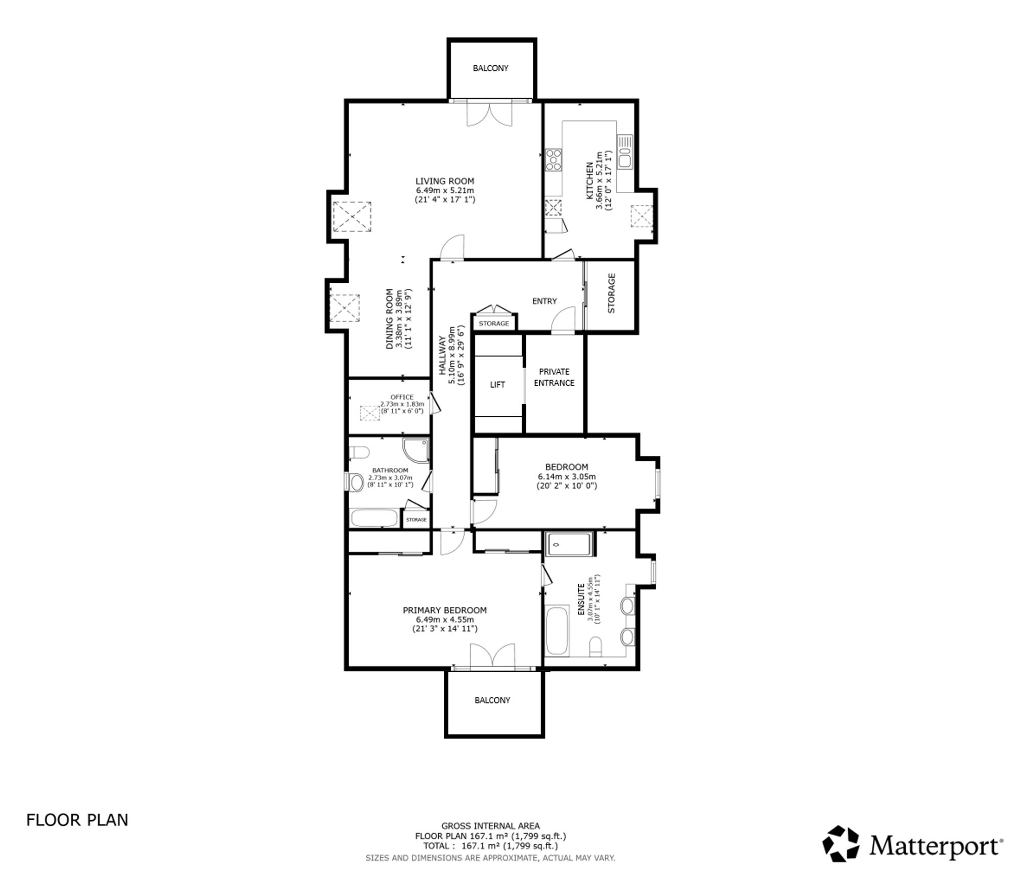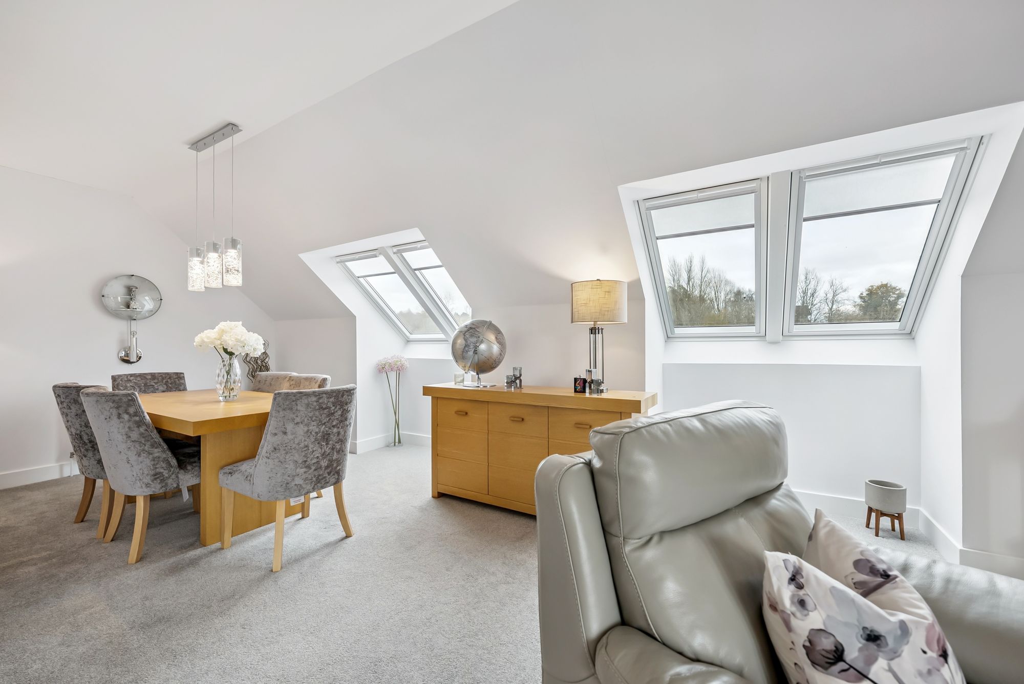 Internally, the accommodation has been thoughtfully designed to maximise light, space, and flow. Accessed via a carpeted communal hallway, the property enjoys the luxury of private lift entry opening into its own welcoming foyer. A bright reception hallway leads through to an impressive open-plan lounge and dining area, illuminated by Velux windows and featuring French doors that open onto a private South facing balcony. The adjoining kitchen is finished to an excellent standard, fully fitted with high-quality integrated appliances and a casual breakfasting area. There is also a separate study or home office, ideal for remote working or quiet reading.