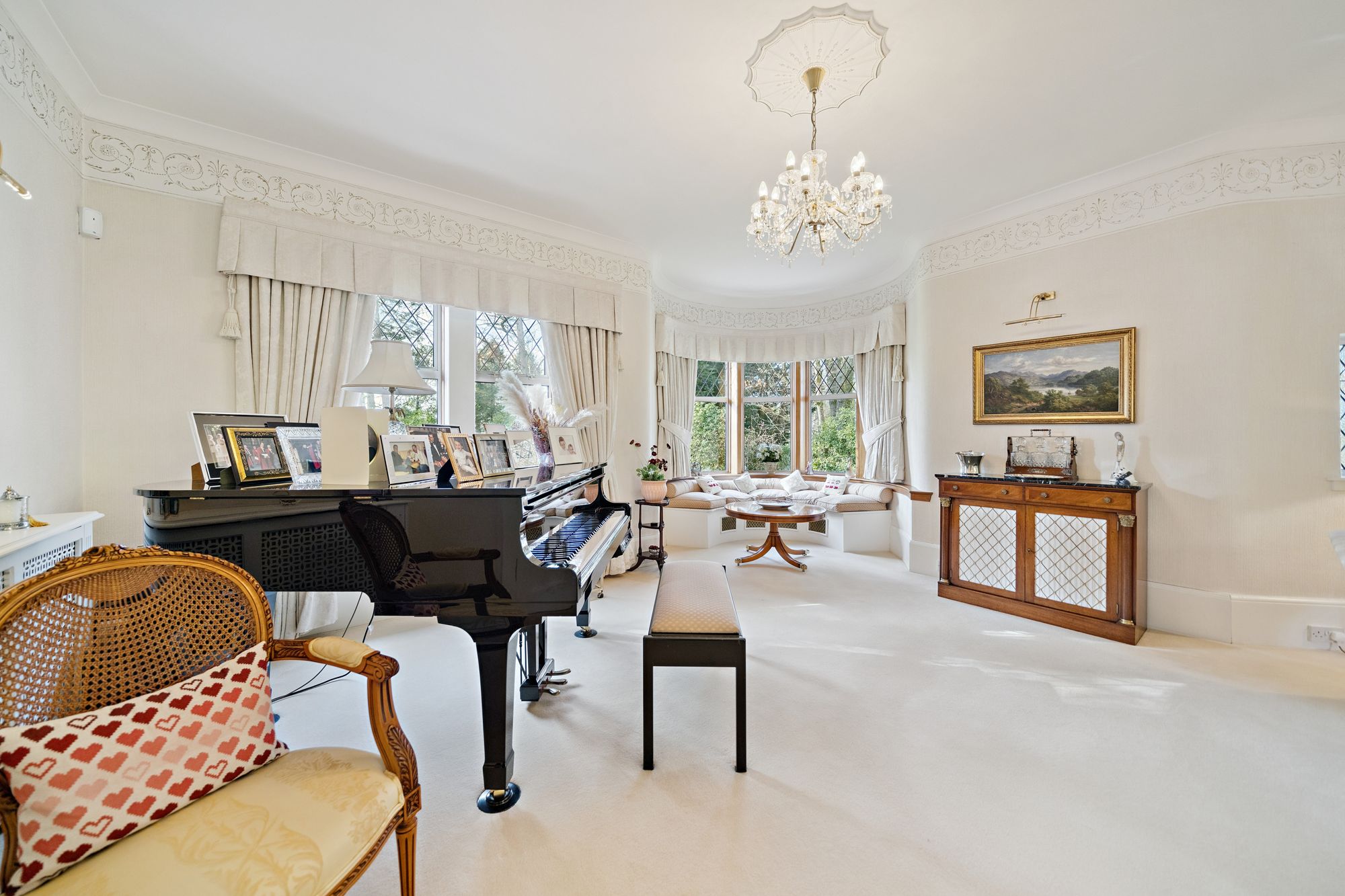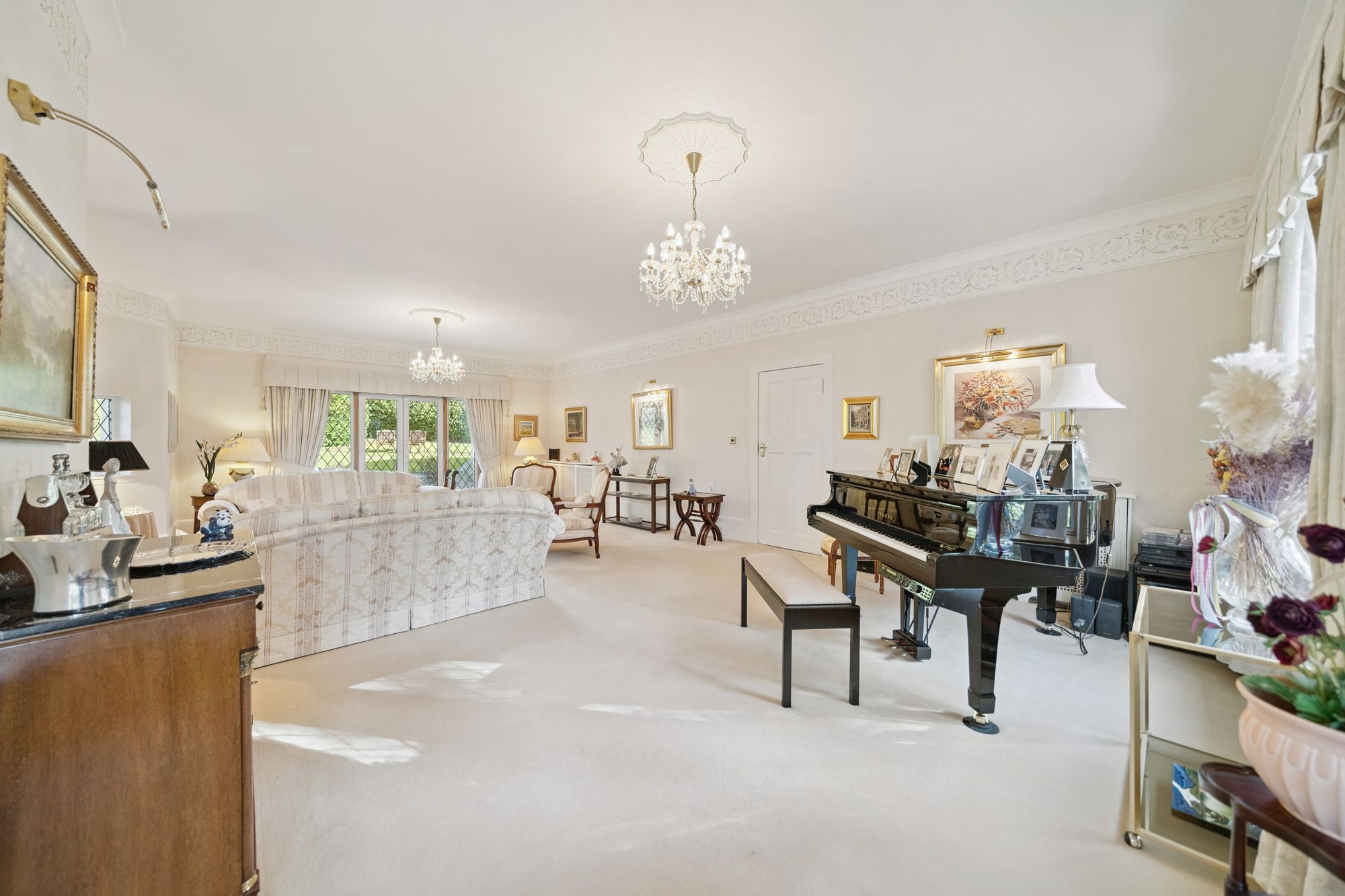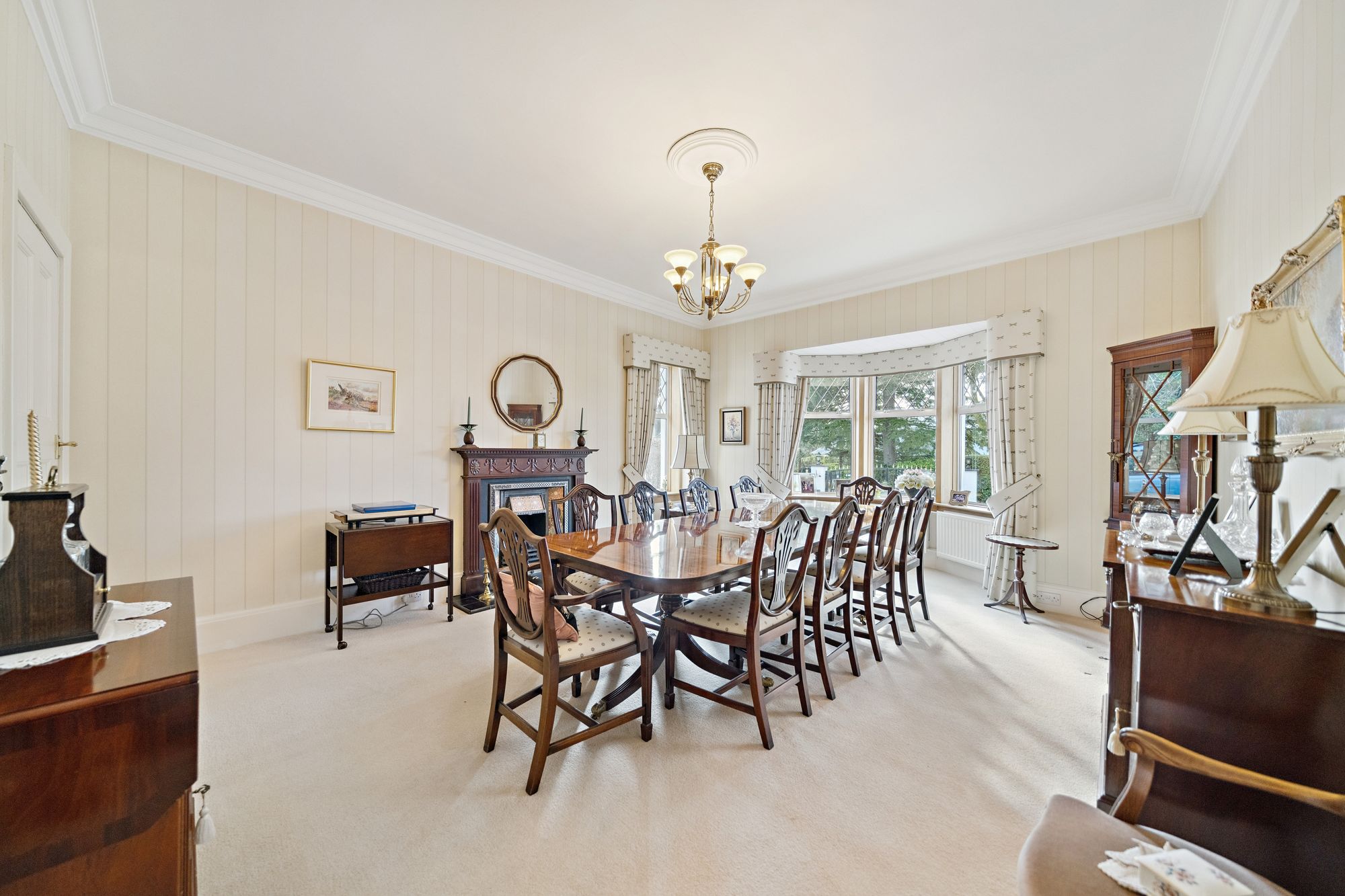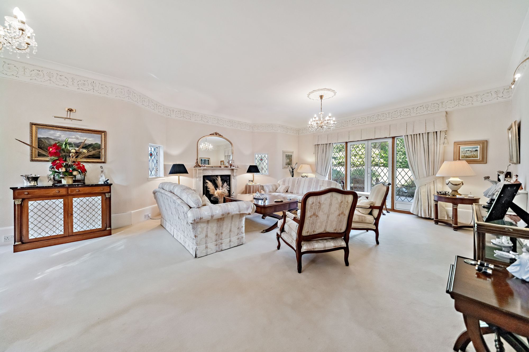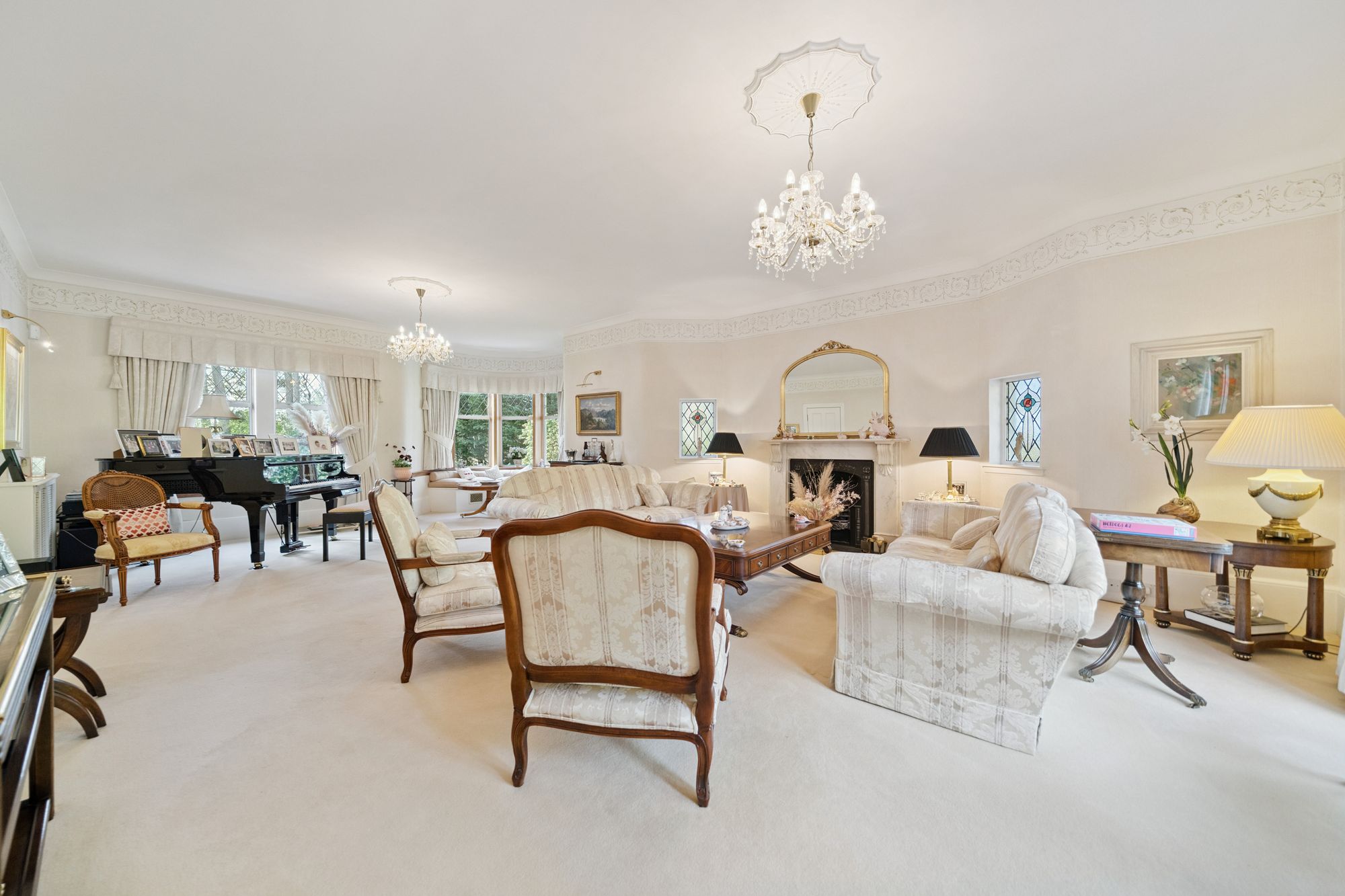 The house is double glazed throughout with the exception of the stained-glass window formation in the entrance hallway and staircase, has gas central heating and, as the floorplan shows, has a number of fireplaces and numerous doors providing direct access to the gardens.