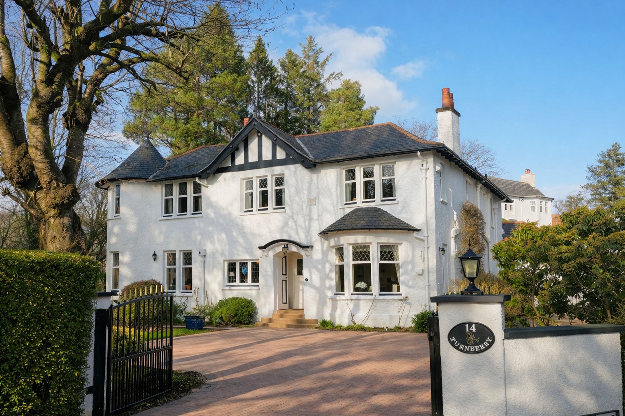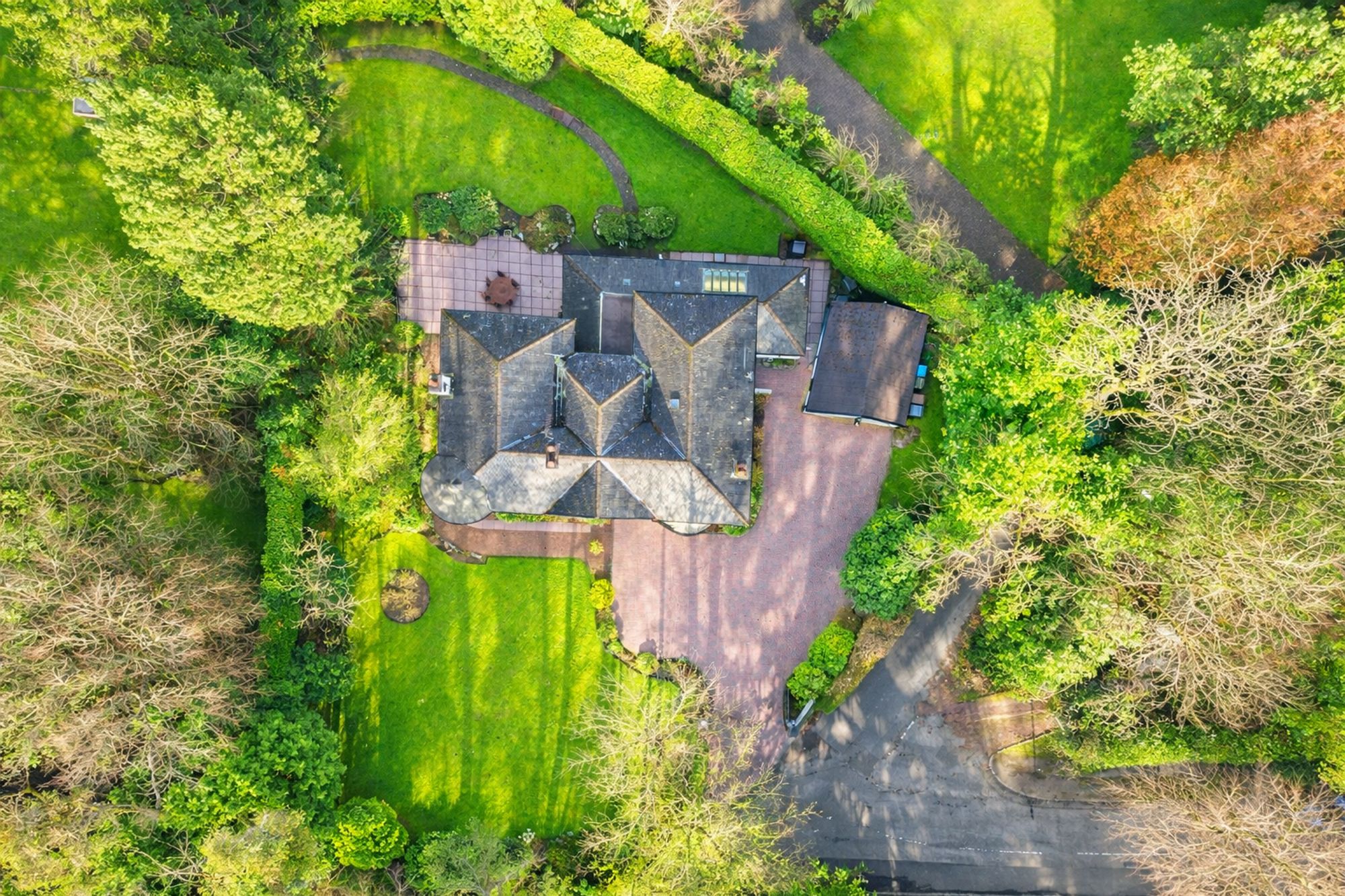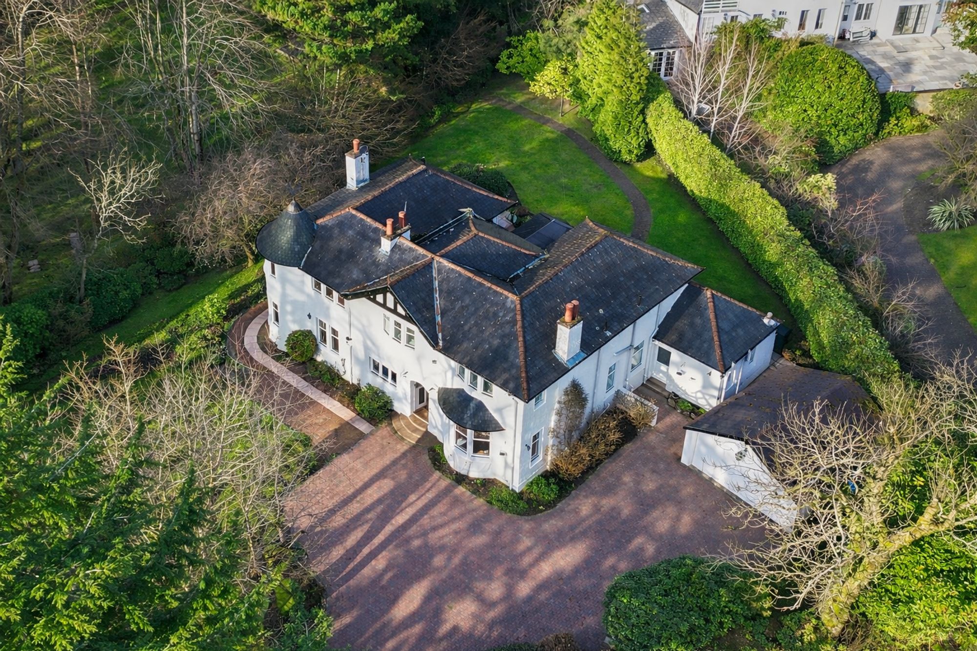 The property is screened to the front by a large hedgerow and access is through via remote electric gates leading into a broad monobloc driveway, allowing private parking for multiple vehicles with access to the double garage. As our videos and photographs show, the house is surrounded by exceptional gardens which are maintained to the highest standard. Patios and intimate seating areas are interspersed with manicured lawns, pathways and a superb variety of established trees and shrubbery; all of which combine to create the most idyllic setting.