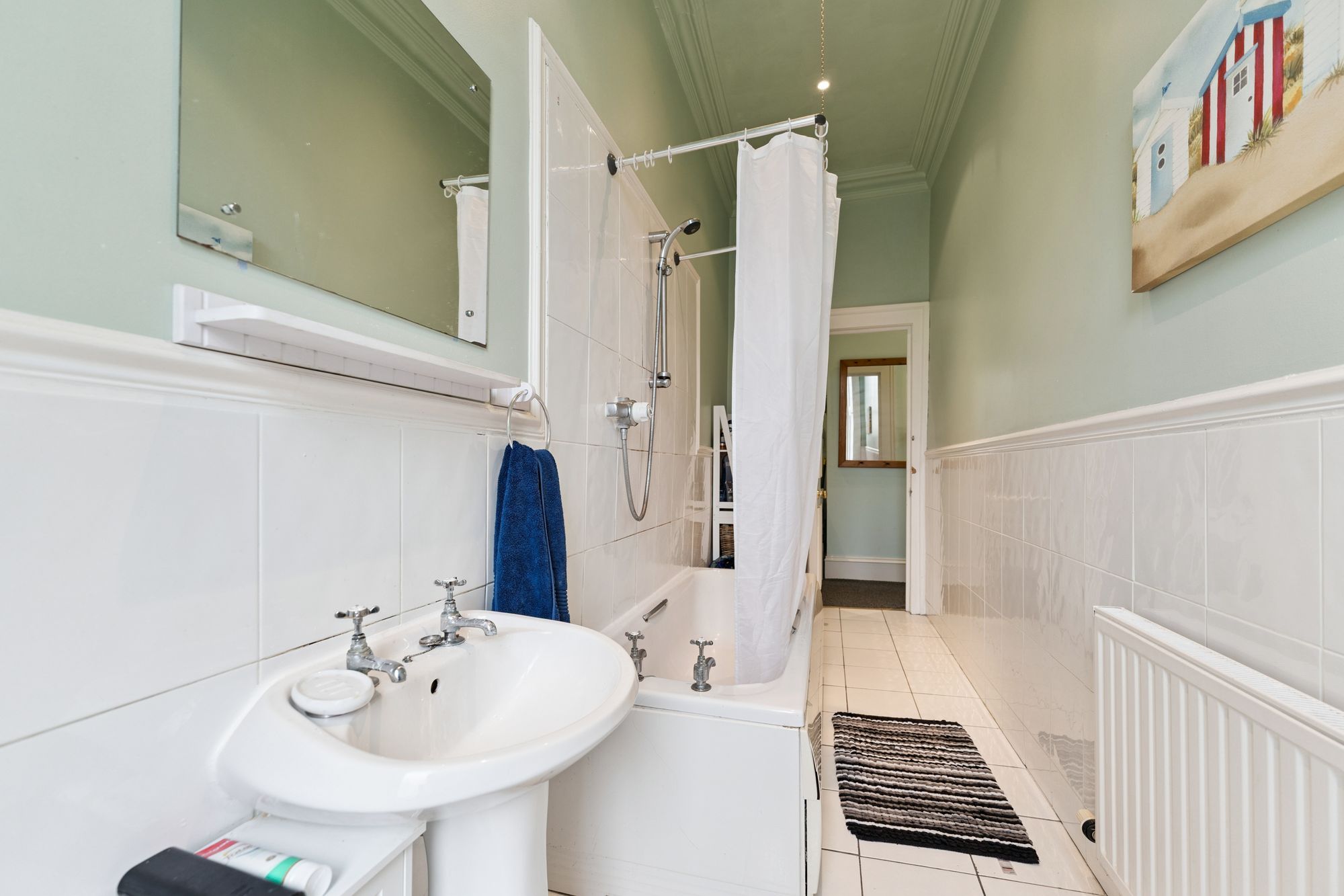 The building itself is accessed via a secure entry intercom system and all common areas are found in excellent condition. The attached photographs, floor plan and HD video tour will give an indication to the size and layout of the flat. However, in brief the accommodation extends to; welcoming entrance hallway, a South facing, bay windowed living room with ceiling cornice and an open outlook. There is a dining sized kitchen with base and wall mounted units,  two double bedrooms and the accommodation is completed by a tiled bathroom with three piece suite and shower over the bath.