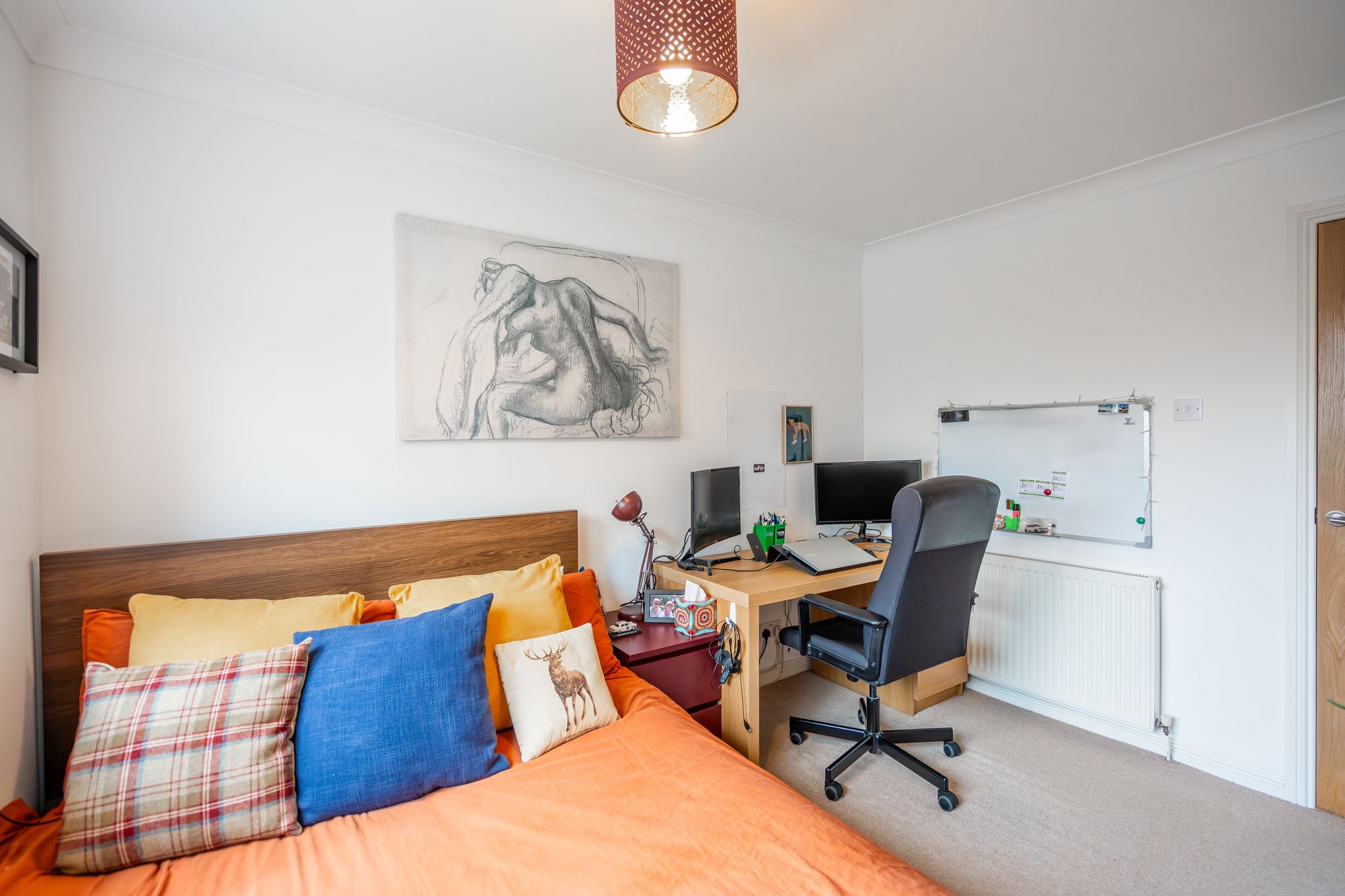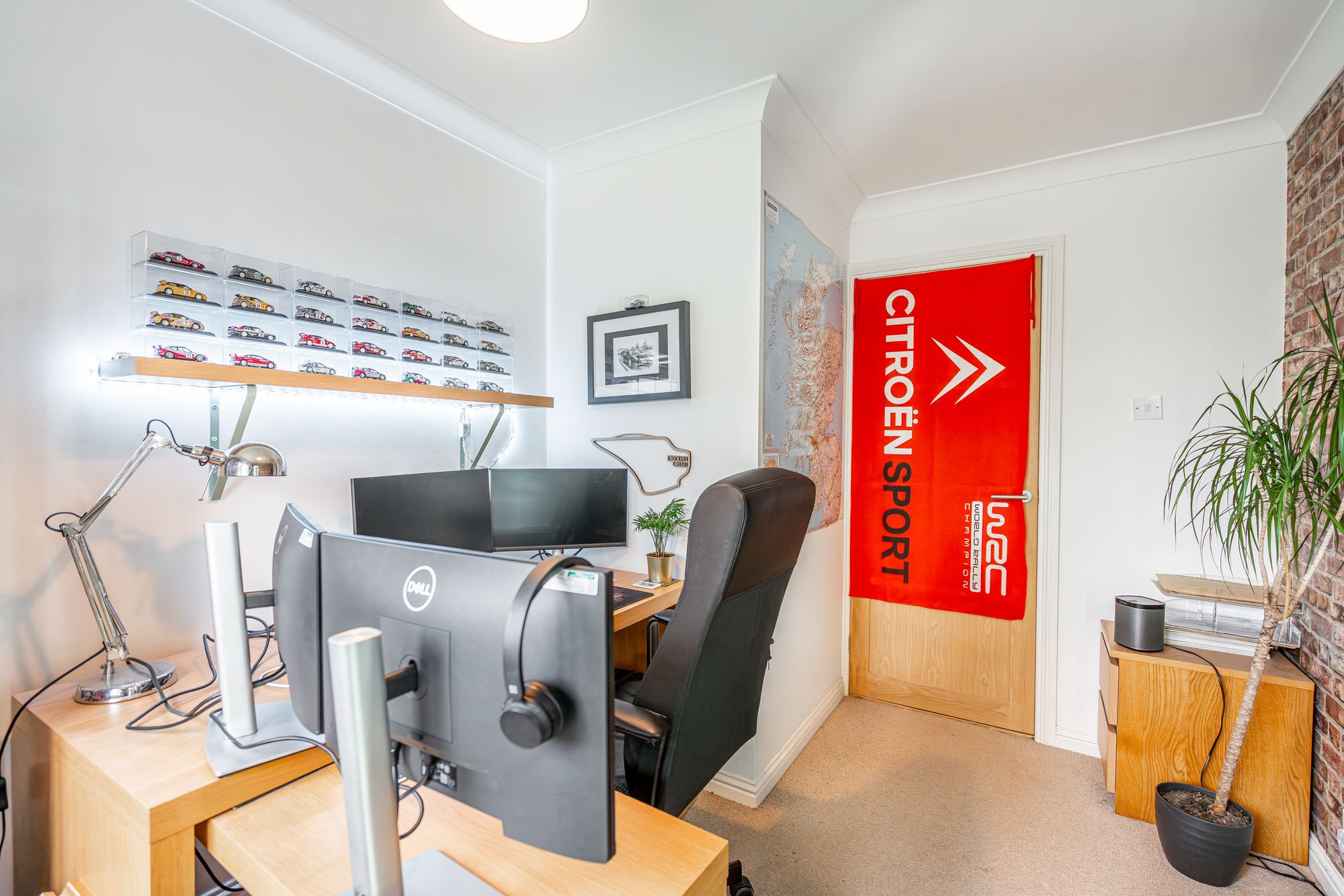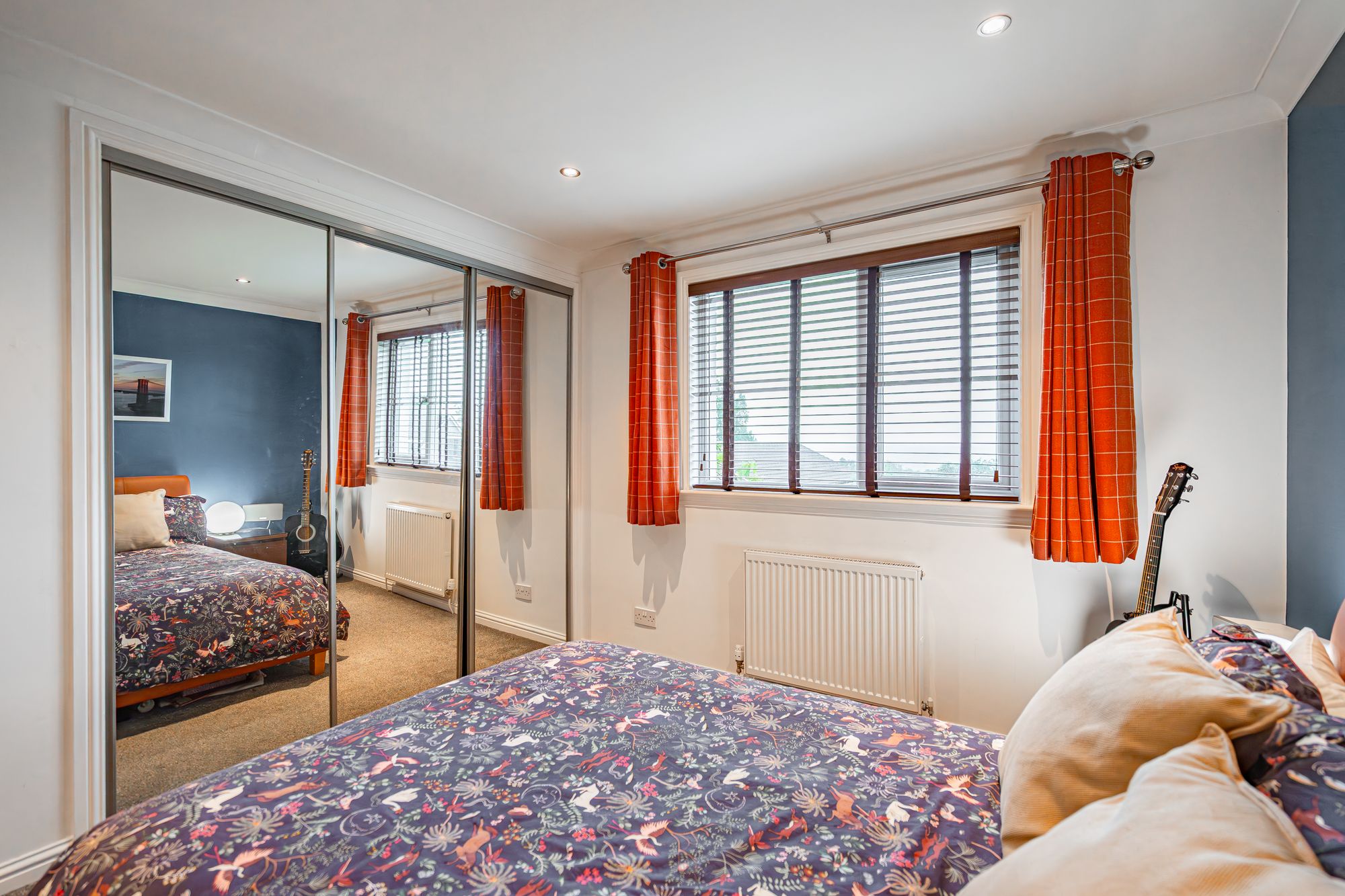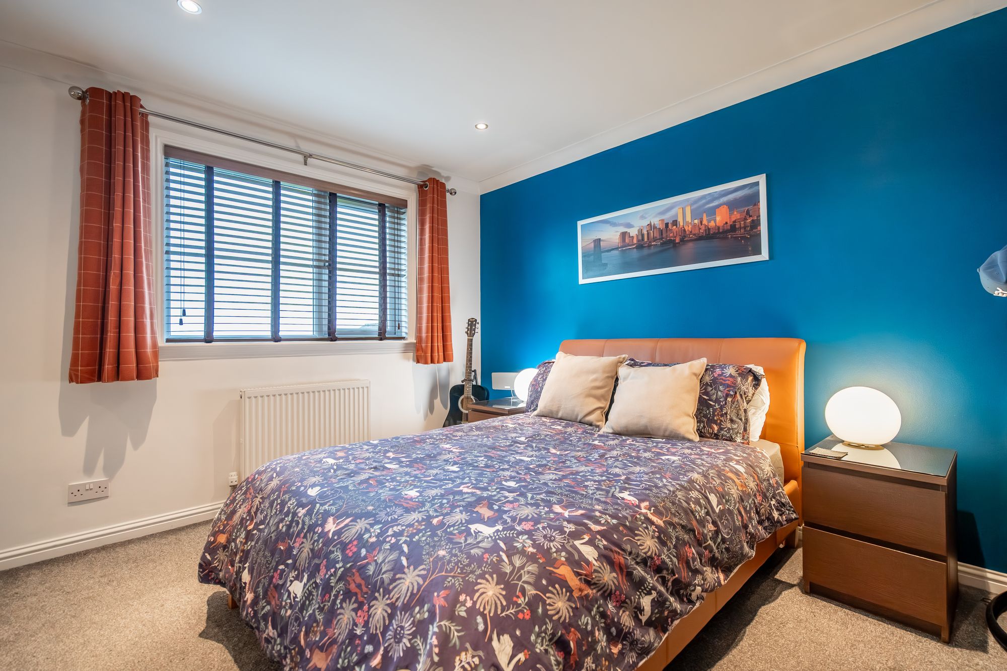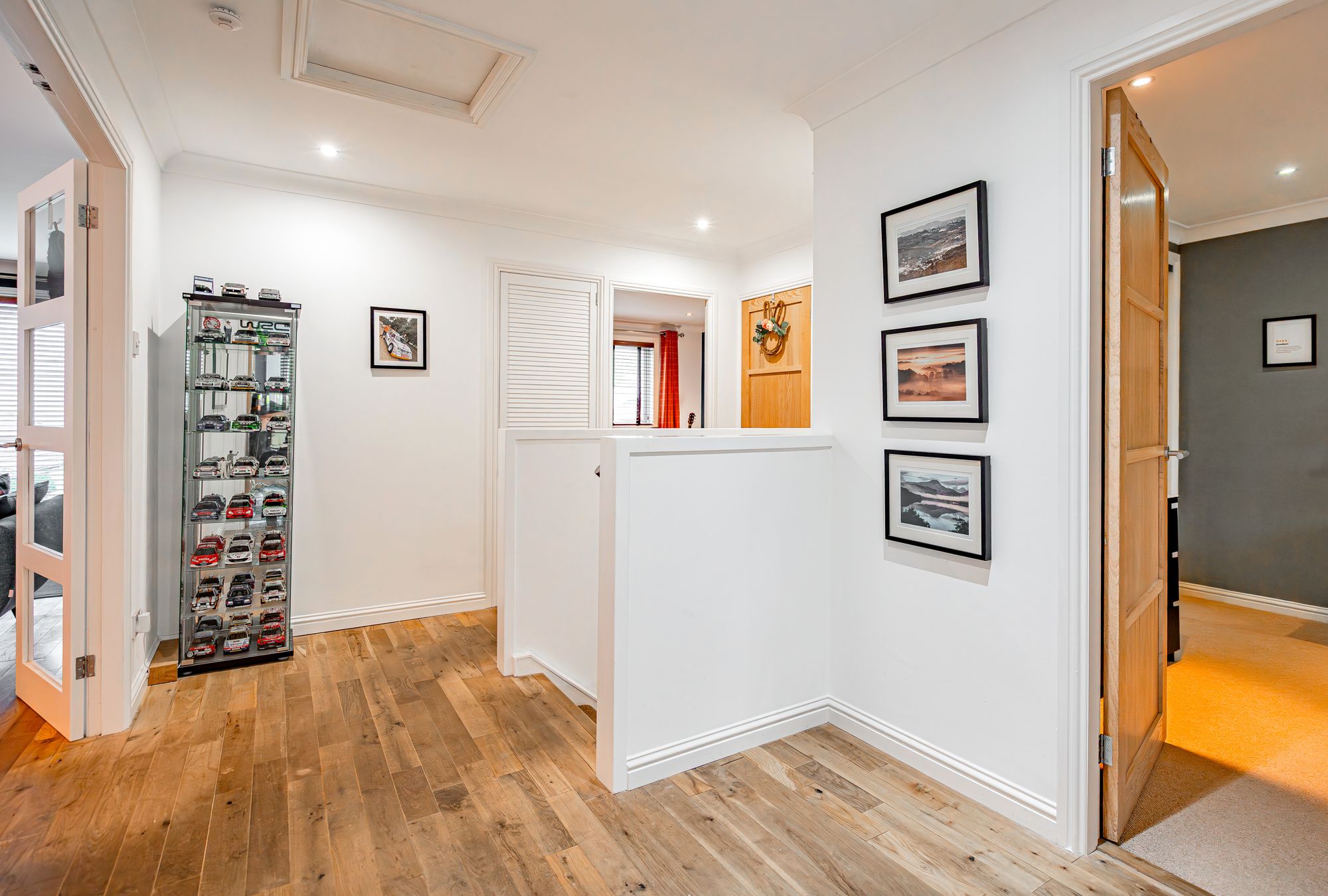 The property also benefits from a single integral garage, accessible both from the hall and via an external electric roller door. Private garden grounds surround the home, enclosed by brick walls and timber fencing to ensure privacy while offering outdoor space for relaxation. The garden includes a decked area, ideal for outdoor dining, as well as a well-maintained grass lawn providing ample space for recreation. Off-street parking is available on the driveway in front of the garage, adding further convenience.